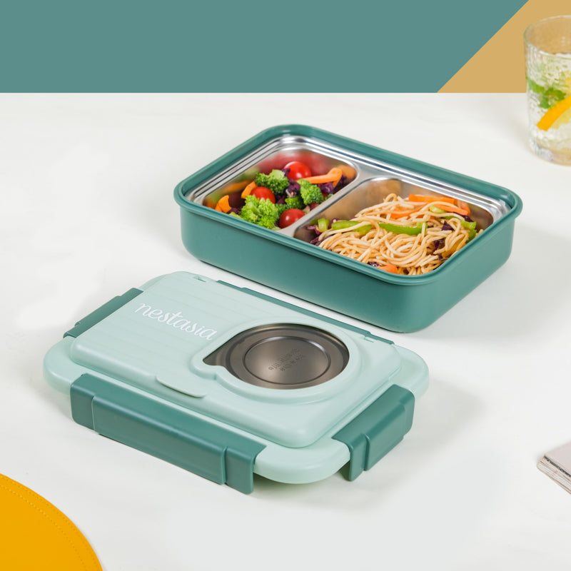 The lunch box's high-quality features guarantee a pleasant lunchtime experience. Your health and safety are prioritised by the tiffin box's food-safe, BPA-free materials, and the use of 304-grade stainless steel ensures superior quality. This lunch box's superior water insulation will keep your food deliciously warm. You can organise your food with the two different compartments, and you can keep it safe and secure with the clip locks on all four sides. The small bowl with lid increases versatility, and the removable silicone gasket makes cleanup simple. You can travel light because of its durable yet compact construction. Enjoy every mouthful by enhancing your lunchtime with this lovely lunch box.