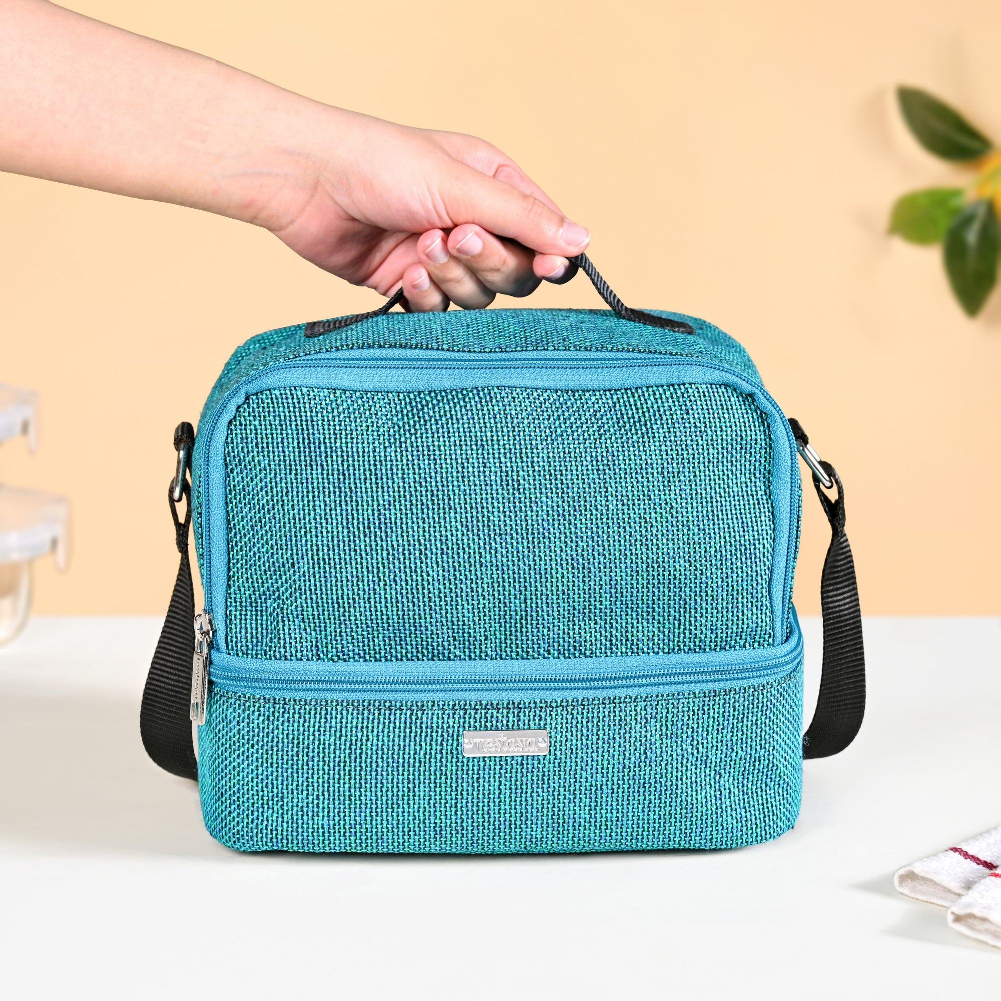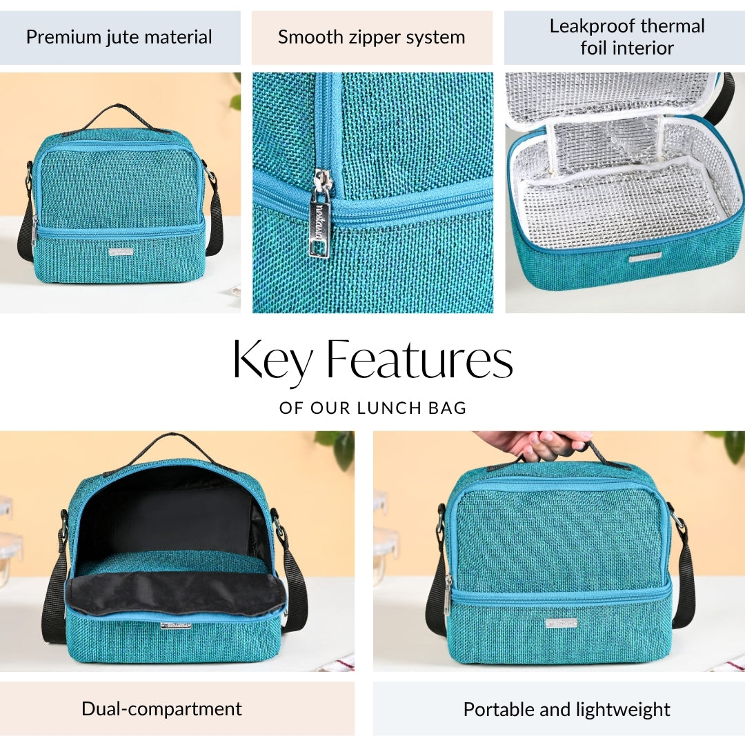 Design: Crafted from eco-friendly teal jute, this insulated lunch bag offers a perfect blend of style and practicality. The textured fabric exterior gives it a natural, modern appeal, while its rectangular shape provides spacious storage. It features two compartments of jute & polyester lining for versatility, along with a zip closure for a seamless experience. The lunch bag also comes with a sturdy top handle and an adjustable shoulder strap that adds to the overall aesthetic.
