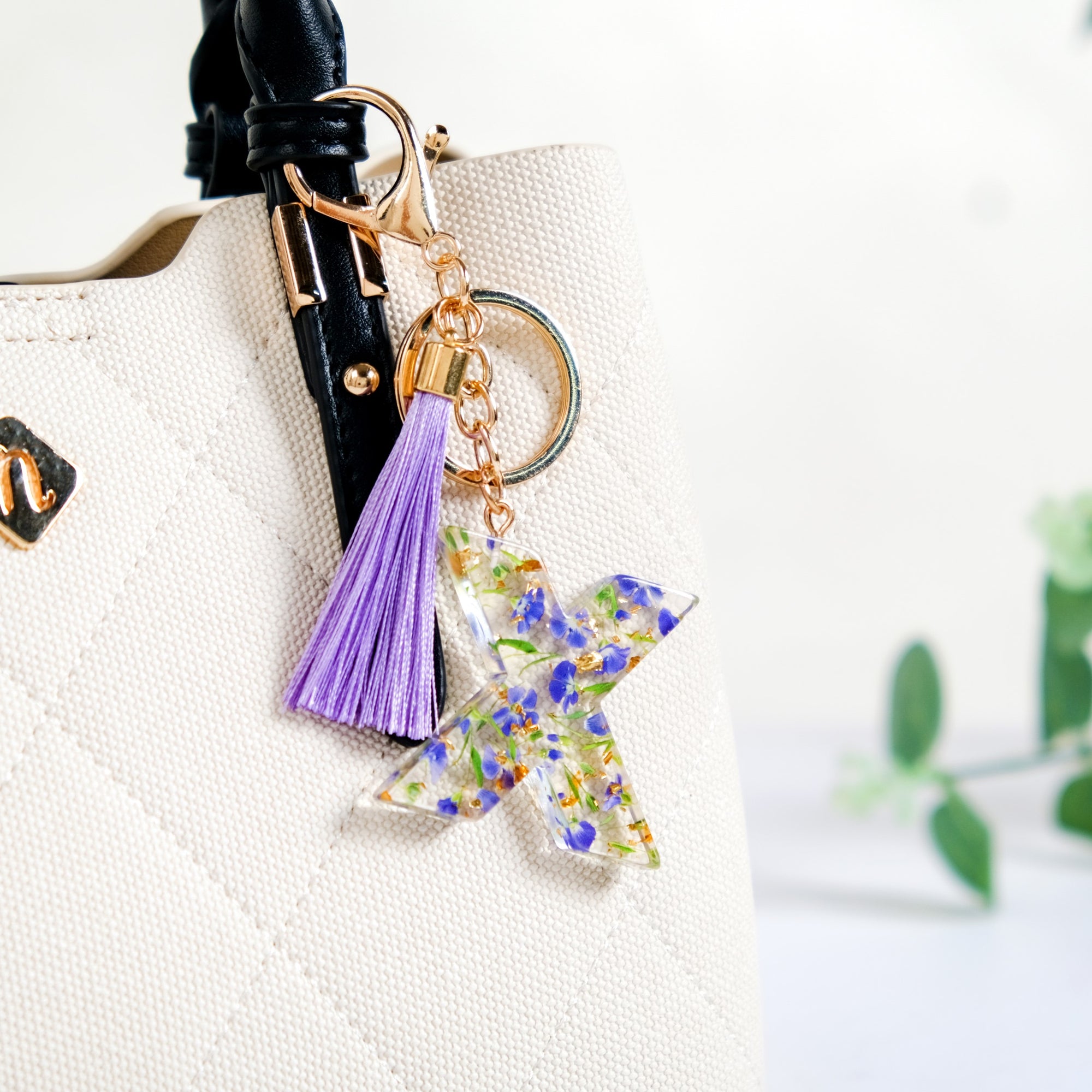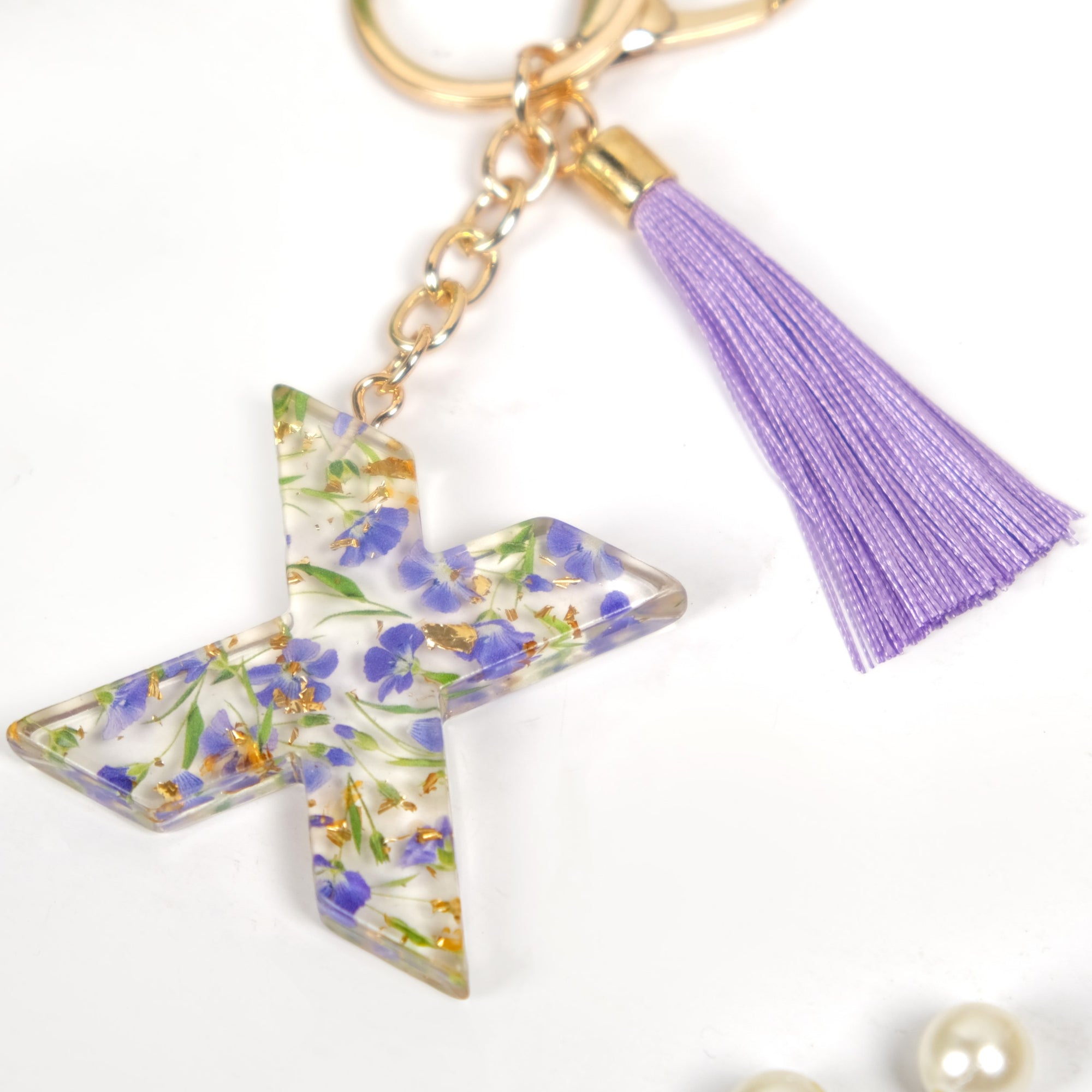Embrace elegance with the "X" pressed flower resin keyring, a refined accessory that brings timeless beauty to your everyday essentials. Encased in transparent resin, the keyring showcases pressed lavender forget-me-not flowers with sparkling golden flecks, making it a unique and eye-catching piece.