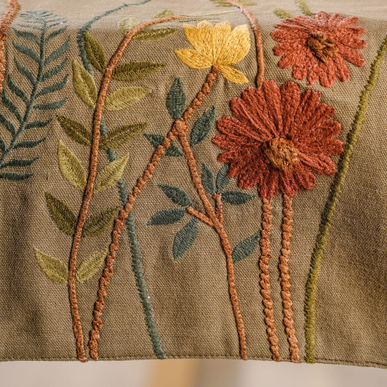 Design: Intricate floral embroidery adorns the dining table runner, showcasing a lively flower garden in earthy tones. Daisies, tulips, and various other flowers are beautifully stitched, creating a vibrant and elegant display. A smooth concealed zipper at the bottom ensures a refined, seamless finish.