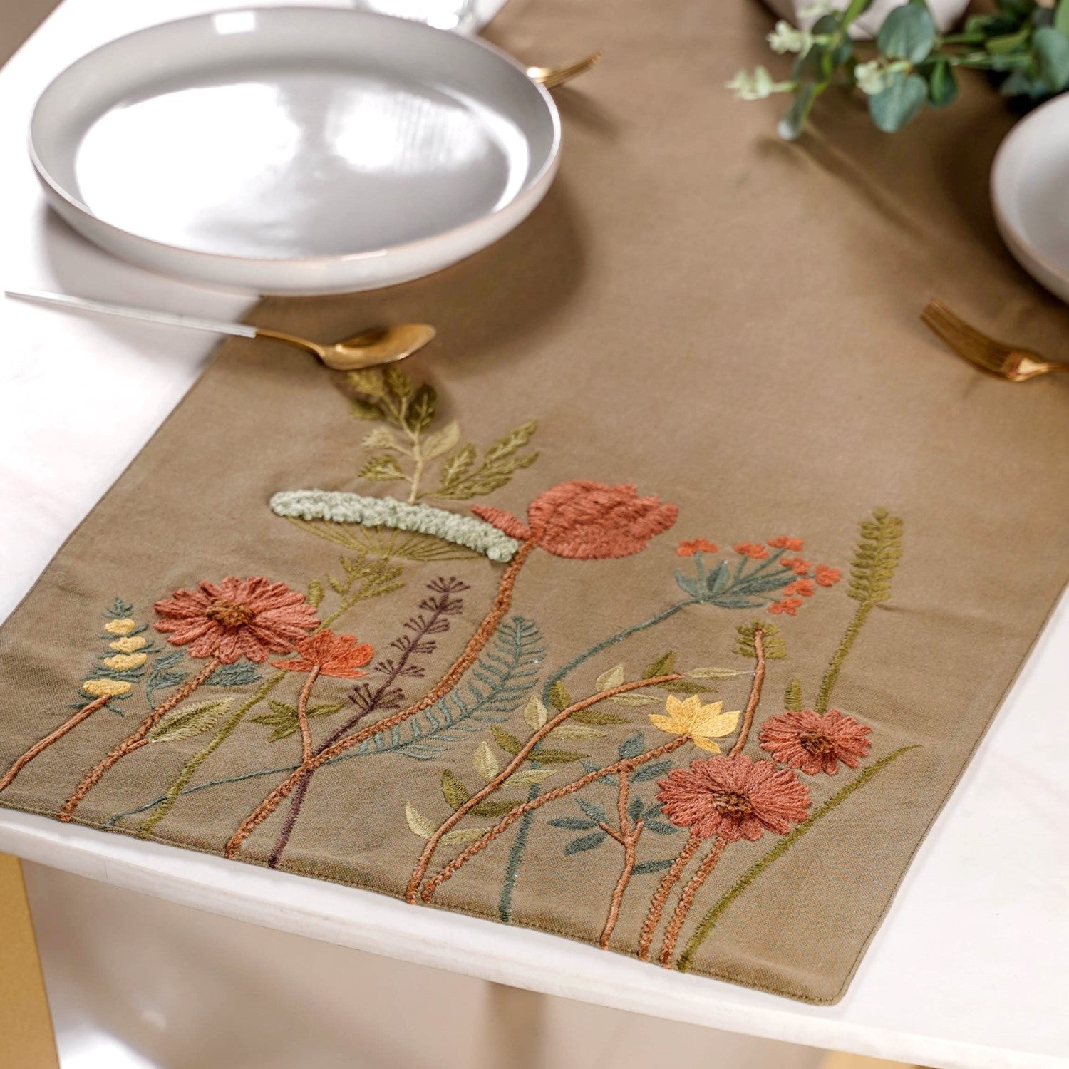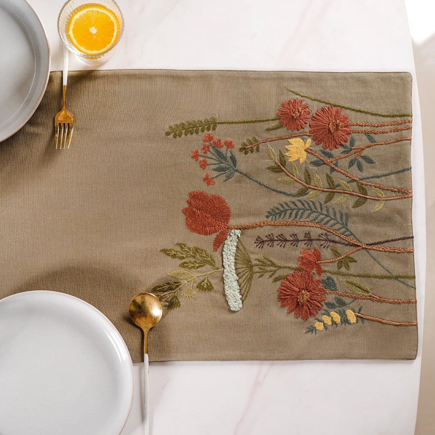 Bring nature's charm to your dining table with a table runner featuring intricate floral embroidery. Crafted from 100% canvas cotton fabric, it introduces an earthy, vibrant feel to your dining space.