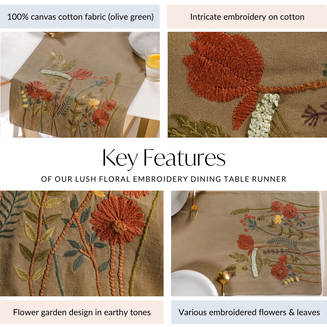 Benefits: Made from 100% canvas cotton, the fabric is durable and offers a soft, smooth texture. The quality cotton ensures lasting use, while the detailed embroidery adds an artistic touch, elevating the runner as a distinctive addition to your home.