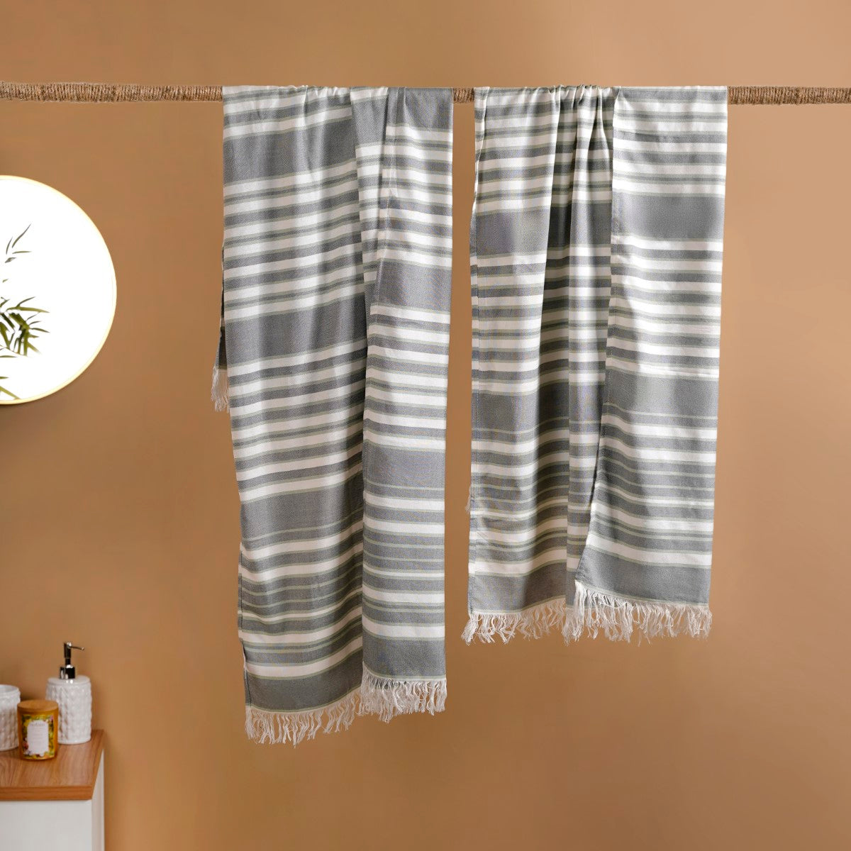 Crafted in subtle tones of white, basil, and grey, the Turkish bamboo towels are not only ultra-soft but also have quick-dry properties. With each wash, the towels will start getting more absorbent. One can even use these soft towels for baby care. The bamboo fibre towels are super absorbent and are suitable for both home and travel purposes. The Turkish towels have triple absorbency compared to regular cotton towels. The bamboo fibre towels stand out due to their exquisite design and multi-colour pastel shades, along with the aesthetic striped patterns. The striped design lends an appealing touch to a minimal and modern bathroom. The Turkish towels become softer after washing. One should not use bleach at any stage of the washing or drying process of the towels.