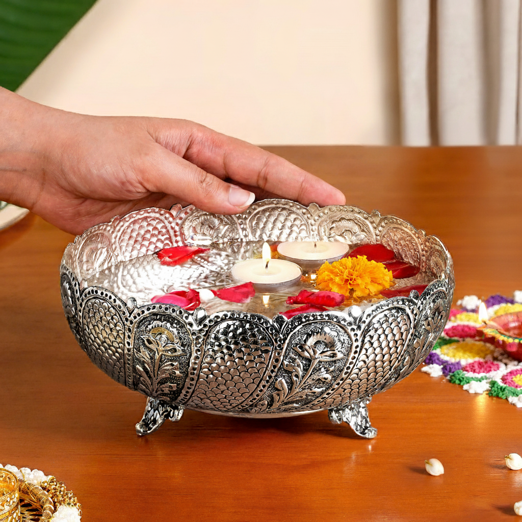 Benefits: The silver-plated brass structure is durable, easy to clean and built to last. Its circular form is perfect for floating candles, flower arrangements, or festive décor elements, keeping them safely contained in one place. The handcrafted detailing enriches ceremonies and adds devotional ambience to prayer rituals.
