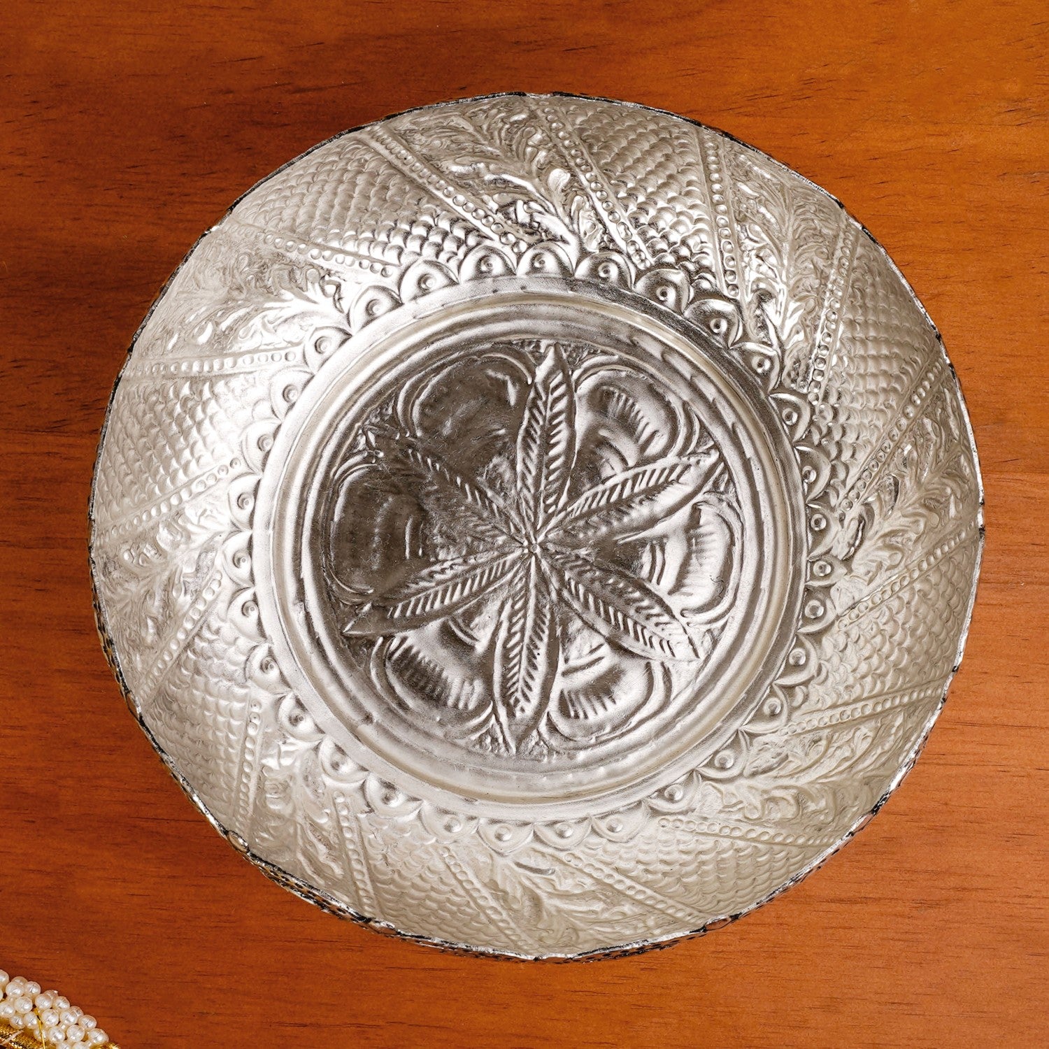 Design: This silver-polished urli is crafted in a circular deep bowl shape that combines strength with artistry. The outer surface displays intricate floral engravings paired with an embossed fish scale pattern that enhances its textured appeal. A scalloped rim gives the piece refined detail while ornamental pedestal legs offer stability. Carved motifs highlight its traditional charm and the sturdy medium weight metal body ensures durability. Compact and balanced in size, it makes an impressive centrepiece on tabletops.