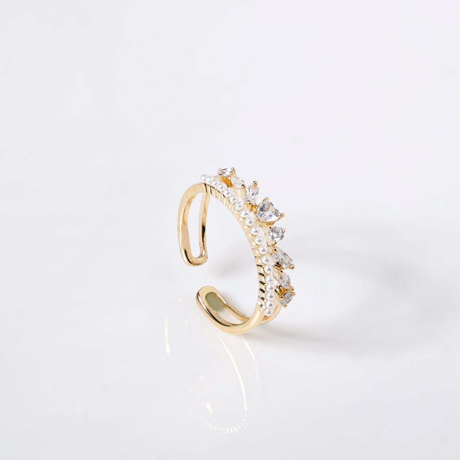 Combining glamour and sophistication, this elegant gold-toned adjustable ring features a stunning double-band design. One band is adorned with an exquisite mix of baguette-cut, marquis-cut, round-cut, and heart-shaped stones, creating a dazzling display of light and colour. The other band is beautifully embellished with a string of small lustrous white pearls, adding a touch of timeless grace. Inspired by the classic beauty of vintage jewellery, this ring seamlessly blends modern glamour with traditional charm, making it a perfect statement piece for any occasion.