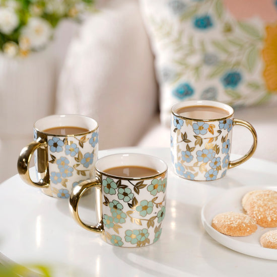 These ceramic cups are exceptionally suitable as a gift due to their unique blend of artistry, functionality, and elegance. Each cup in this set is a work of art, featuring intricate blue floral motifs and delicate golden leaves. The level of detail and craftsmanship involved in their design makes them a truly exceptional and visually stunning gift. The addition of a golden rim and a sturdy C-shaped handle lends these cups a touch of luxury. They exude sophistication and opulence, making them a standout choice for a memorable gift.