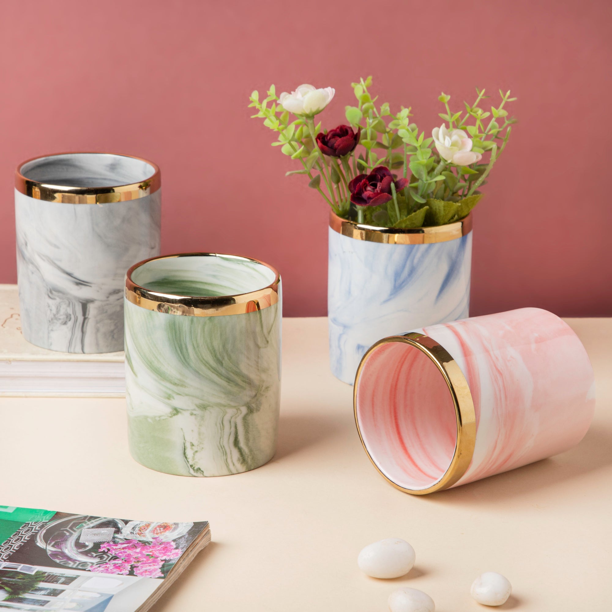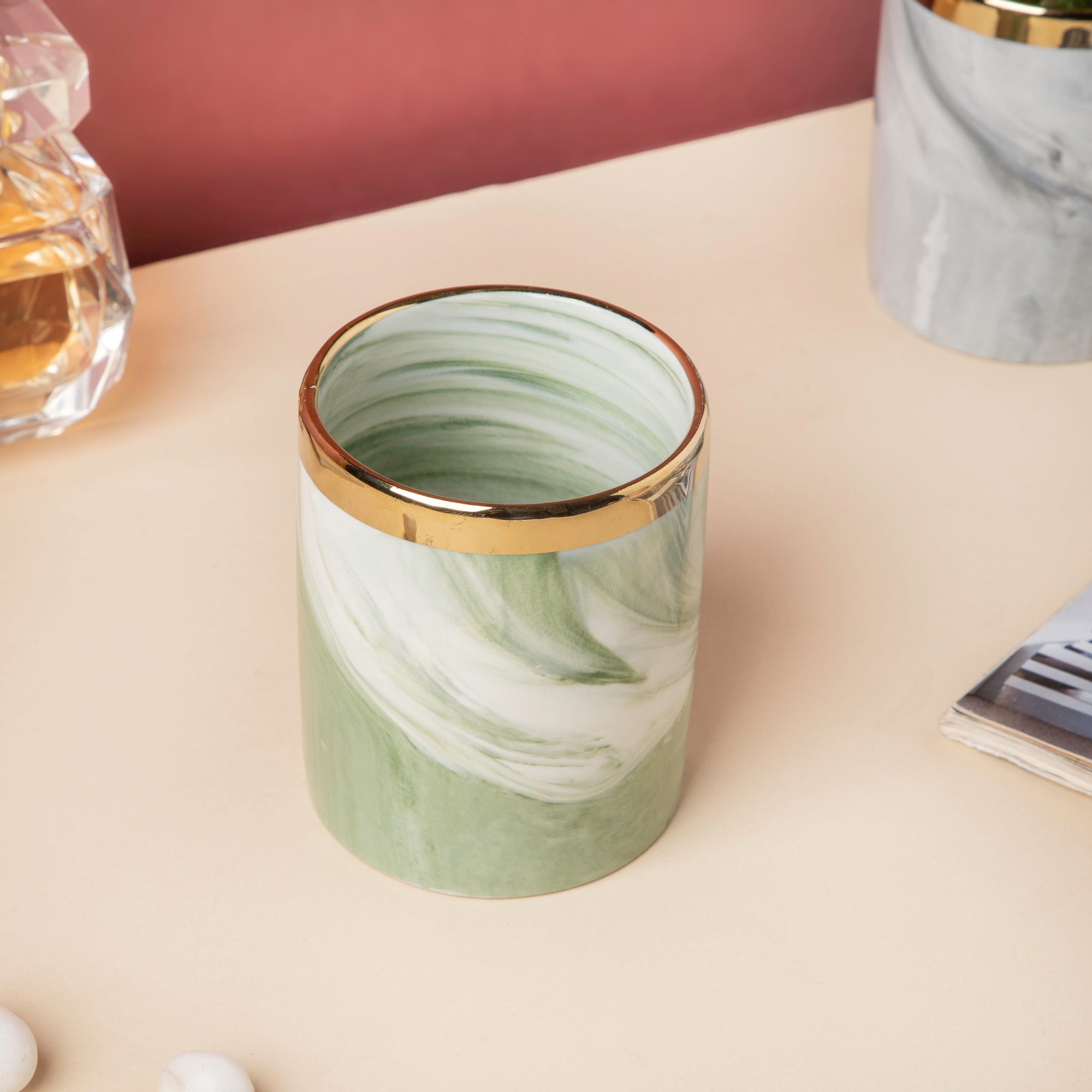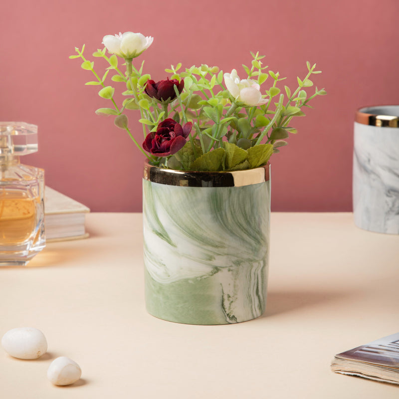 The ceramic holder features a white and green marble patterned surface and a lustrous gold rim that enhances the design of the tumbler. The luxurious look and fine design of the organiser speak volumes of the fine craftsmanship behind the building of the planter. The green and white patterned planter makes the perfect home to house one's green babies and welcome the beauty that the greens provide, into their homes.