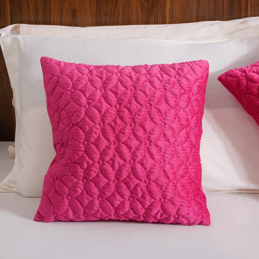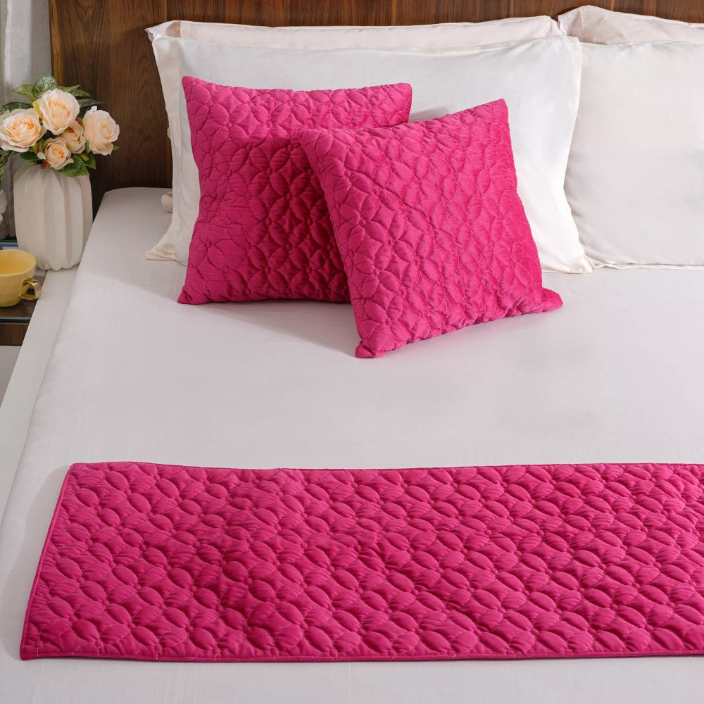 Upgrade your home decor with Nestasia's set of 2 velvet cushion covers and 1 bed runner, and experience the comfort and elegance that the premium set provides. Featuring a vibrant magenta shade, the runner and cushion covers add a pop of colour to the home decoration. These items are stitched with attention to detail and feature intricate embroidered patterns adding both aesthetic value and immense durability. Made with soft velvet fabric, these cushion covers and runner are incredibly comfortable and perfect for adding a touch of luxury to your home decor. The quilted embroidered patterns make the set unique and eye-catching, resulting in a statement piece to elevate any room. The cushion covers feature smooth zipper enclosures, making it easy to remove and wash them as needed. Whether you want to spruce up your bed or sofa, these multipurpose cushion covers are ideal. The runner is also multipurpose and can be used on your bed or dinner table, adding a touch of sophistication to any setting.
