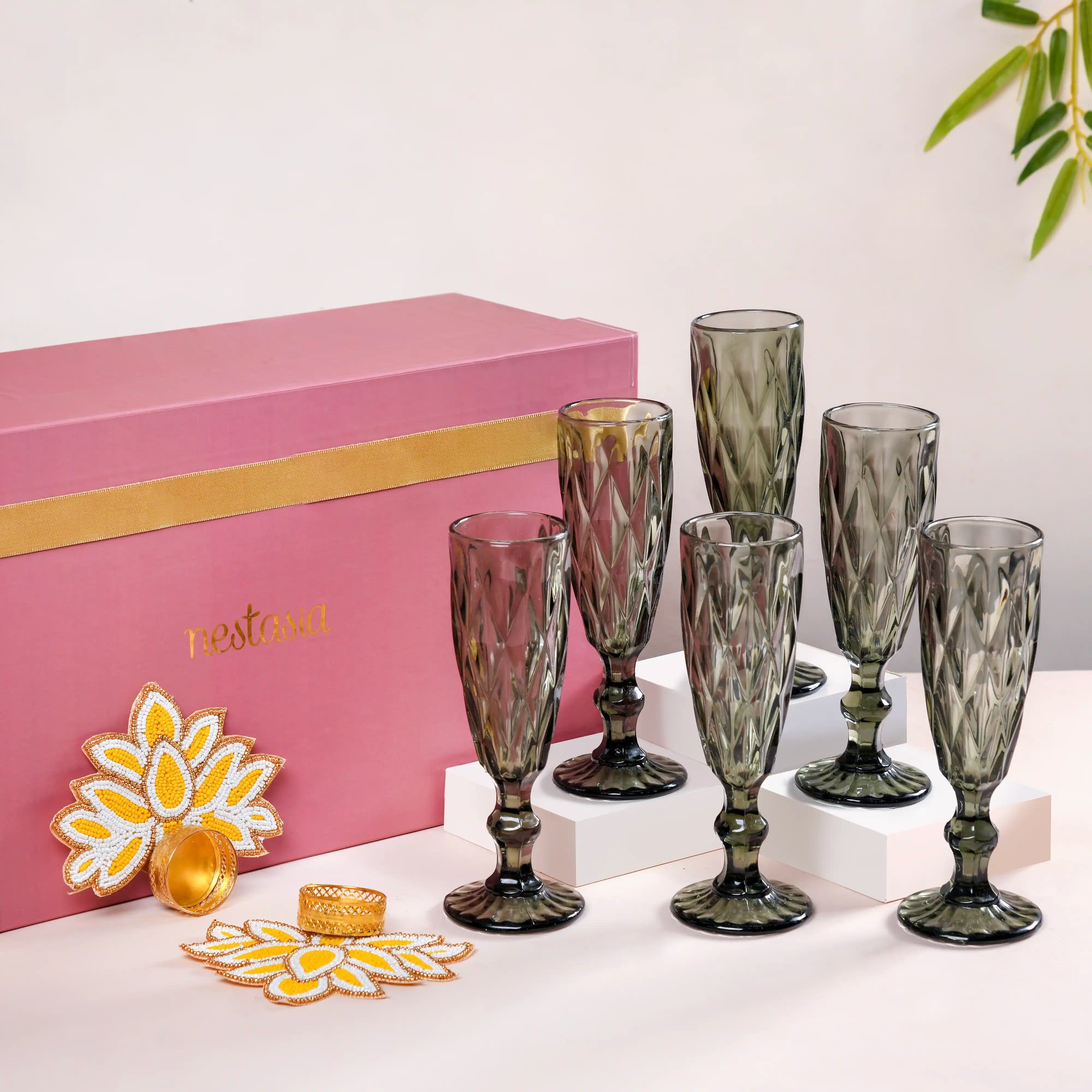 The grey champagne glasses have been expertly crafted using lead-free crystal, which makes them more resilient compared to run-of-the-mill glassware available in the market. The sturdy construction makes them more resilient to mechanical damage, which may be incurred due to frequent knocks and clangs.