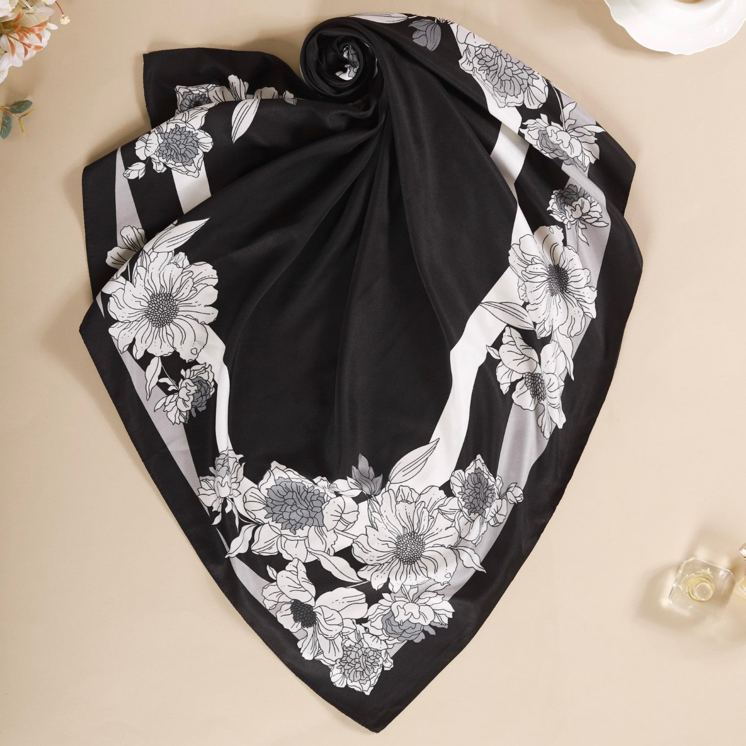 Absolutely! The lightweight and breathable fabric of the black and white border pattern floral square scarf makes it a versatile accessory that can be worn in various seasons. While it's perfect for summer and fall, you can also use it as a wrap or an extra layer in spring. The classic black-and-white design is timeless and transcends seasonal trends, allowing you to incorporate it into your year-round wardrobe.