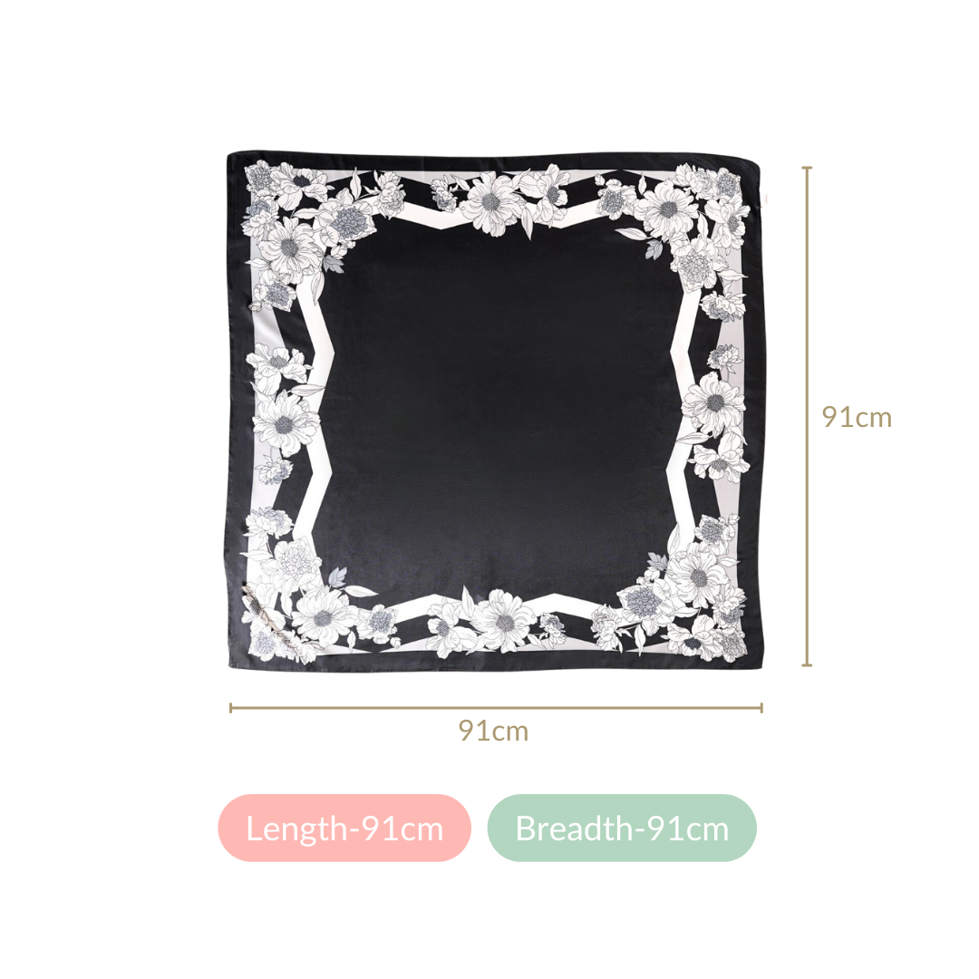 This versatile scarf can be worn for a variety of occasions. The combination of the elegant black and white color scheme, floral patterns, and grey borders gives it a timeless and classic appeal. You can drape it around your shoulders for a formal event, wear it as a beach cover-up, or even use it as a cozy fall wrap when the weather turns cooler. Whether you're attending a wedding, going to the office, or simply running errands, this scarf complements your style with chic elegance.
