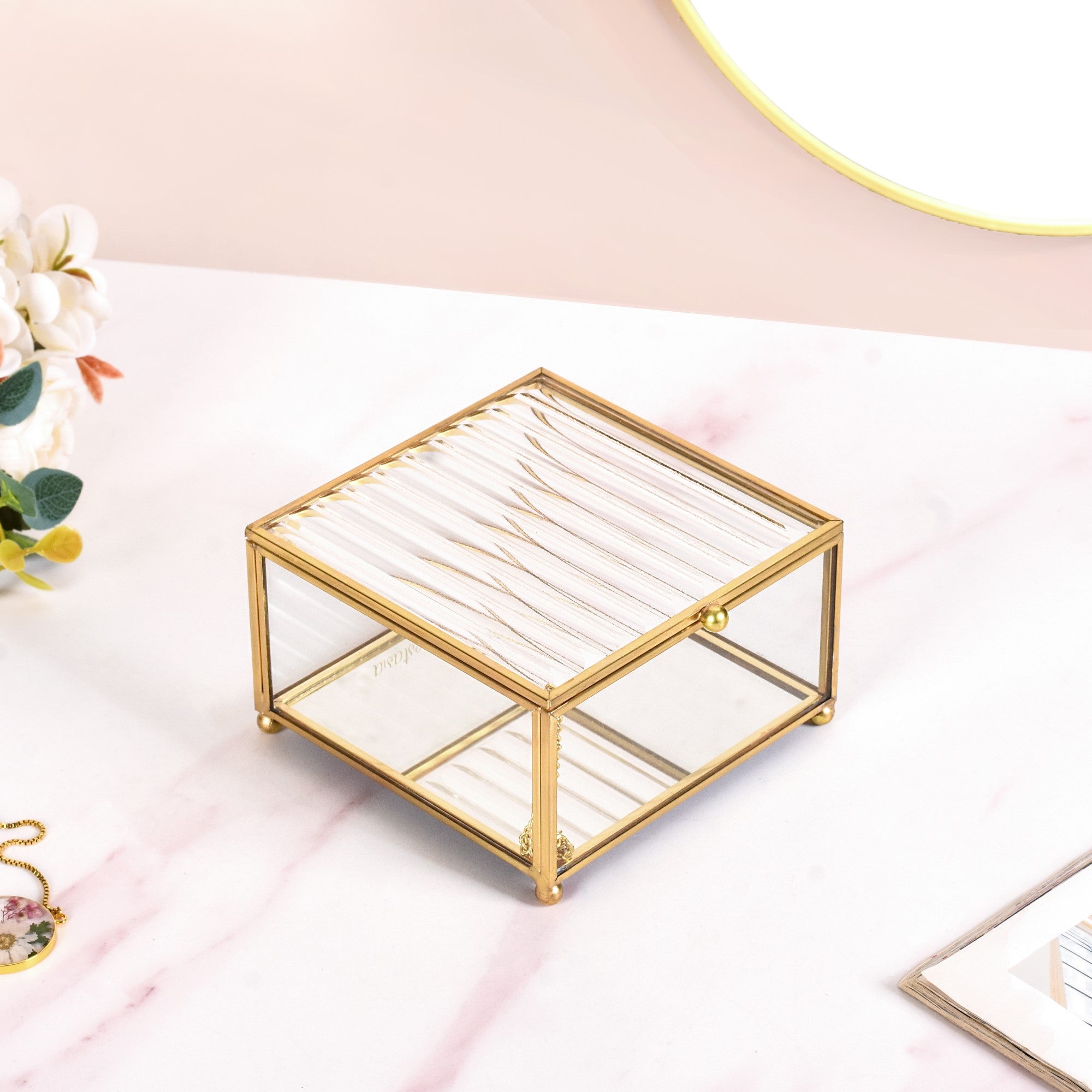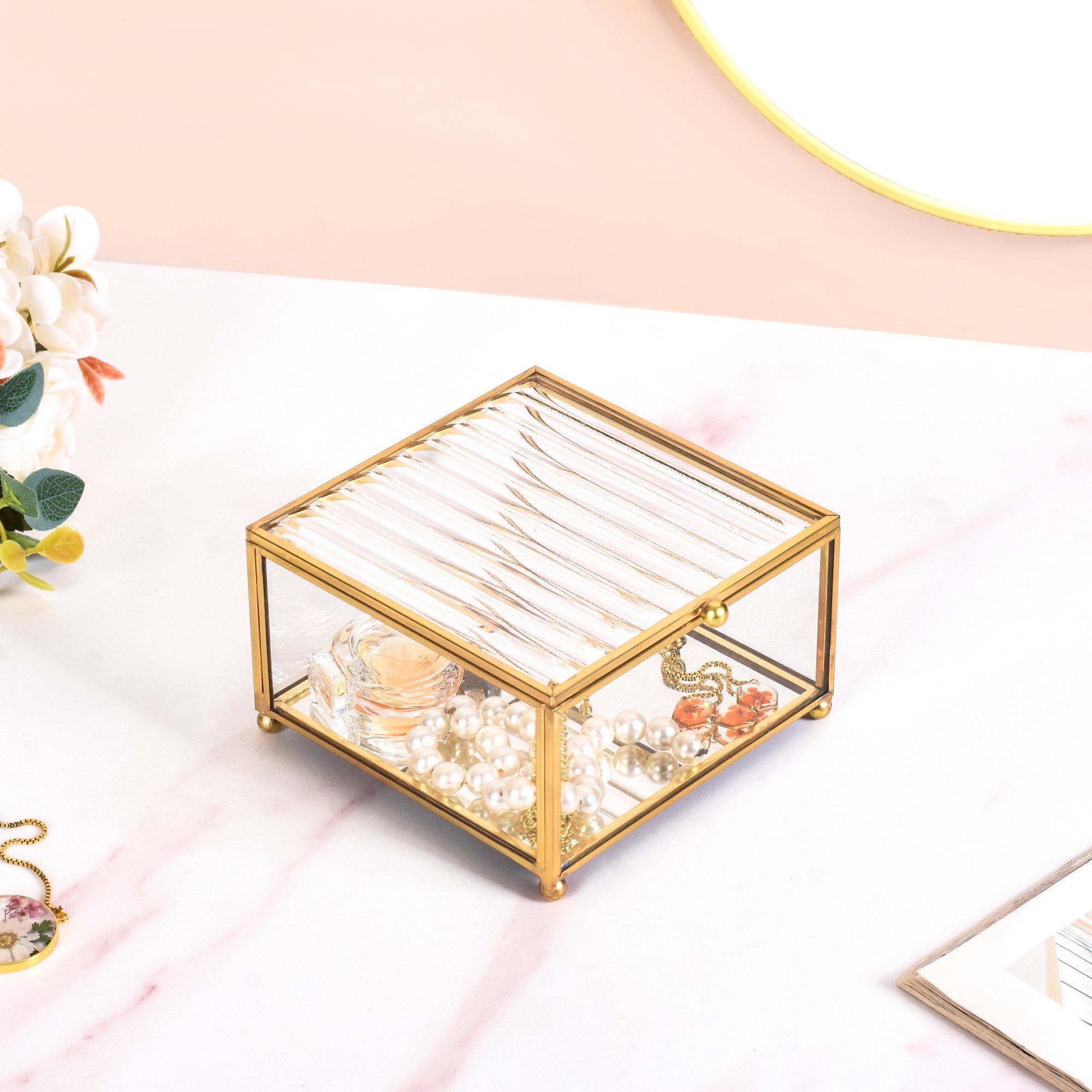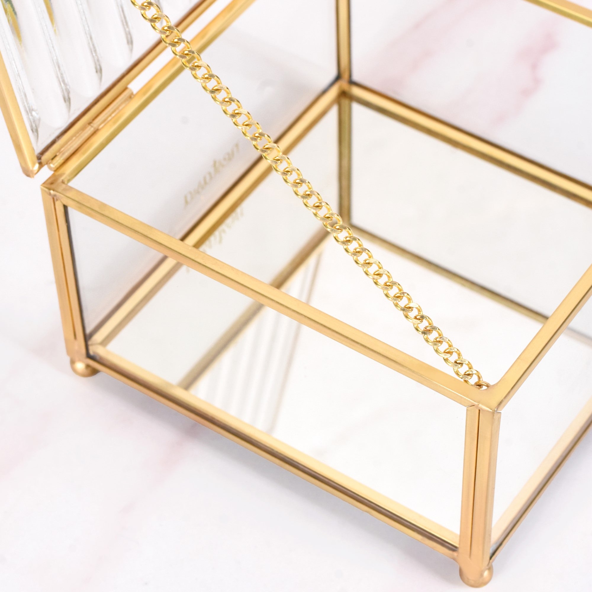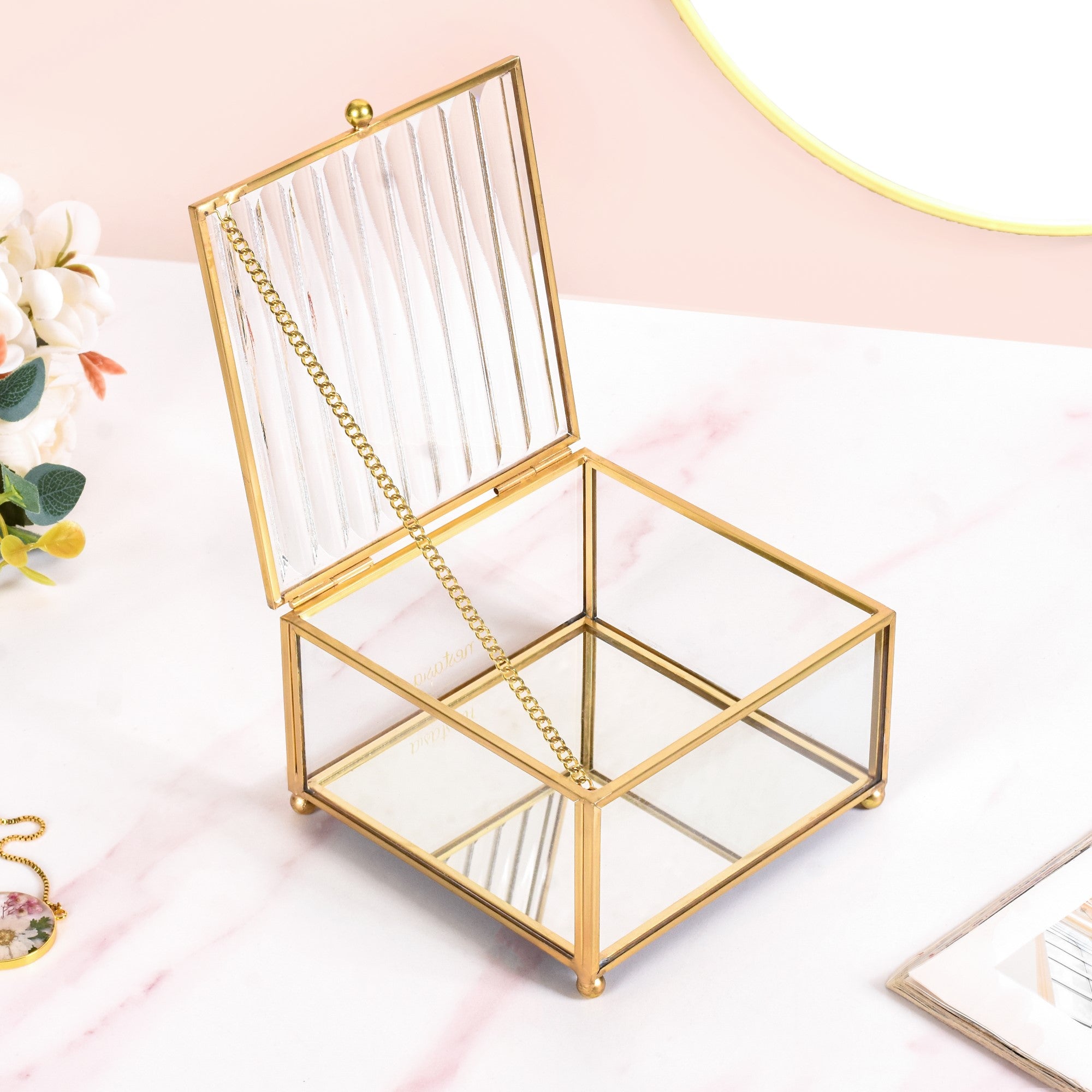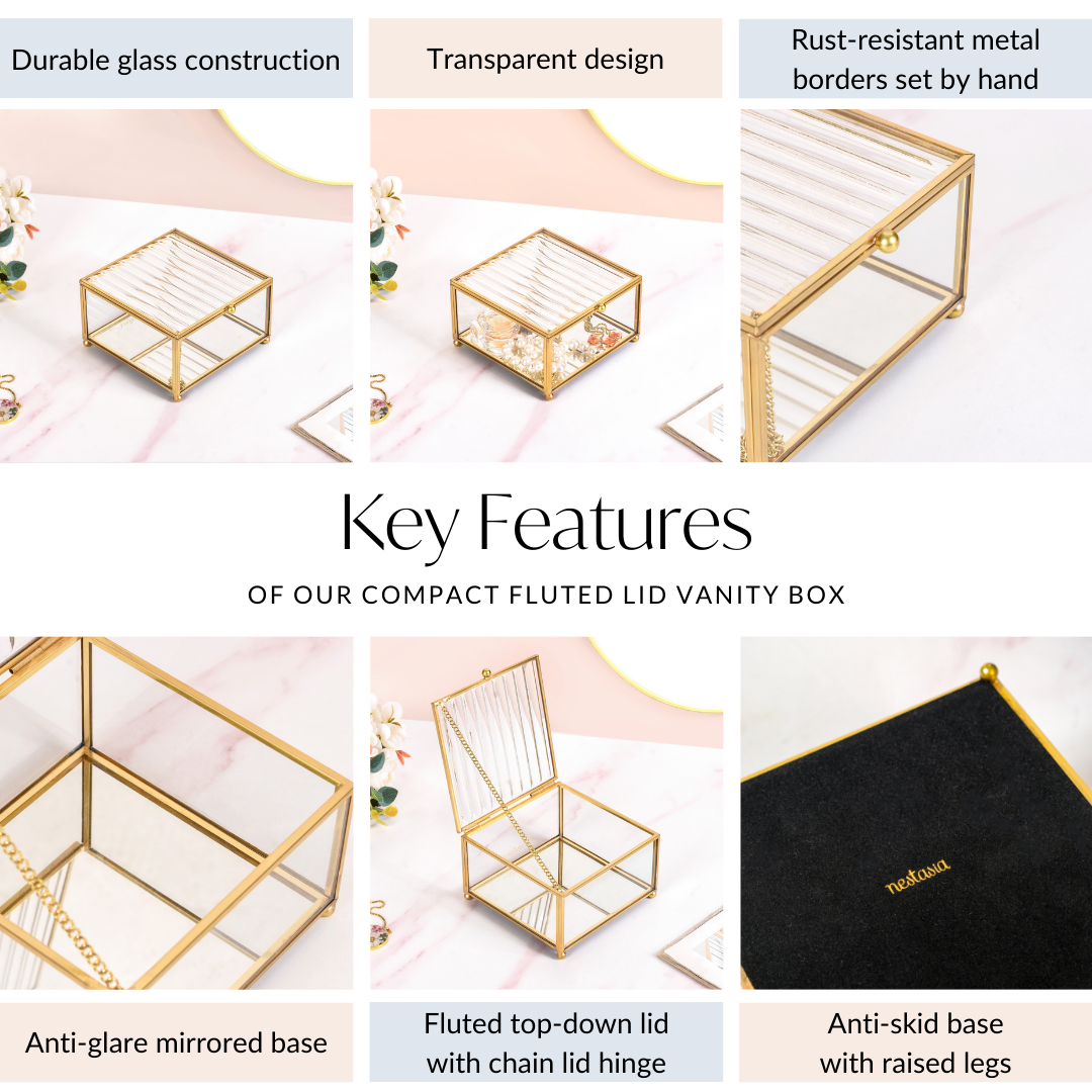 Design: The square-shaped jewellery case features a transparent tempered glass body with golden metal borders that are framed by hand. Bearing a fluted top-down lid for an artistic flair and an anti-glare mirrored base, the vanity box is a must-have for all the divas out there! The opulent gold link-chain lid hinge supports the lid when opened, while the anti-skid base and raised legs provide extra structural support.