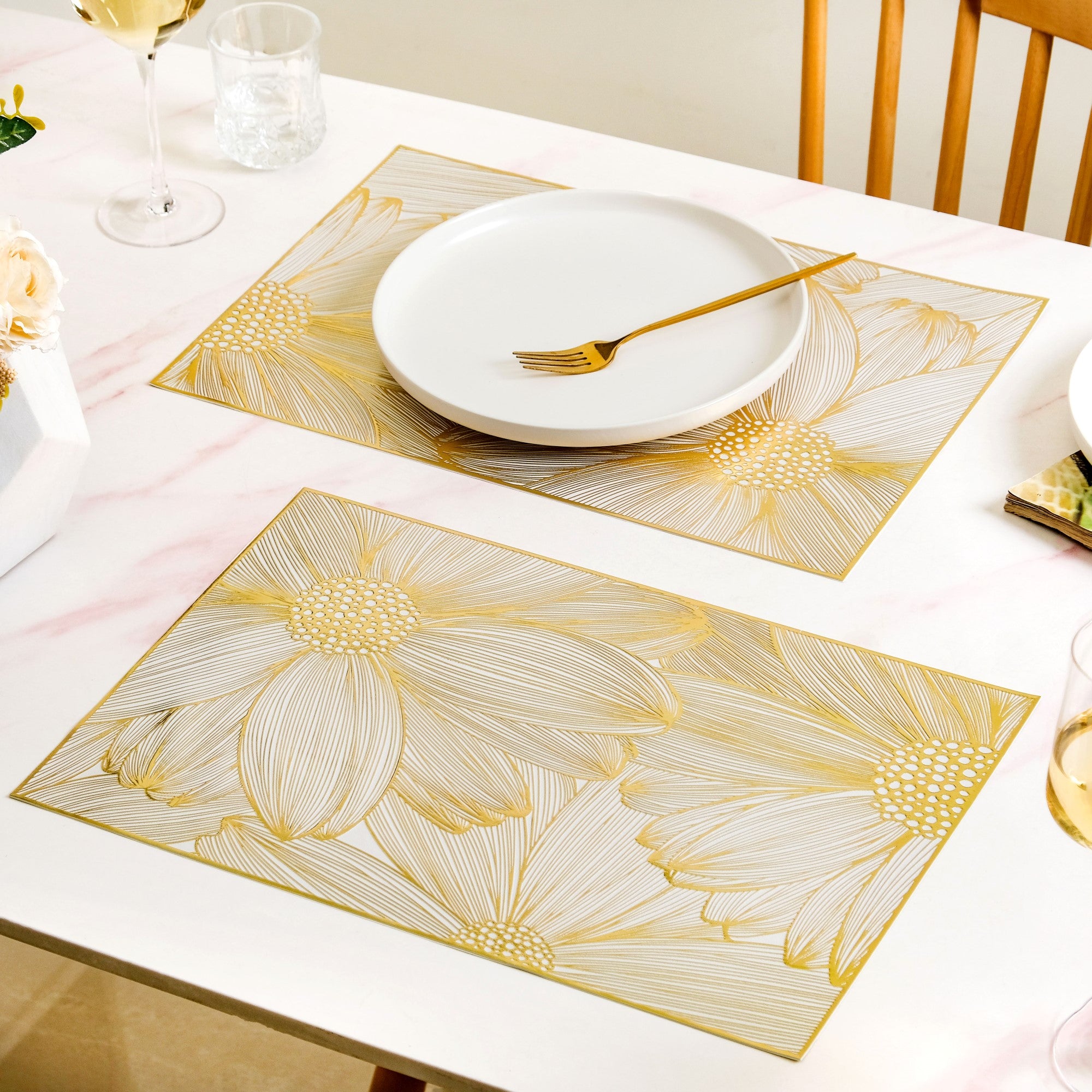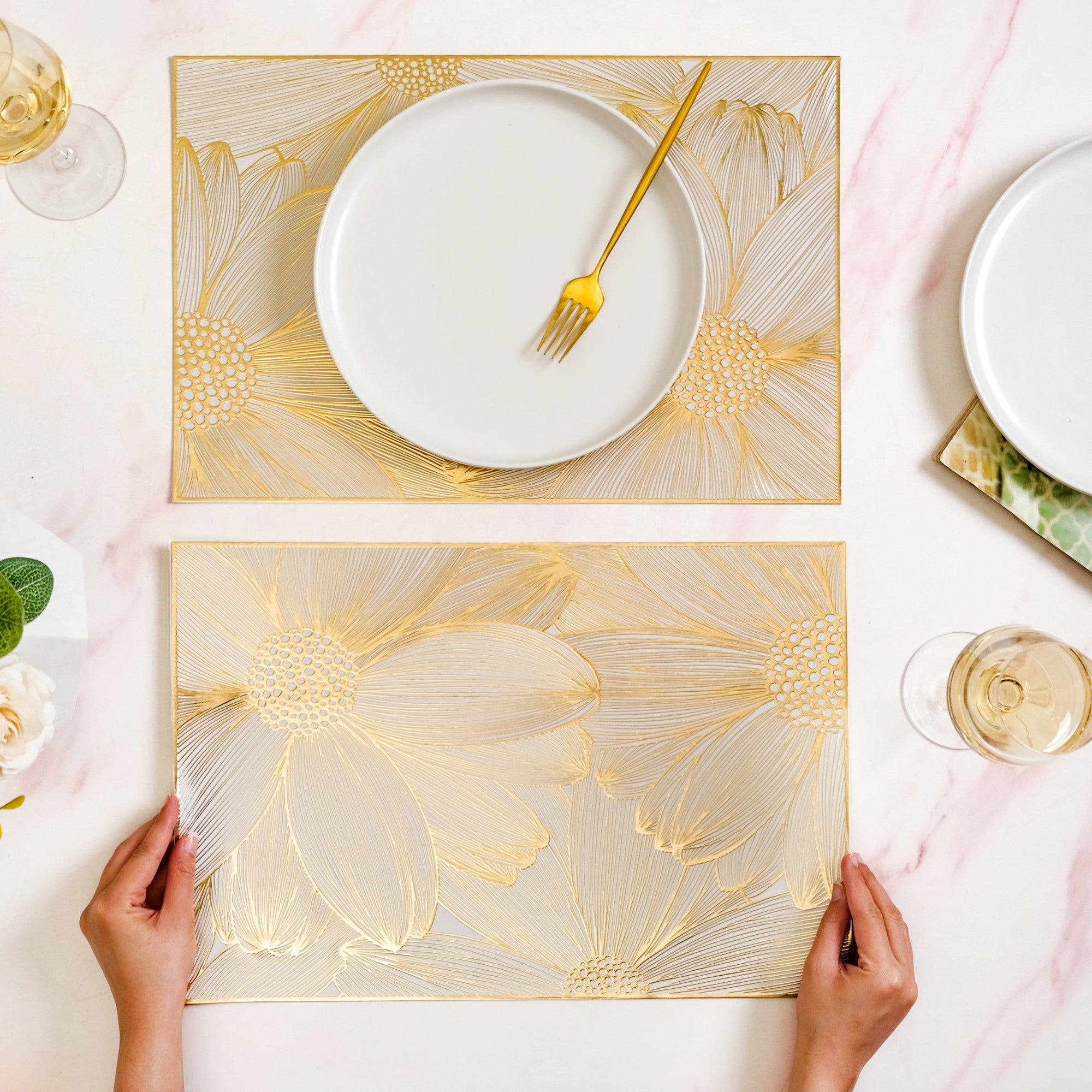 Design: These mats blend bold design with utility, making them perfect for both festive settings and casual meals. Whether you're entertaining guests or enjoying a quiet dinner, their luxe presence never goes unnoticed. The design features oversized floral motifs outlined with metallic gold detailing on a translucent base. Fine lines mimic delicate petals, while circular textures add depth and dimension. The shimmering gold against a neutral backdrop ensures these mats stand out on any table.