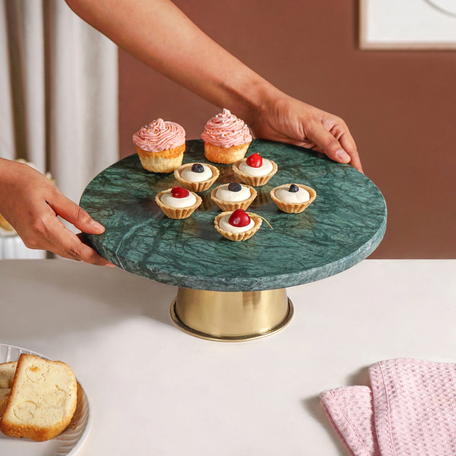 Design: This dark green marble and gold cake stand features a dramatic, perfectly circular dark green marble top, boasting unique natural veining that makes each piece a distinct work of art. Luxury meets elegance in this masterpiece, where a gleaming gold metal base meets an exquisite surface. The polished finish adds a touch of sophistication, making it a captivating centrepiece that beautifully highlights any red velvet or cheesecake, commanding attention at any occasion.