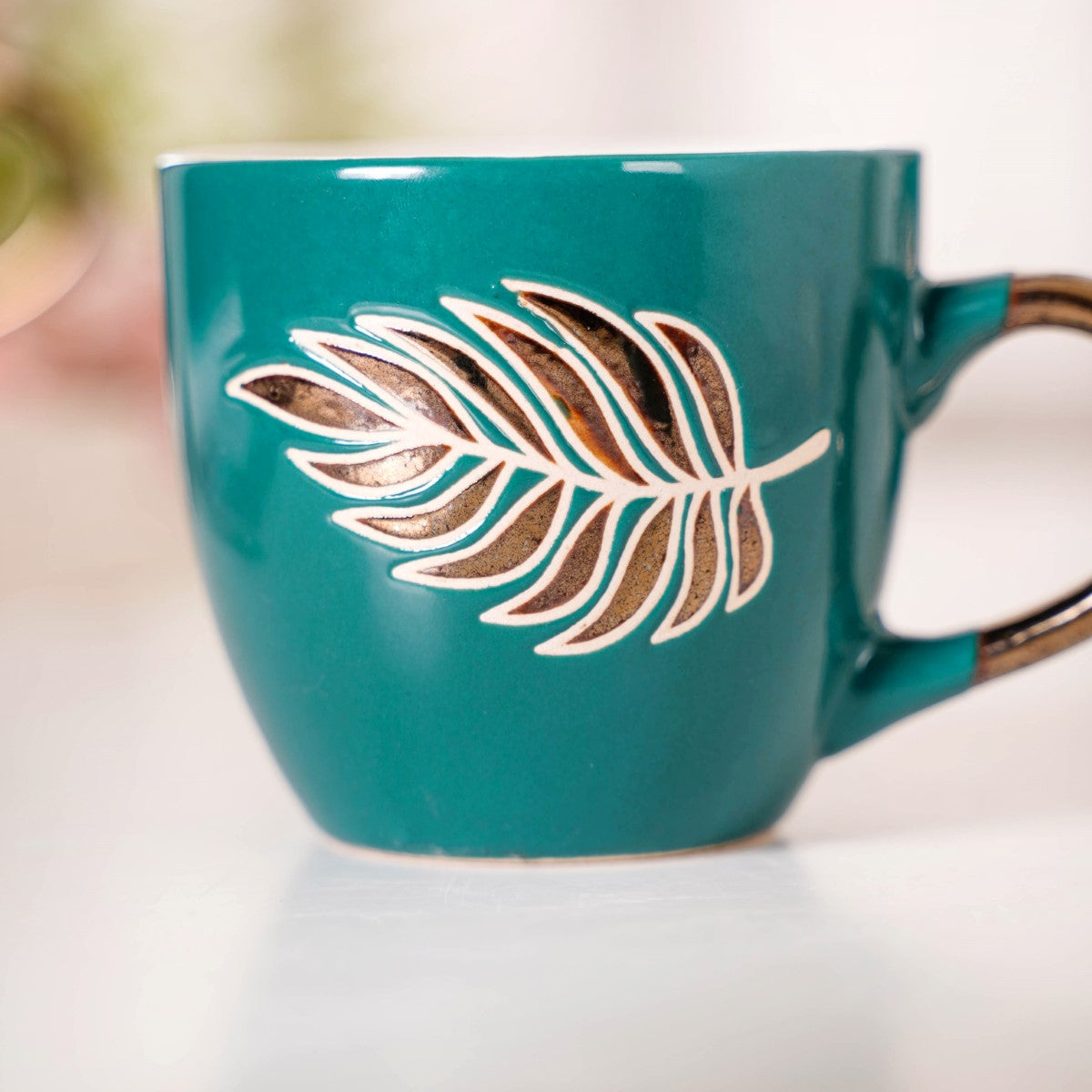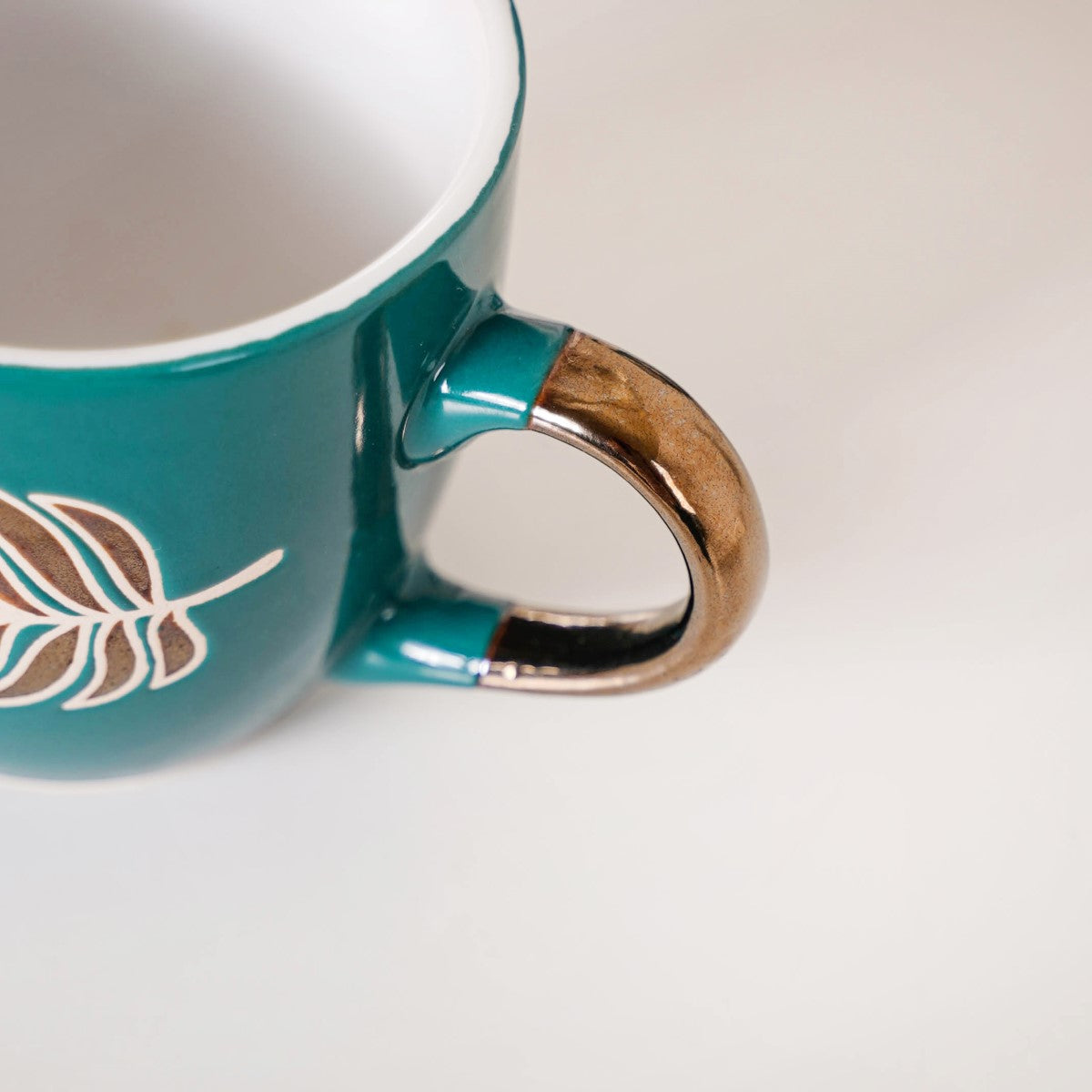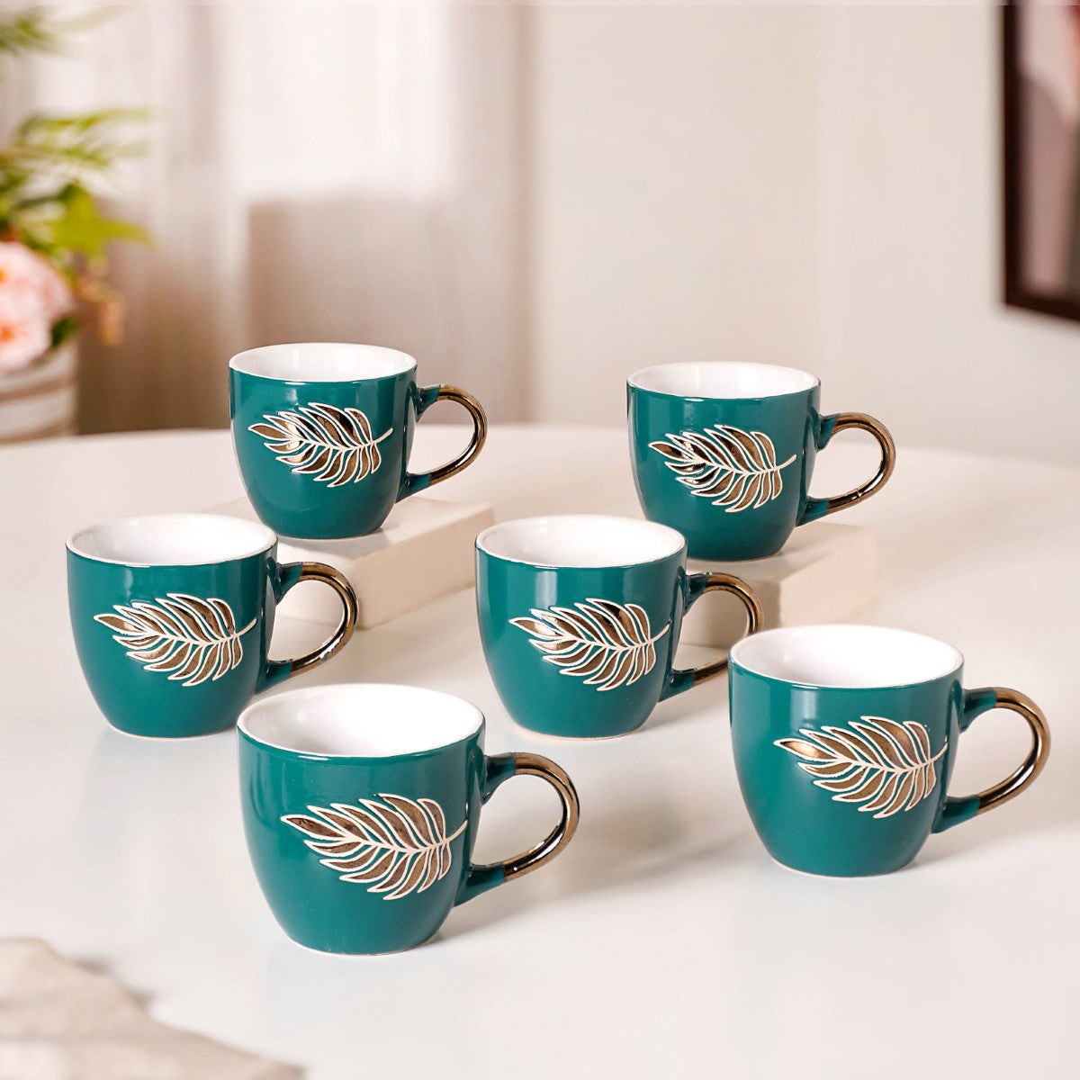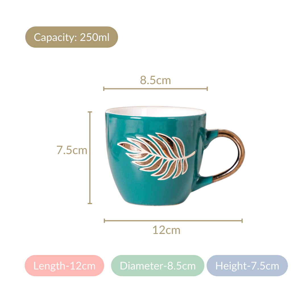 Elevate your daily coffee experience with our fern leaf pattern dark green coffee cups set of 6. These exceptional cups, meticulously crafted from top-tier ceramic, infuse your morning ritual with a touch of nature's elegance. Featuring a one-of-a-kind silk-screen printed fern leaf design, they seamlessly blend aesthetics and functionality. The cups are not just beautiful; they're built to last, with a chip-resistant construction. Their opulent metallic handles exude sophistication while ensuring a secure, slip-resistant grip, guaranteeing your cherished brew stays right where it belongs.