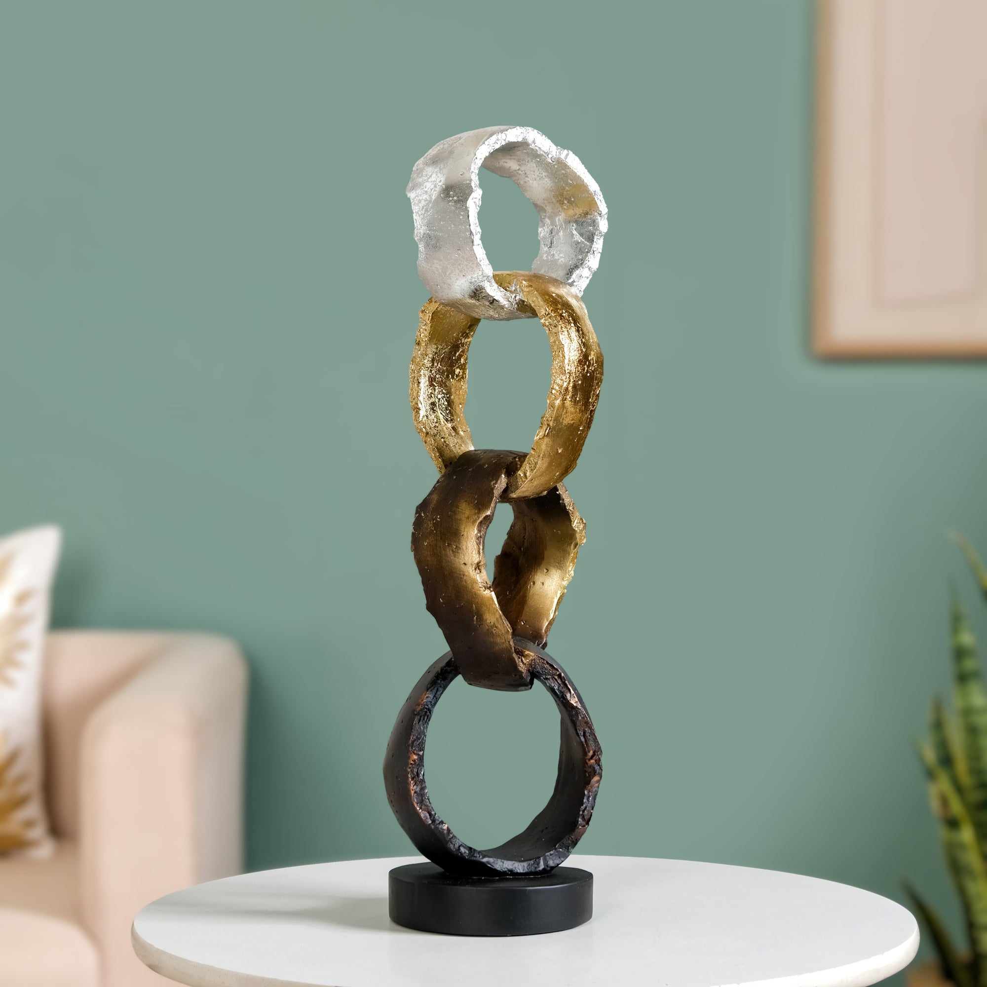 Design: This resin decor piece features an elegant chain-link design, crafted in a vertical arrangement of four interlocked rings. Each link showcases a contrasting metallic hue of silver, gold, bronze, and copper, creating a dynamic gradient of tones. Mounted on a sleek black circular base, the sculpture embodies a balance of industrial edge and modern sophistication. Its textured finish and abstract form make it a striking centrepiece for contemporary interiors.