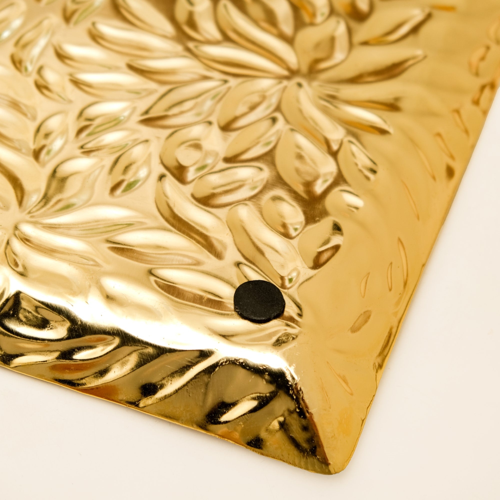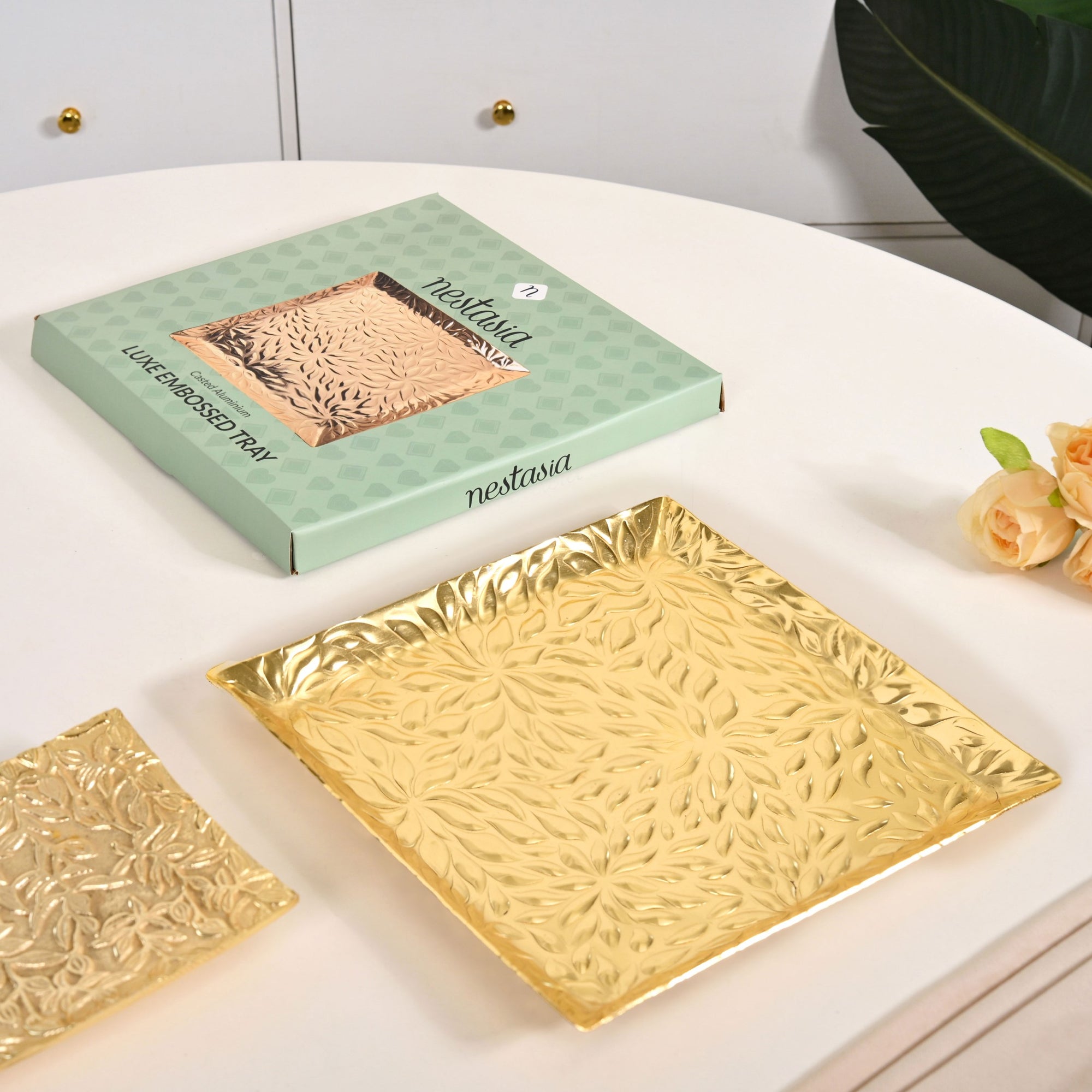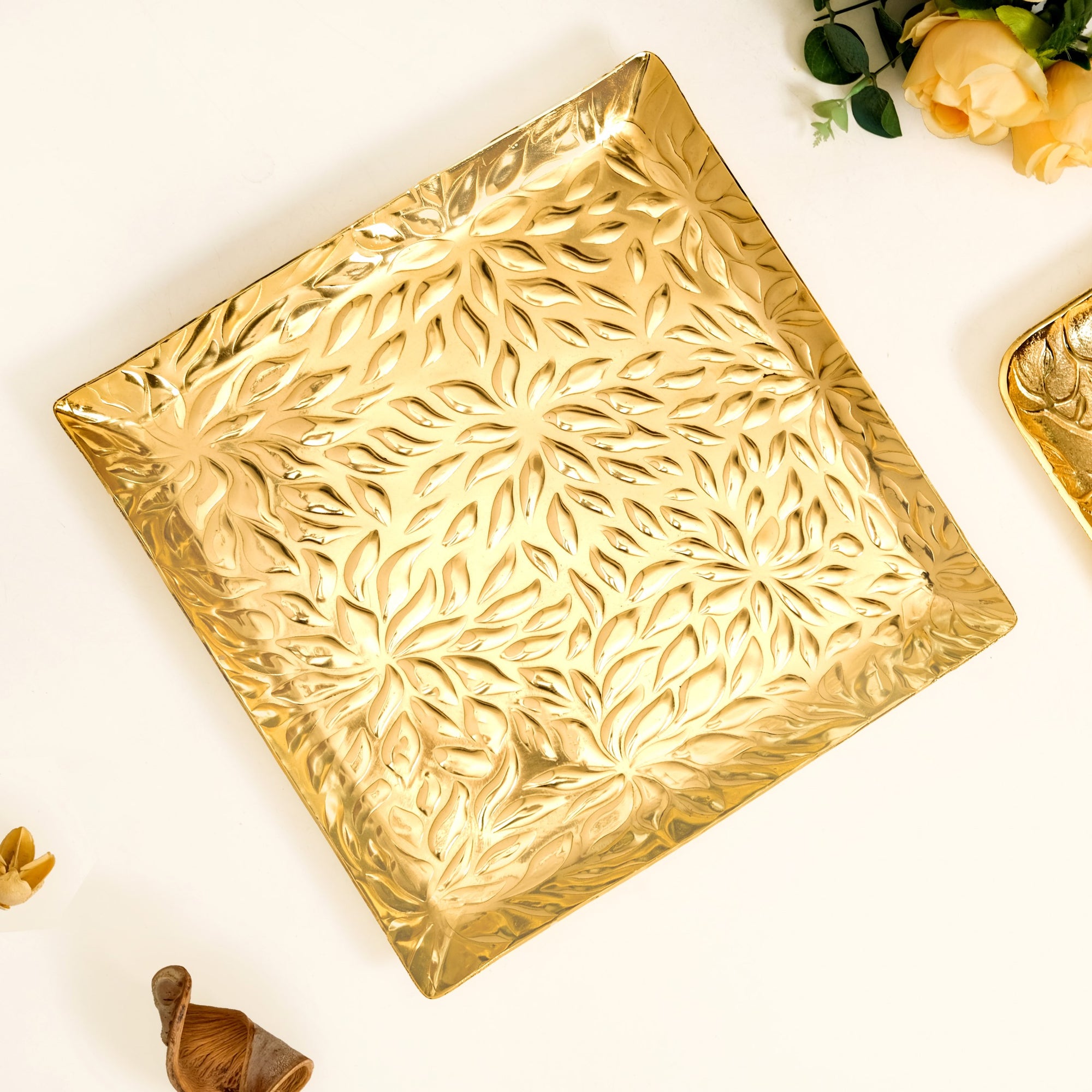 Design: The tray displays a perfectly square form with sharply defined edges. Crafted from aluminium, it features a matte gold finish that radiates warmth and luxury. The surface is adorned with intricate leaf embossing, adding rich texture and depth. Slightly raised edges help keep contents in place, while the seamless construction offers a refined look. Its food-safe finish also makes it suitable for serving dry snacks or treats.