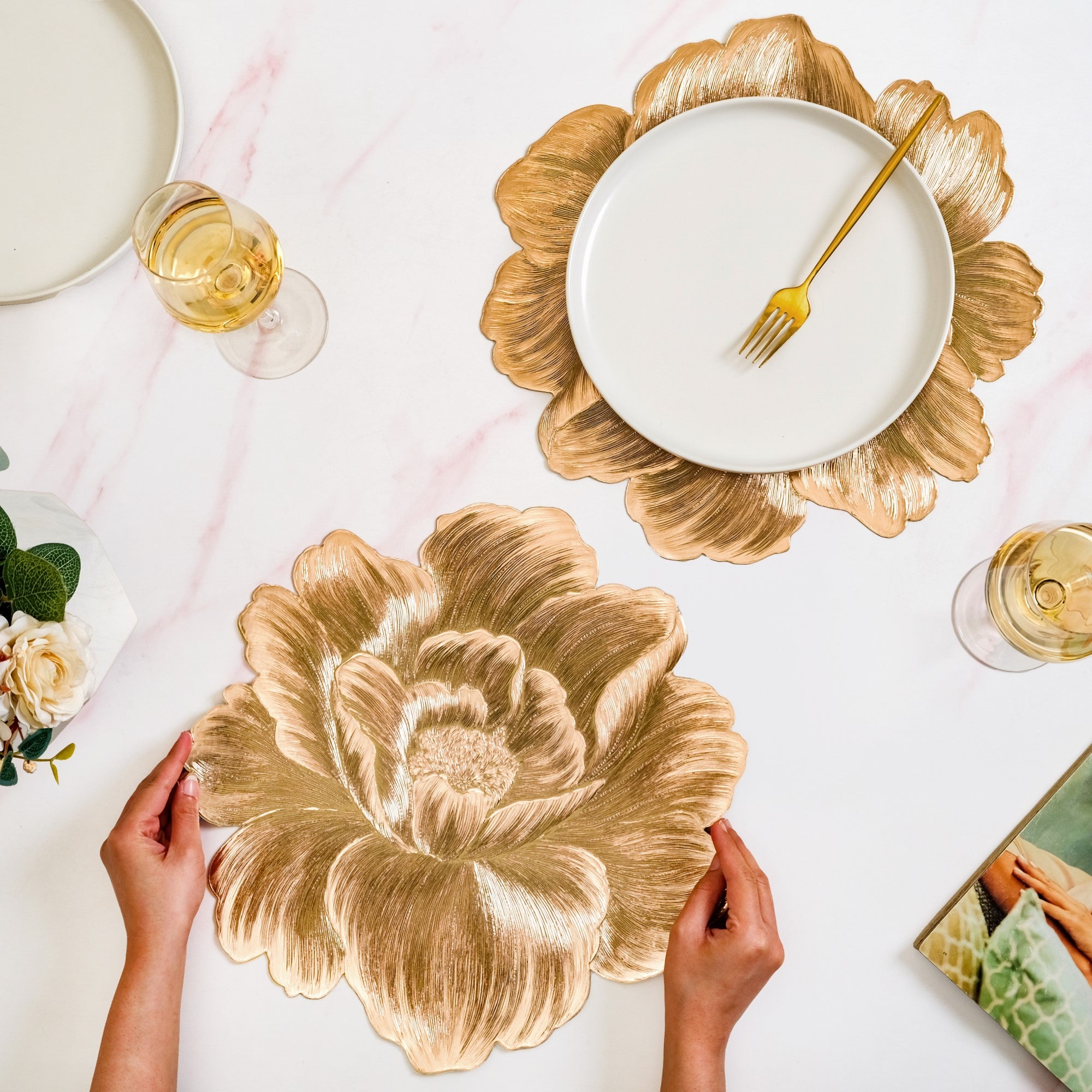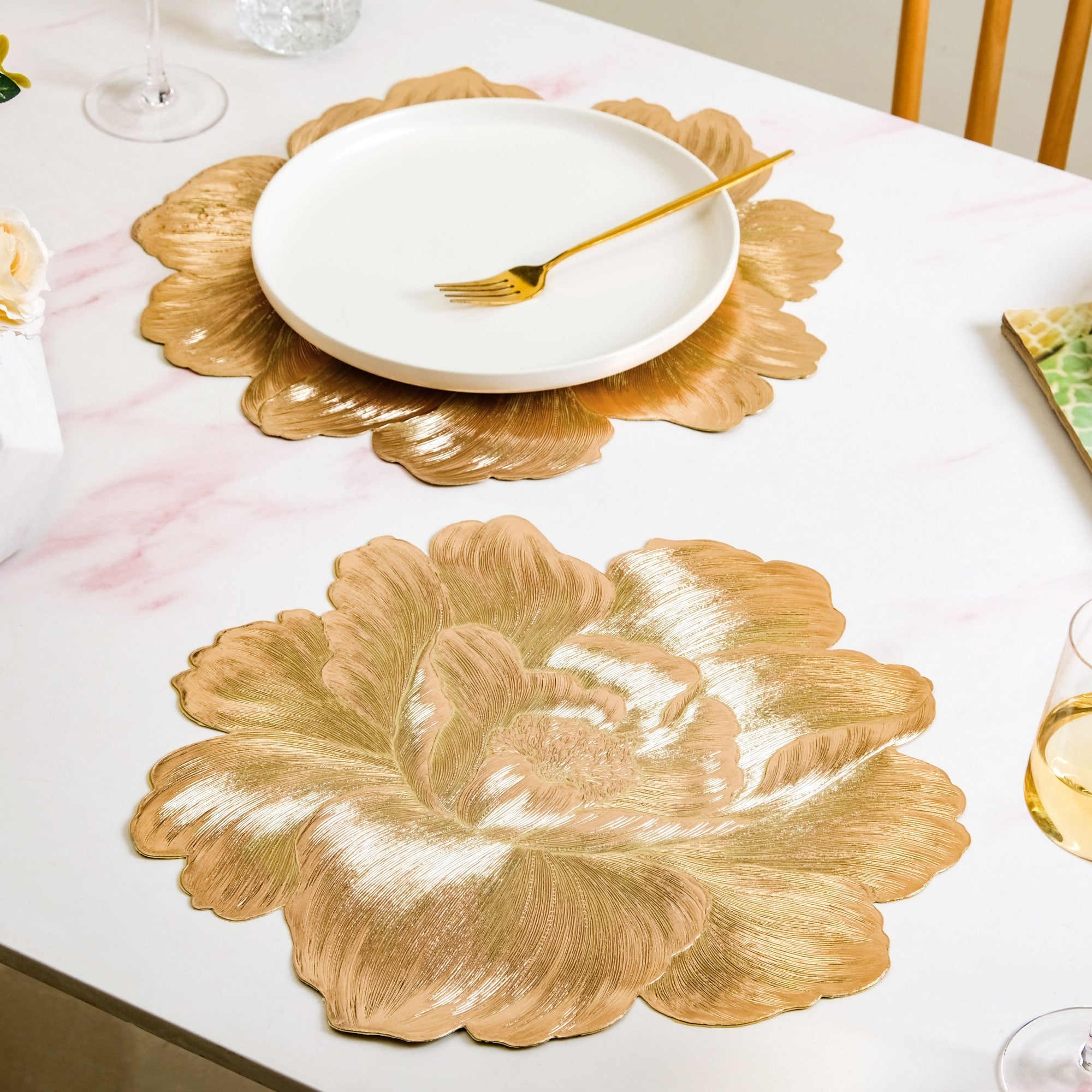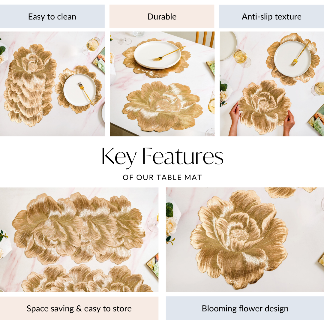Design: The design features an oversized, sculpted bloom in rich metallic gold. Intricate embossing and textured strokes mimic real petal folds, creating a 3D-like visual impact. The petal edges are gracefully curved, giving the mat an organic, artistic silhouette that instantly catches the eye. Its textured finish adds depth and dimension, while the gleaming surface brings a radiant charm to any tablescape. A décor must-have that’s equal parts ornamental and functional.
