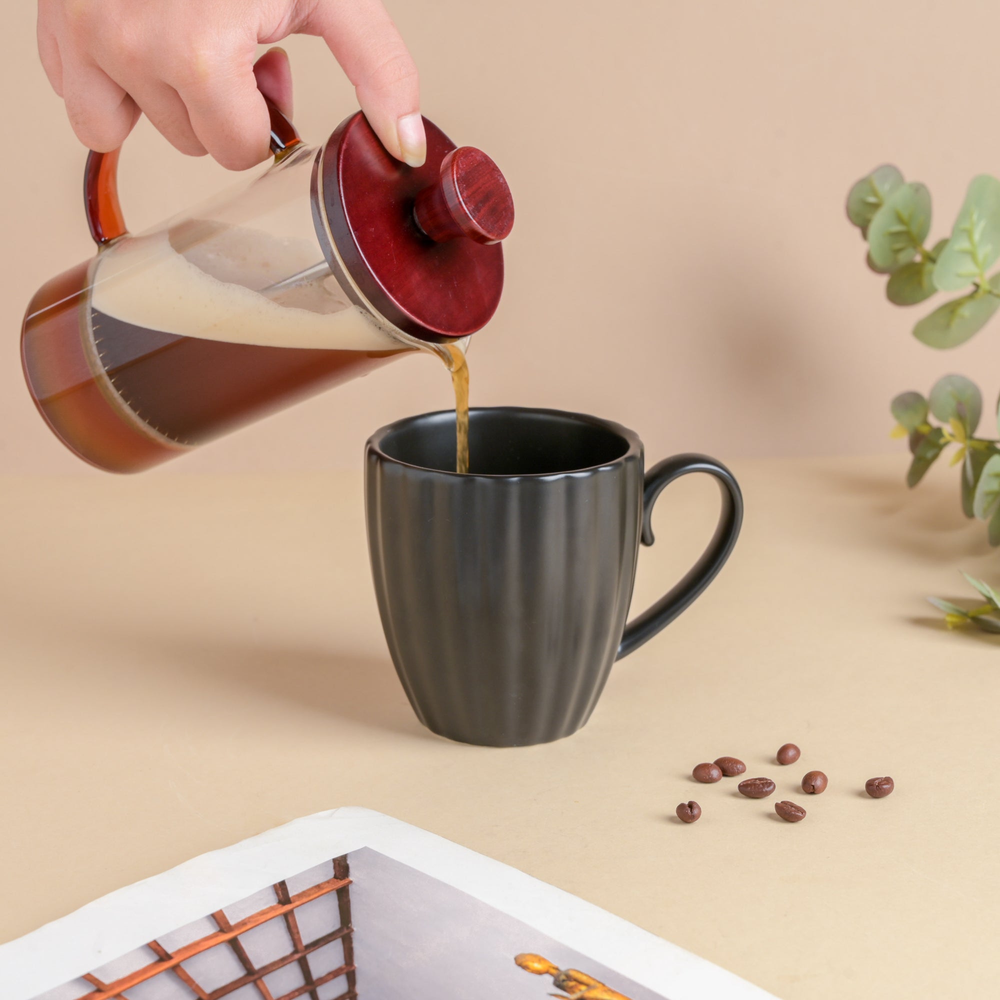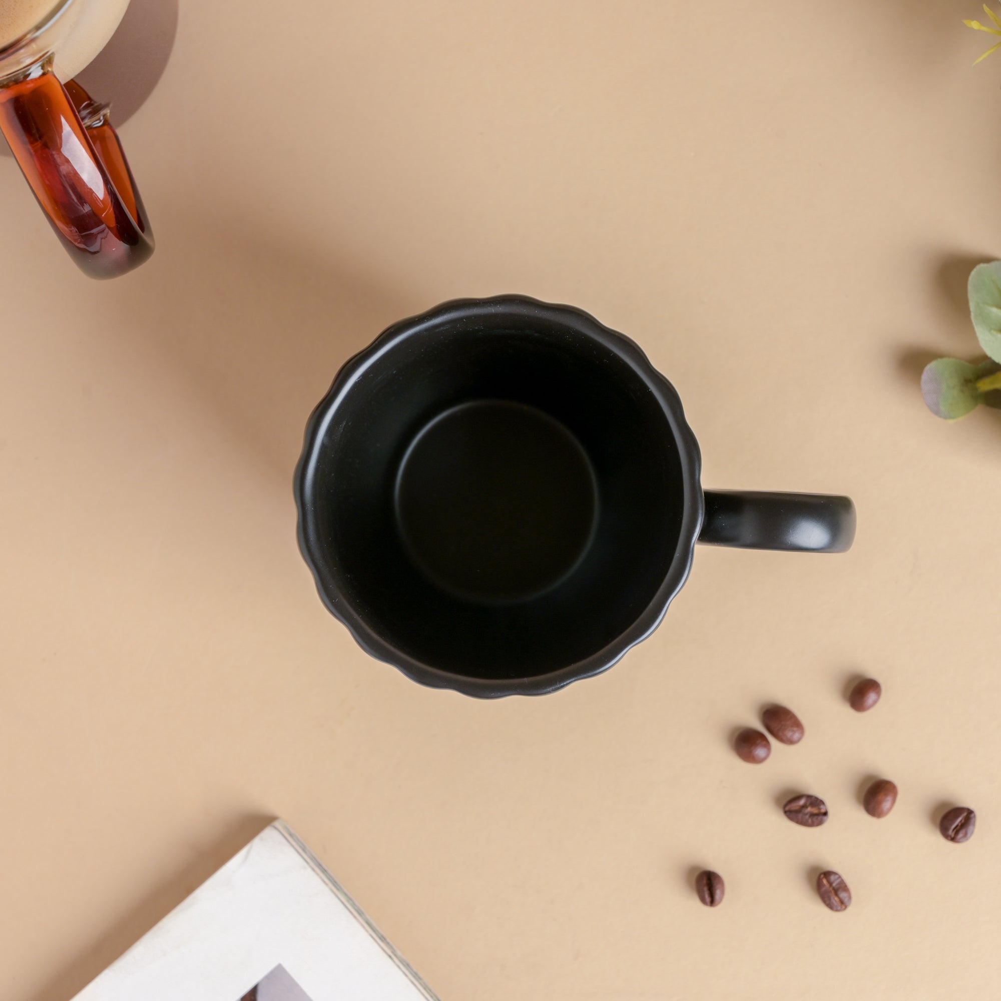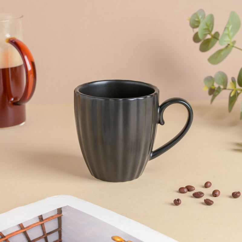 Kickstart the lazy morning routine with a caffeine boost in this stylish jet-black mug. The ribbed designs on the outer surface of the mug lend a simple and subtle look to the breakfast table. The ceramic mug will also double up as a sophisticated pen stand for the work table. The ceramic cup is ideal for serving hot coffee, tea, or hot chocolate. Nestip: One can use the black ceramic coffee mug as a cutlery holder. Size: 8cm D x 9cm H With handle- 11cm L Capacity: 250 ml Color: Black Material: Ceramic Products included: 1 mug Style: HLU86