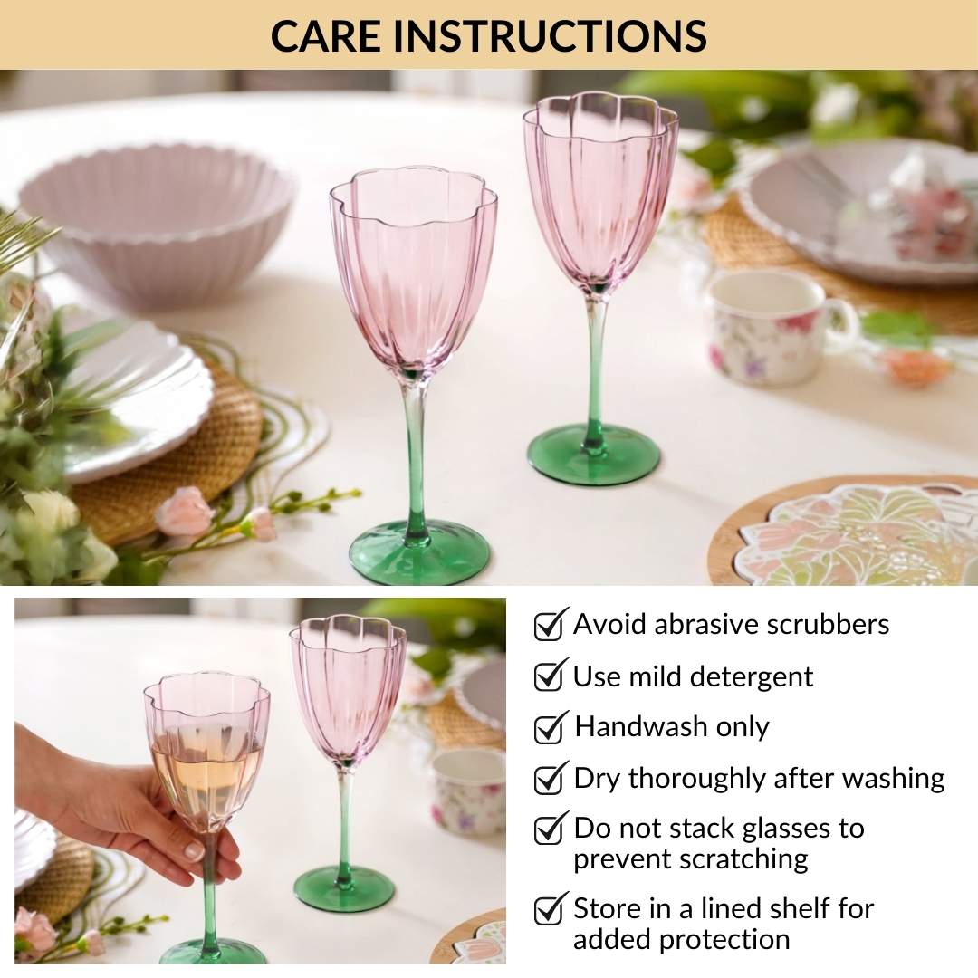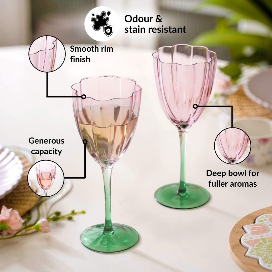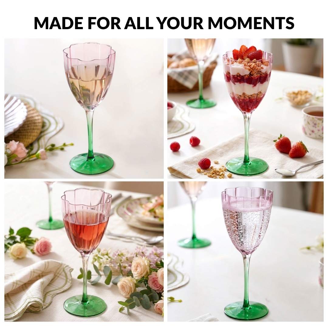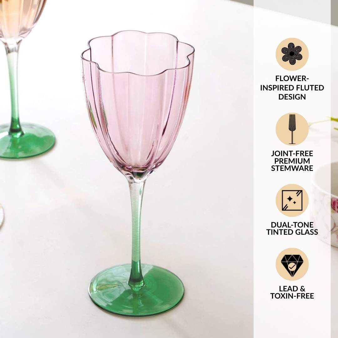 Design: Made from premium tinted glass, each piece holds 320ml, perfect for serving red, white, or rosé wines. The tulip-shaped bowl gently narrows at the top to enhance aroma concentration. The soft, tinted pink bowl paired with a contrasting green stem creates a striking, artistic silhouette that adds a designer touch to your glassware collection.