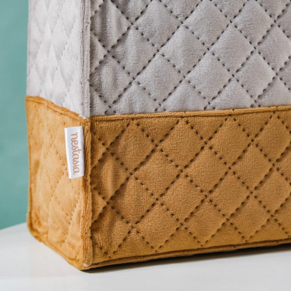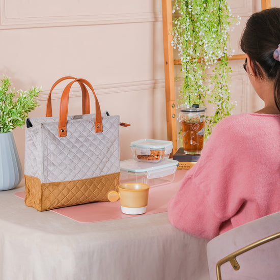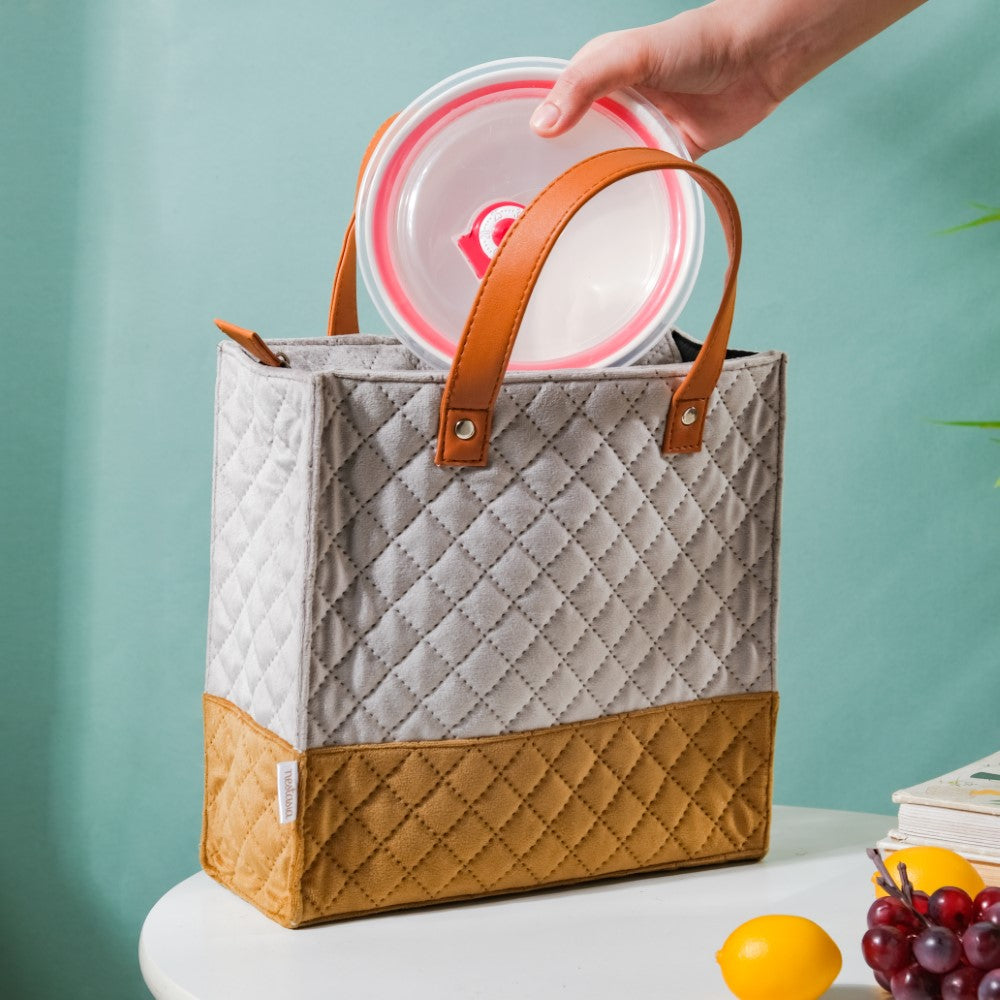Enhance your lunchtime experience with our wonderful and spacious grey and brown lunch bag or tiffin bag from Nestasia. Our quilted lunch box bag gives a touch of elegance while maintaining the security and freshness of your food, thanks to the soft velvet material from which it is made of. A smooth metal zipper ensures a solid seal and prevents spills and leaks. Whether you're headed to work, school, or a picnic, the lunch bag from Nestasia being a perfect blend of design and functionality will help you enjoy your food in style.