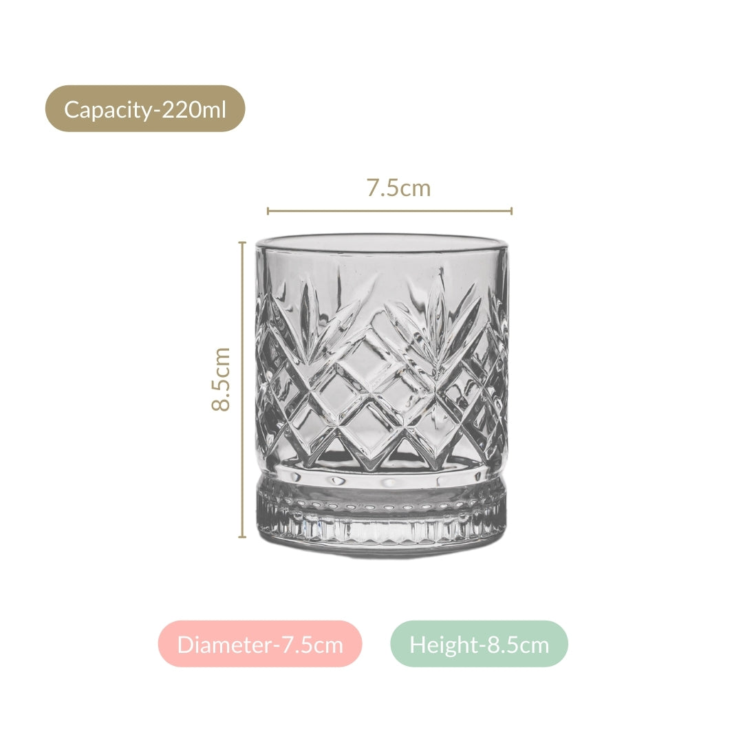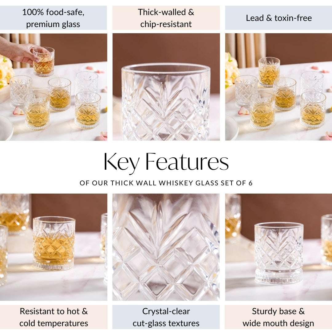 Design: Each glassware in this whiskey glass set features a thick-walled construction with a sturdy base and a wide mouth, enhancing stability and ease of use. The cut-glass textures reflect light beautifully, adding a sophisticated touch to your table setting. With crystal-clear transparency, the drinking glasses showcase the rich colours of your whiskey, elevating the tasting experience for bourbon, Scotch, rye, or blended whiskey alike.
