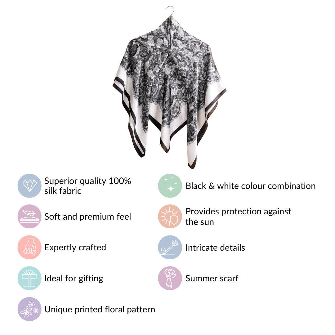 Our black and white printed floral pattern square scarf stands out for several reasons. Firstly, it's crafted from premium silk, which offers a luxurious feel that is both elegant and comfortable. The timeless black and white colour combination makes it a versatile accessory that can complement a wide range of outfits. What truly makes this scarf unique, however, is the intricate lacy floral patterns. These delicate designs add a touch of sophistication and femininity to the scarf, making it perfect for a variety of occasions.