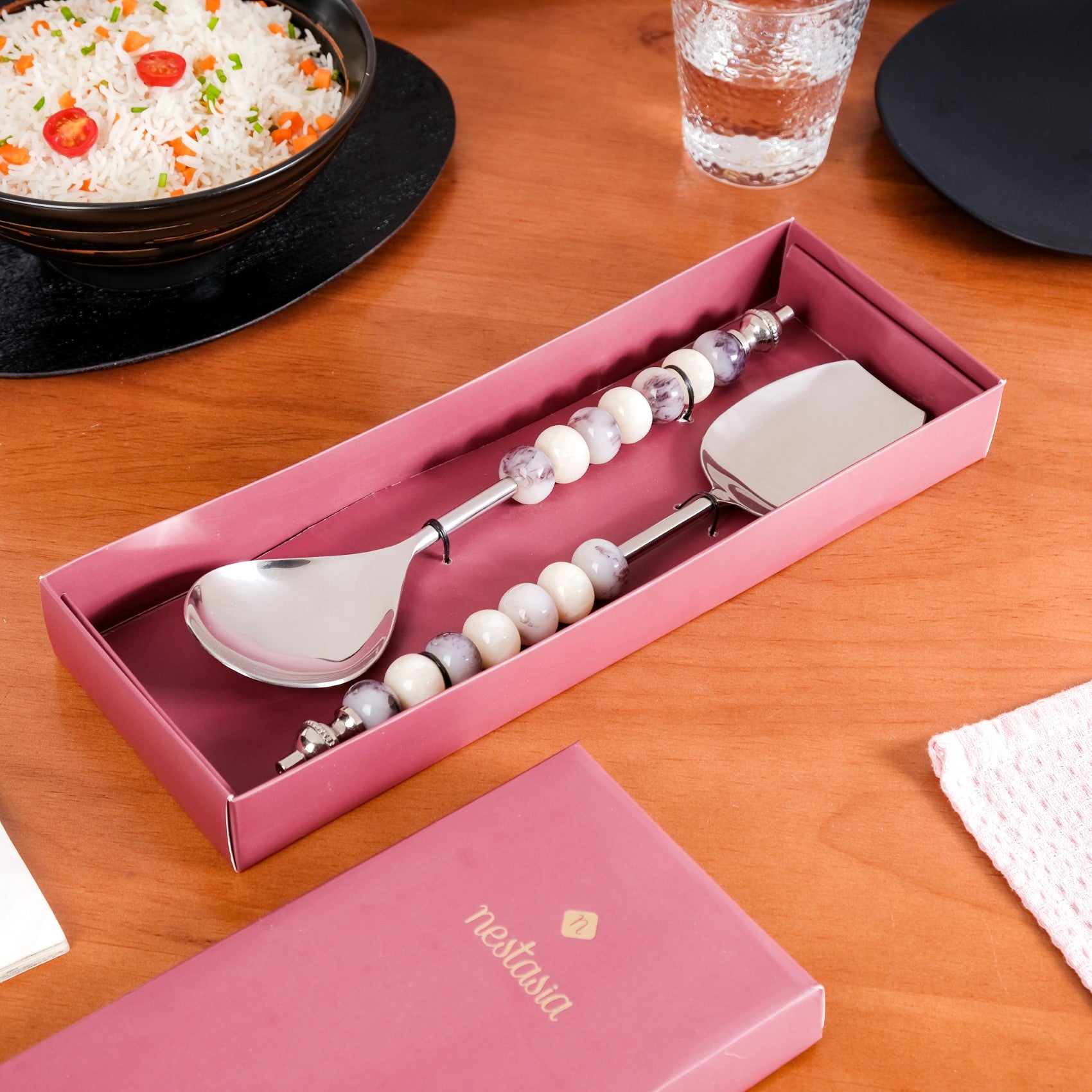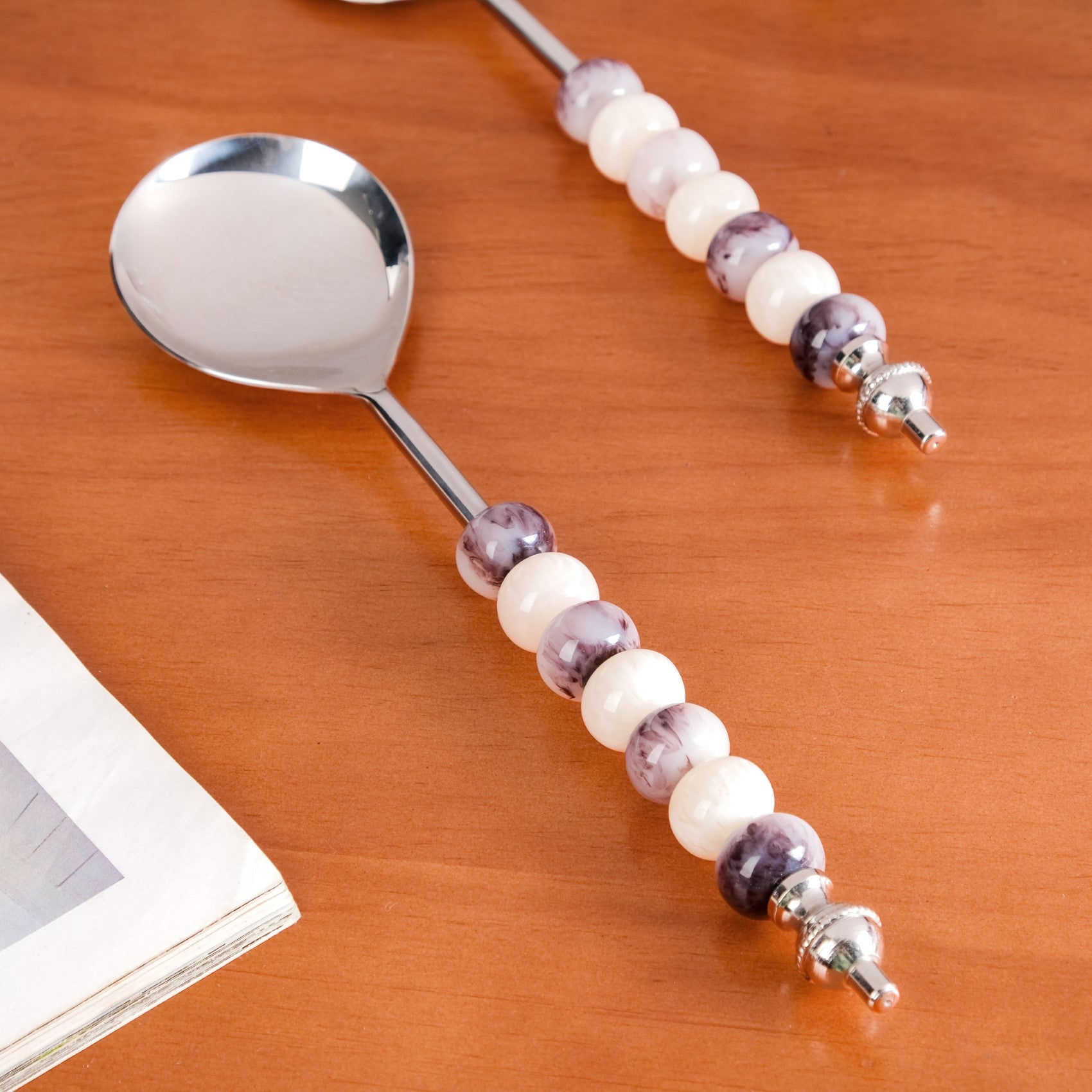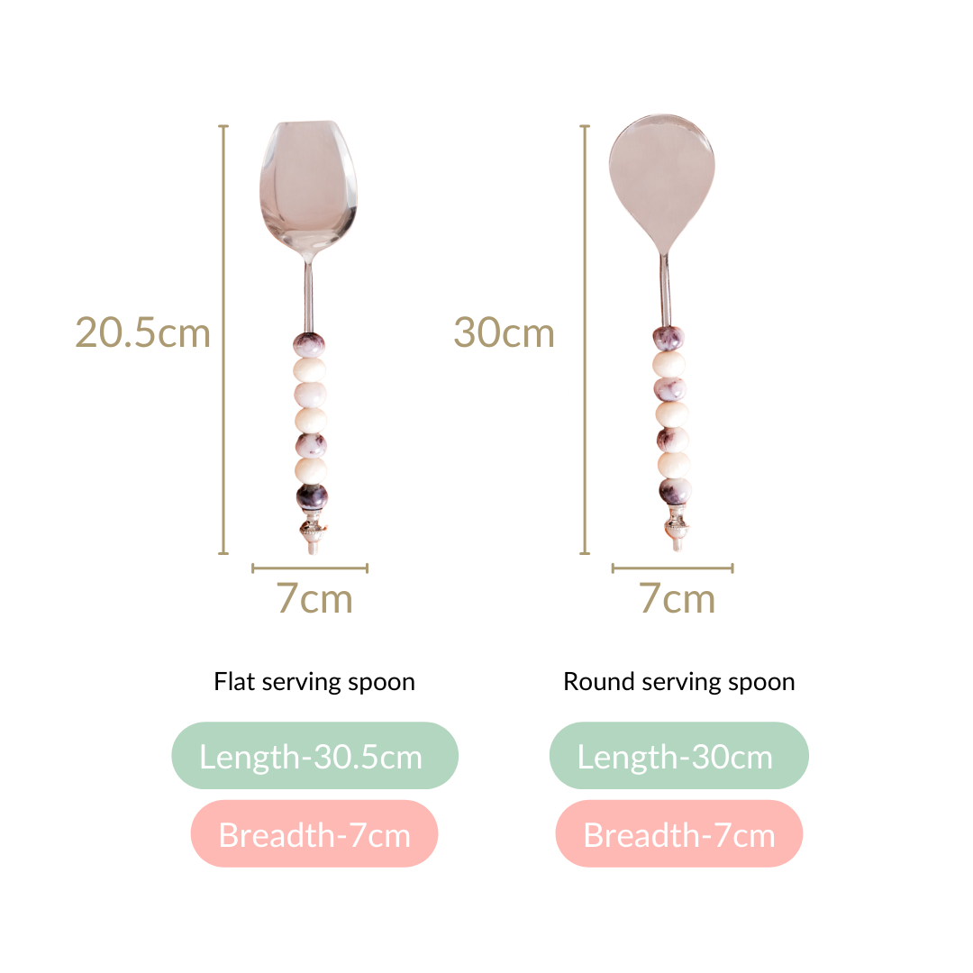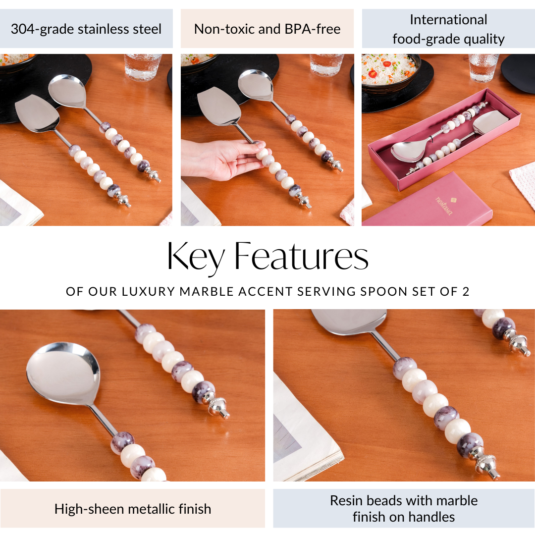 The resin beads on the handles of these serving spoons not only add an aesthetic touch but also provide an anti-slip feature, ensuring a secure grip while serving, even with wet or greasy hands.