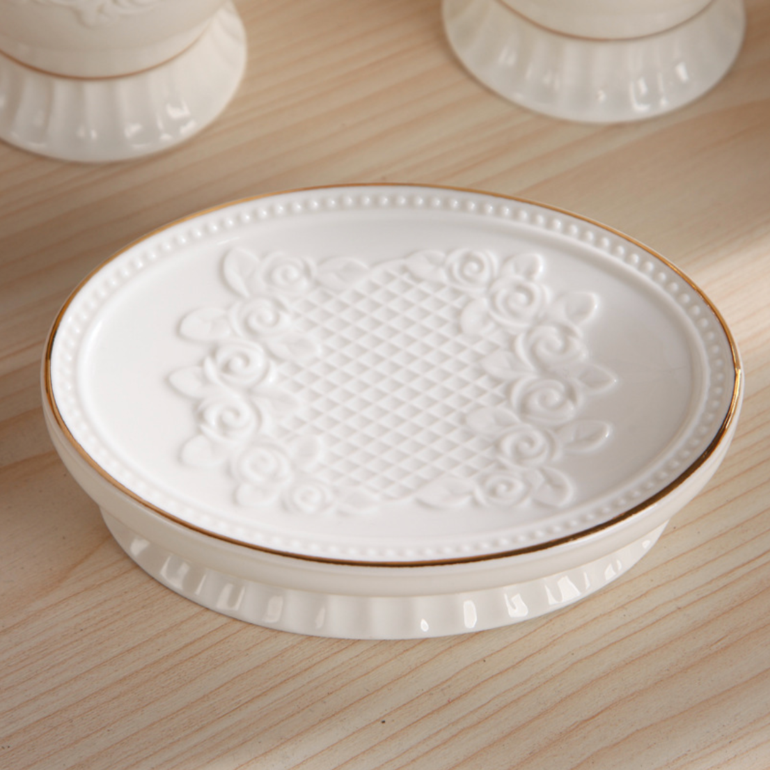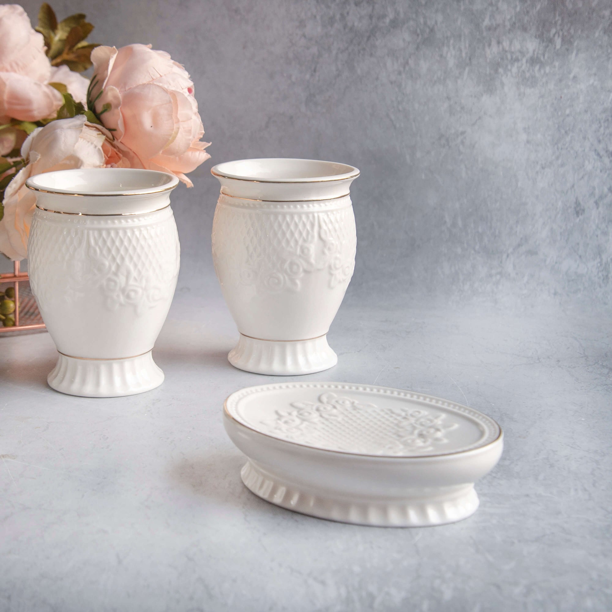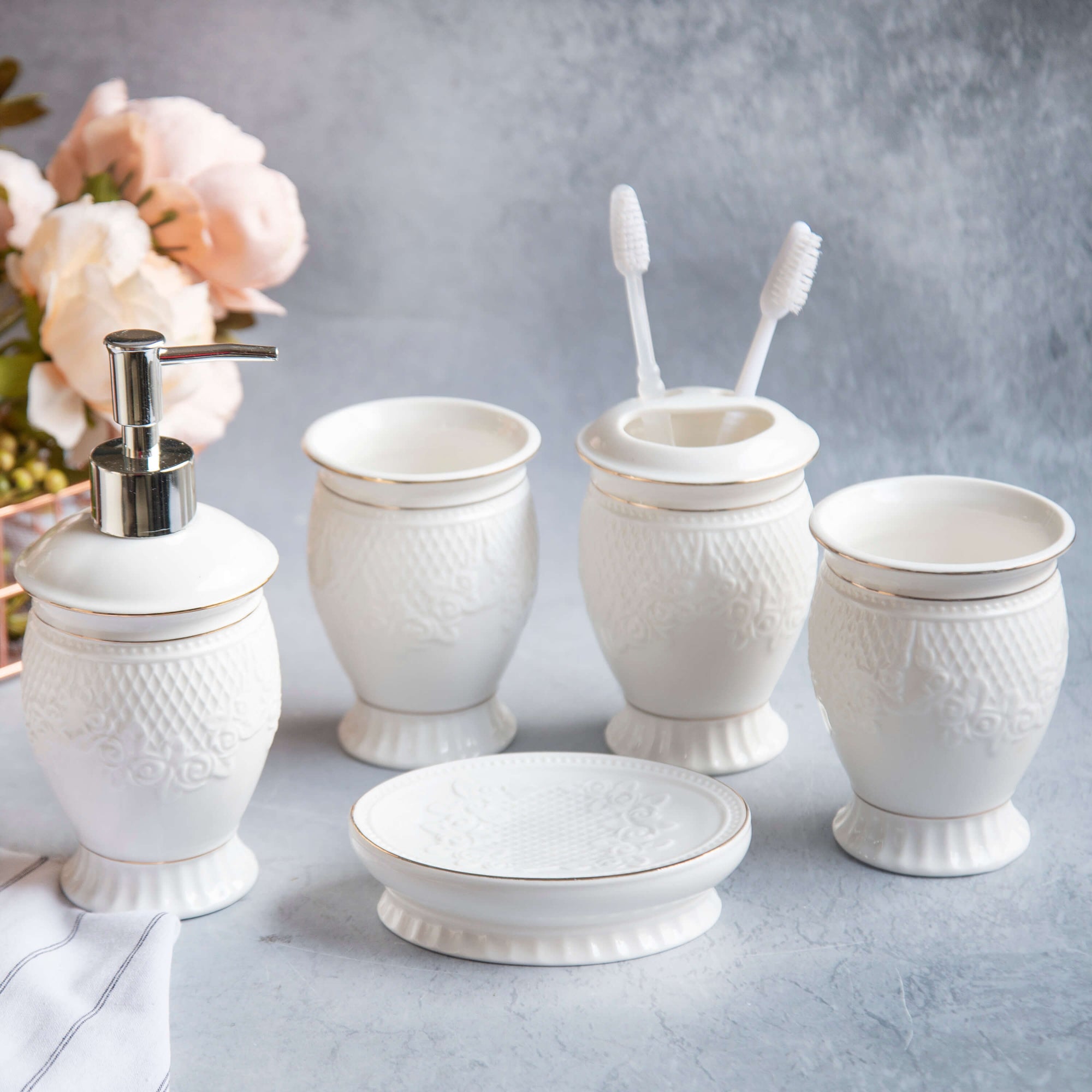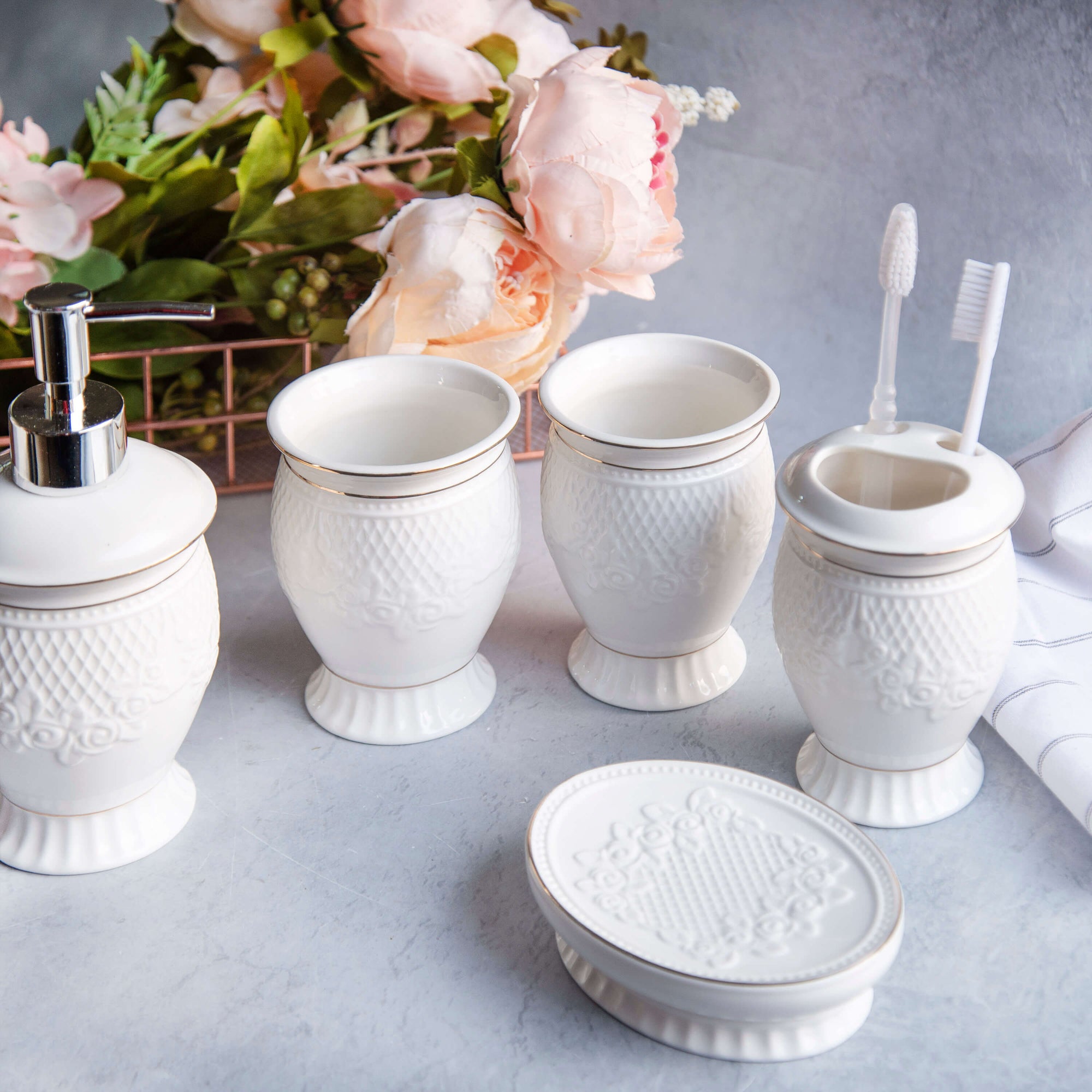 Luxury bathroom set that comes with a liquid dispenser, toothbrush holder, bathroom tumblers and a soap holder. The bath set has a luxurious textured design on the surface and a gold lining. The set can be arranged in any bathroom setting and it will make the bath look sophisticated and organised.