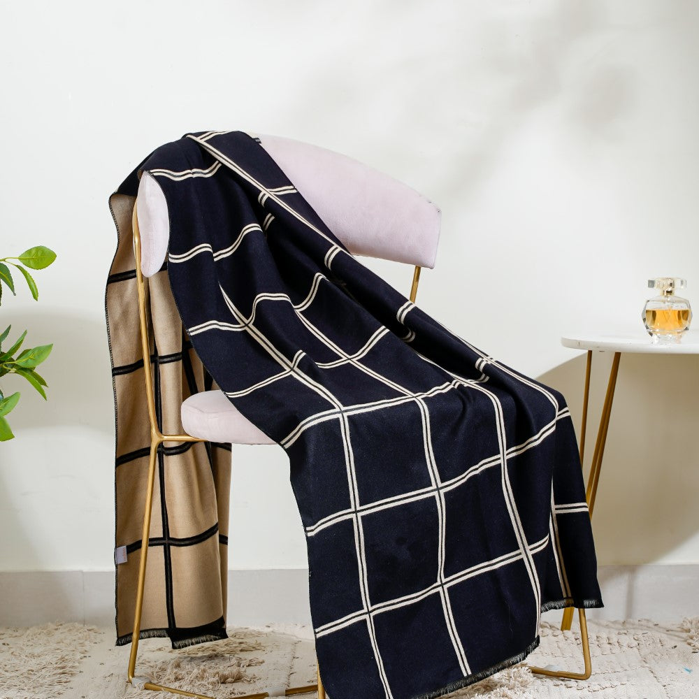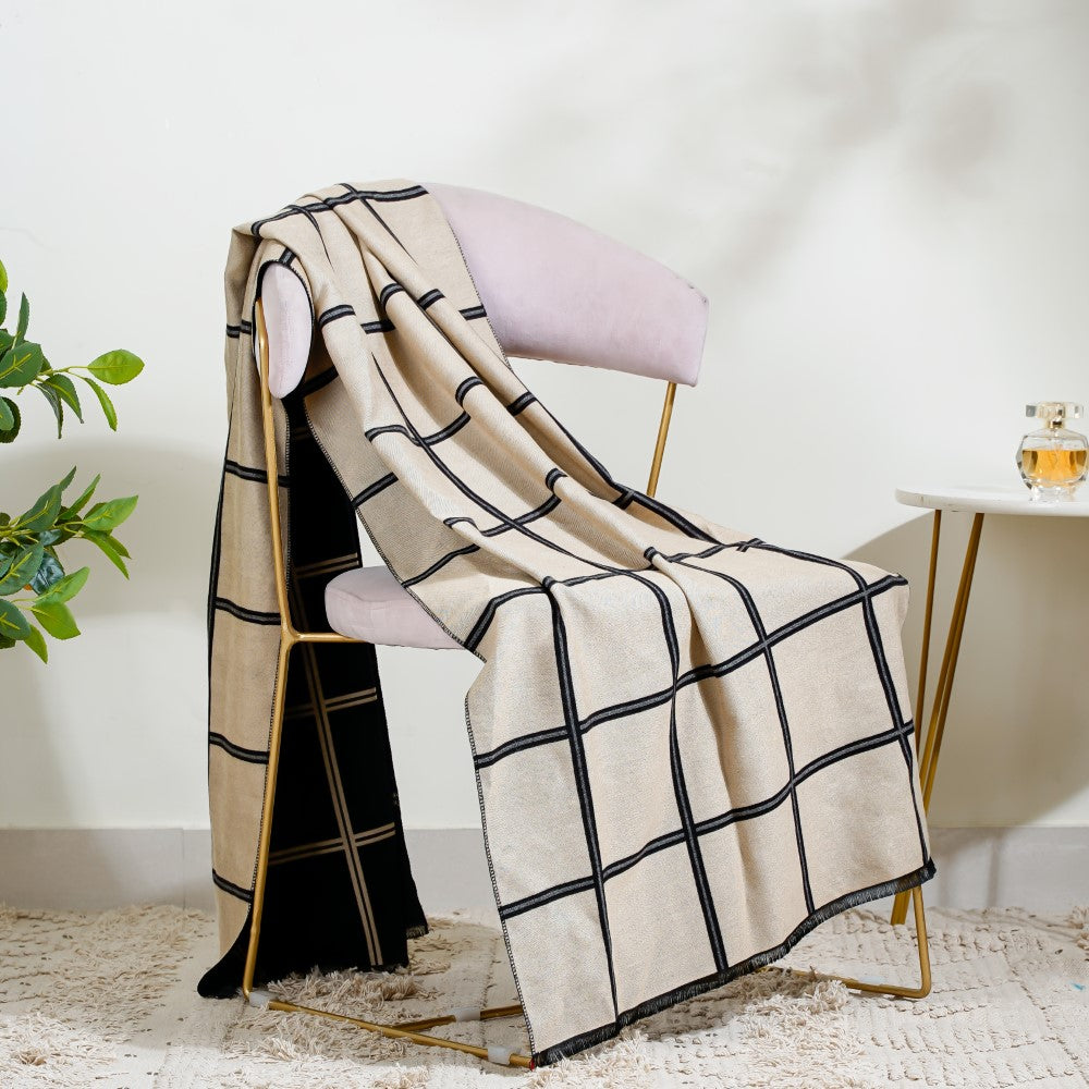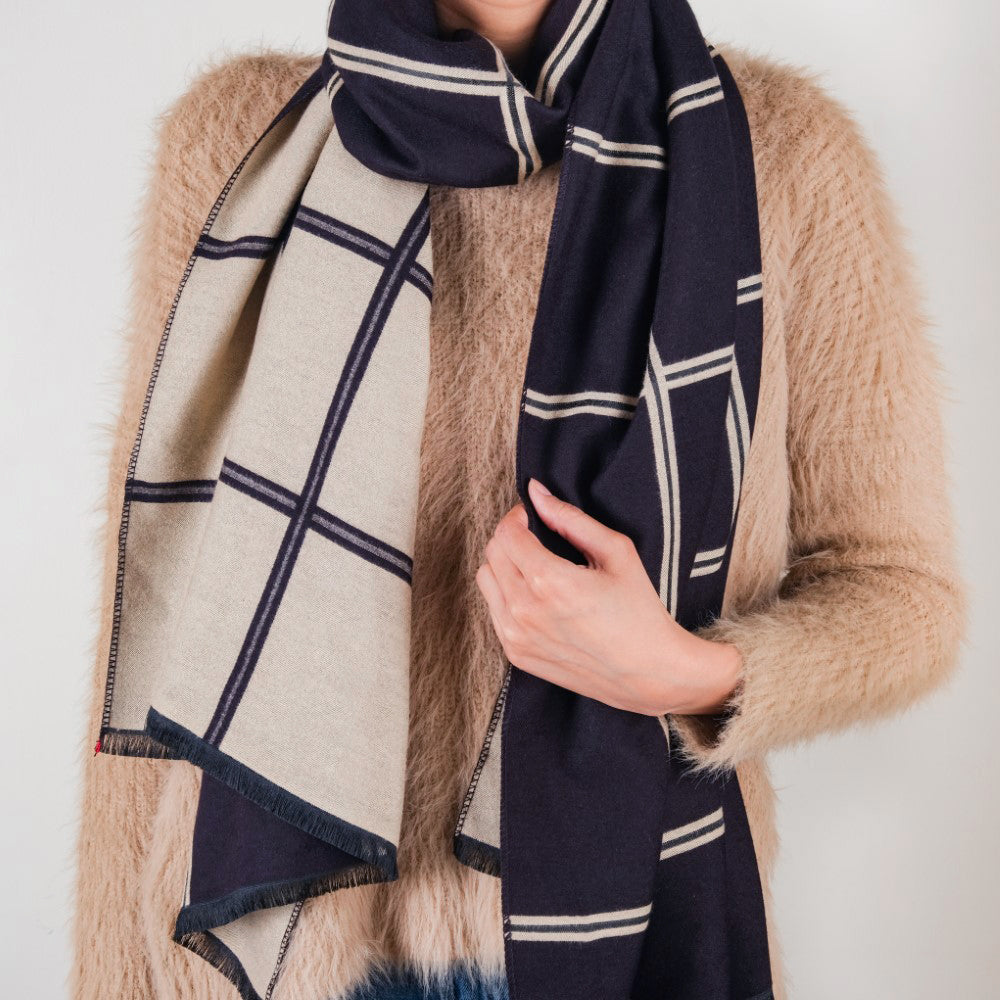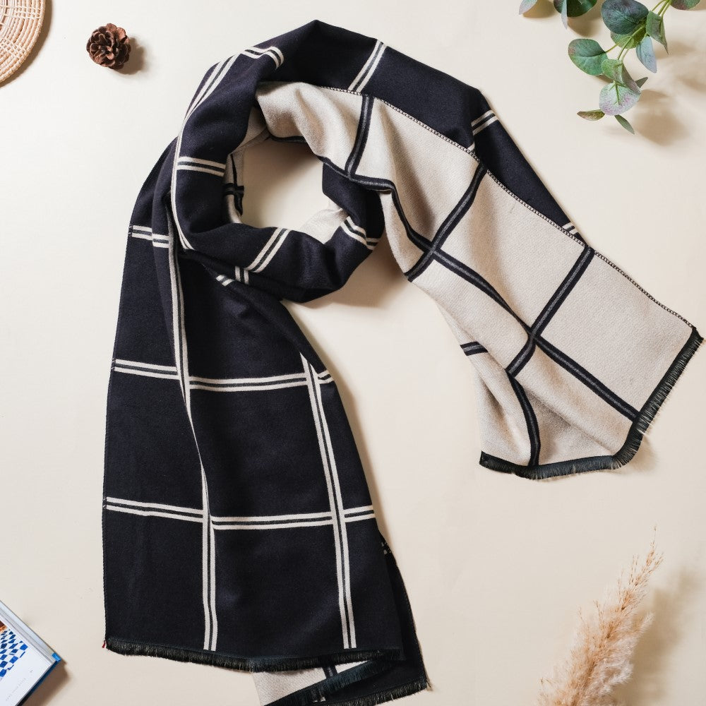 The winter scarf features a minimalistic square-patterned design in black and white, offering a chic and elegant vibe. The monochrome colour combination of the blanket scarf makes it easier to wear the polyester scarf with both white and black winterwear clothes. The combination of polyester and viscose fabrics also makes the ladies' scarf super-soft and smooth in texture.