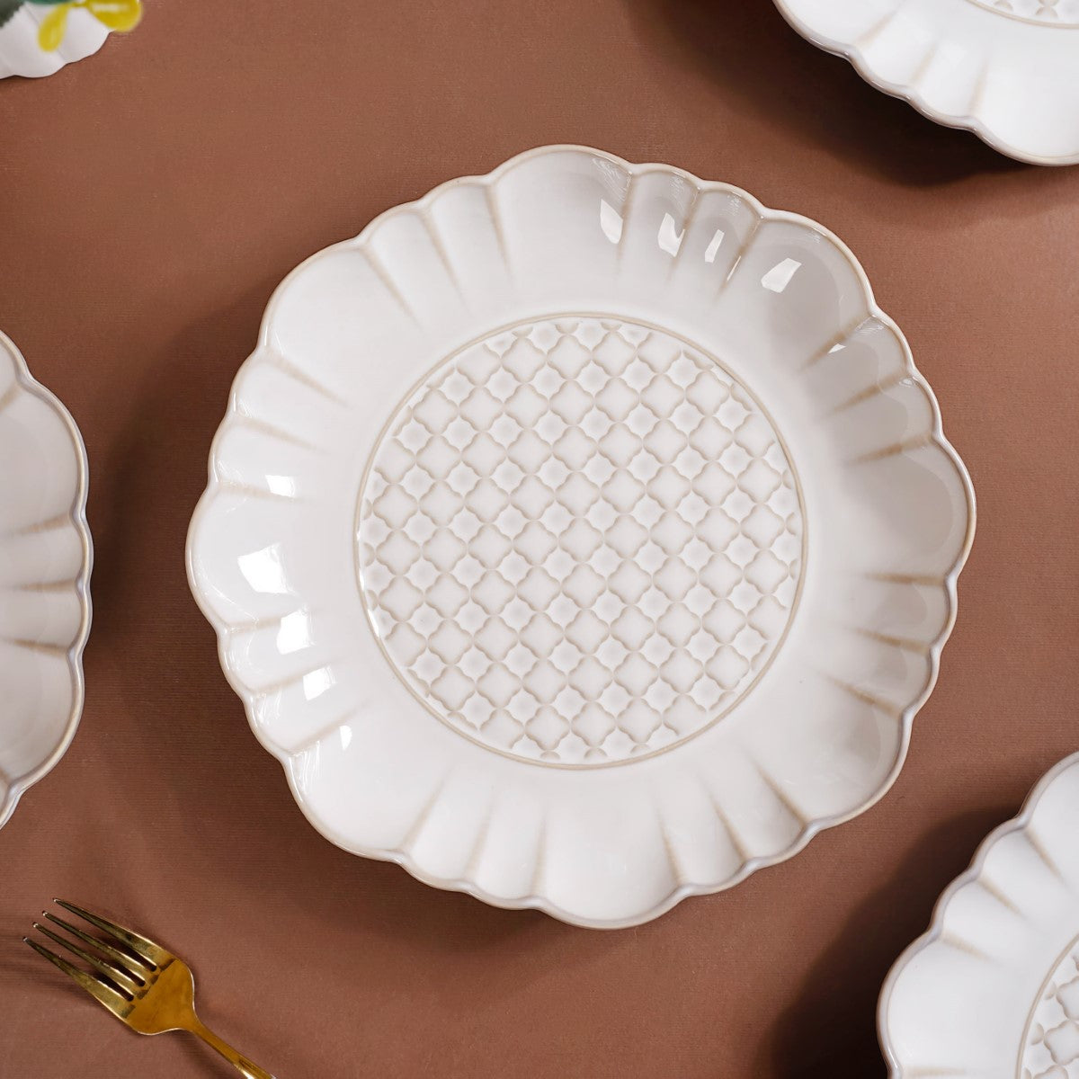 There are a few qualities that set these dinner plates apart from others on the market. To begin with, these dinner plates feature an intricate Moroccan motif on the surface of the plates, which will completely captivate your guests. Furthermore, the scalloped rims and classic ivory colour add a whimsical elegance to your table set-up. Furthermore, the plates are made from high-quality ceramic, that is non-porous. Therefore, you're not only getting plates that look good, but you're also getting quality plates!