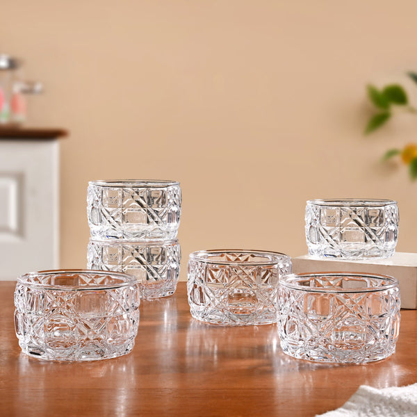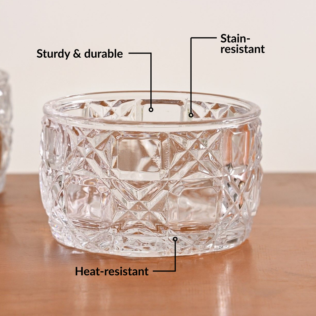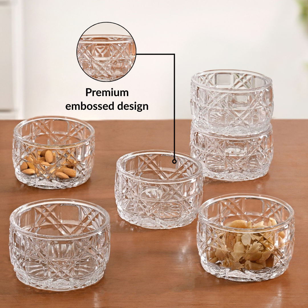 Design: This set of six transparent glass bowls features an overall cross and square embossed design, creating a richly textured look. It has a decorative, floral embossed base that adds elegance, while the smooth inner surface highlights the clarity and finish of the glass. Perfect for serving delicious curry and dal.
