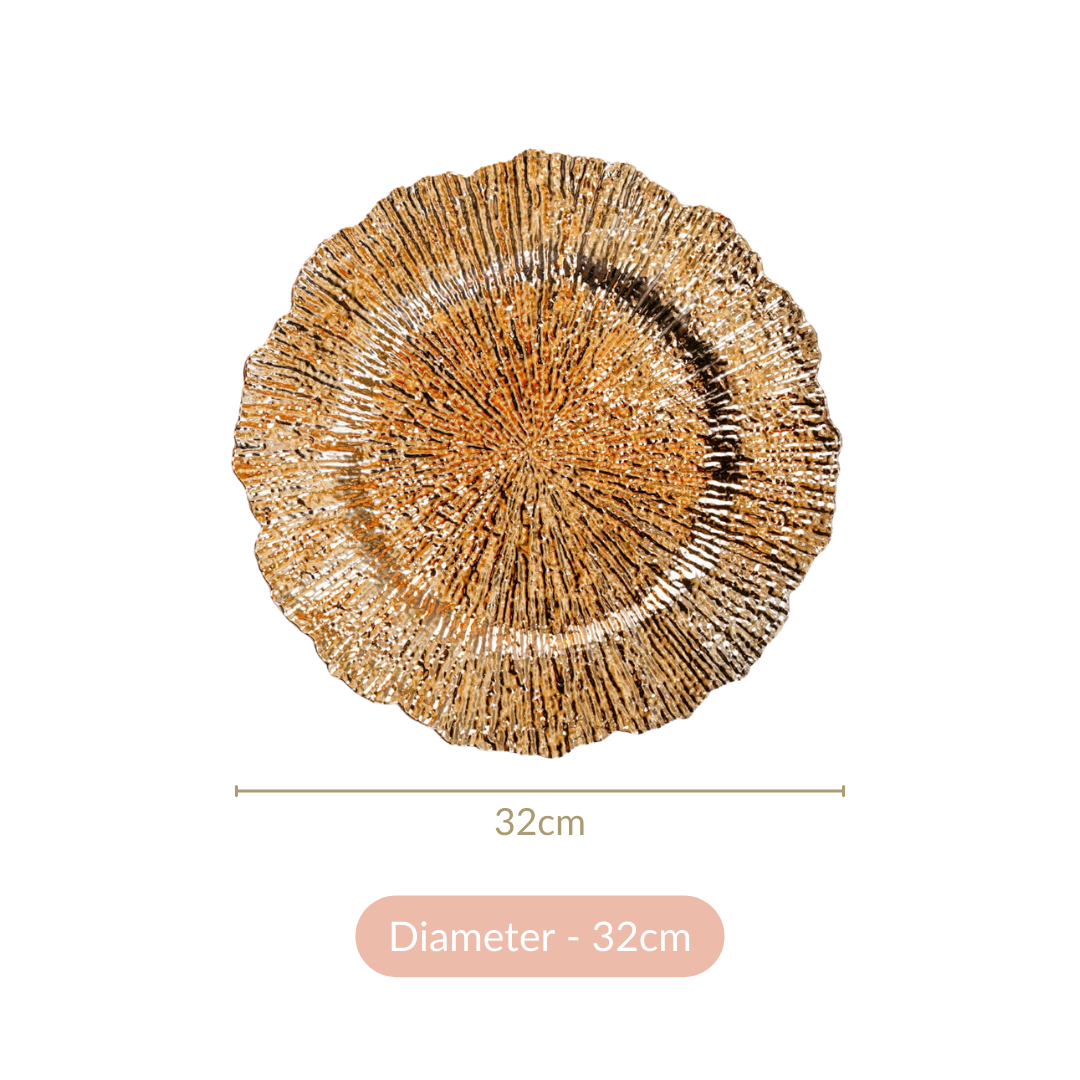 Our gold charger plate features a unique design with wavy edges and a reef-like motif. This design sets it apart from conventional charger plates, making it a stunning addition to your table setting or home decor. The wavy edges add a touch of elegance and sophistication to any dining experience, while the grooved pattern adds depth and character to the plate, making it a conversation starter at any event.