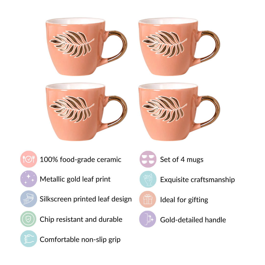 Introducing our fern leaf pattern peach coffee cups set of 6, a harmonious fusion of grace and practicality. Each cup boasts a captivating horizontal fern leaf motif, expertly silk-screen printed in black and white over a peach background. Made from premium-grade ceramic, these cups promise enduring elegance. The metallic accents and ergonomic handles infuse an air of refined sophistication. Engineered with a chip-resistant design, these cups are a testament to longevity, enhancing your coffee moments for years. Plus, the ergonomically designed non-slip grip prevents accidental slips.