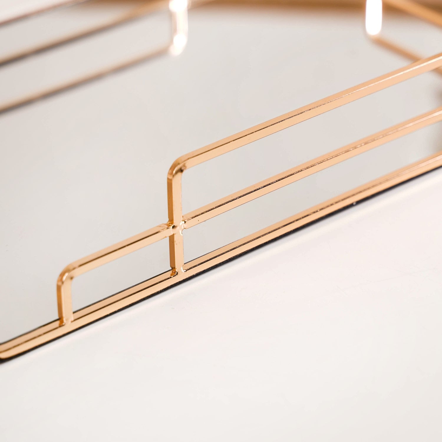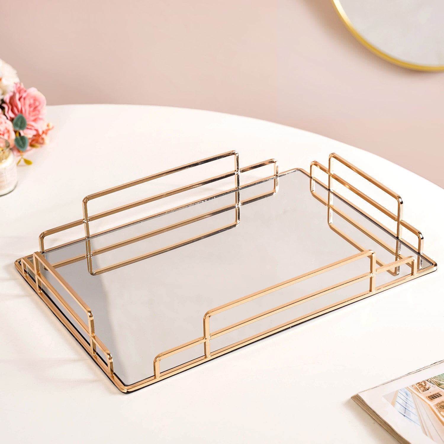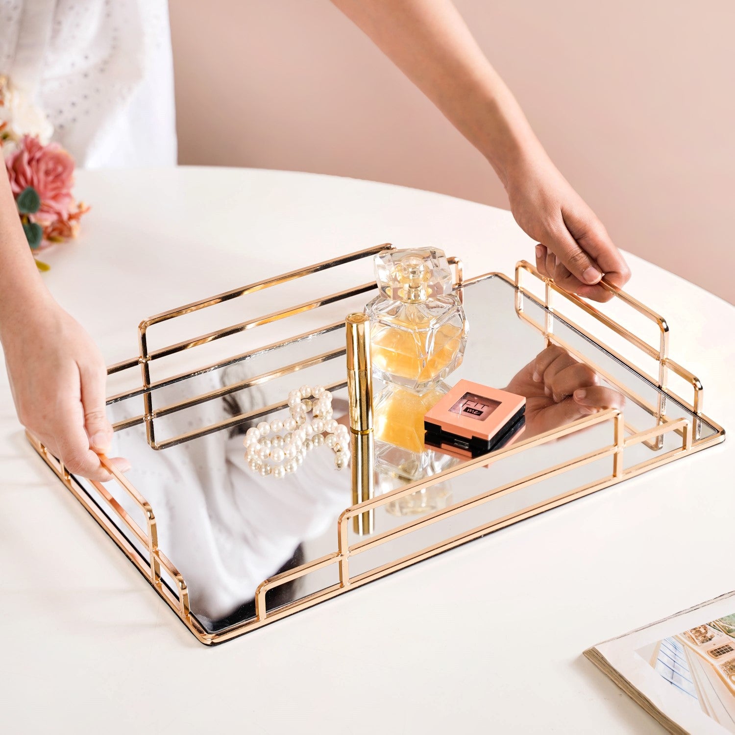 Design: The decorative tray boasts a modern minimalist design with a metallic rose gold finish that adds a chic touch to any room. Its crystal clear mirror base enhances its elegance, while the easy-grip handles ensure convenient use.
