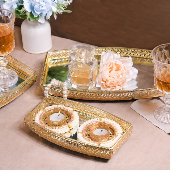 Introducing a trio of elegance – our set of 3 decorative mirror trays. Meticulously designed to perfection, these decorative trays redefine luxury decor. Crafted from premium quality metal with rust-resistant durability, the intricate rim design and high-sheen gold finish of these trays captivate the eye. Showcasing expert craftsmanship, each tray rests on sturdy metal legs, while the glass mirror base adds a touch of sophistication. A perfect trio for Puja decorations or a captivating table centrepiece, these metal trays effortlessly blend aesthetics with functionality, exuding opulence in every detail.
