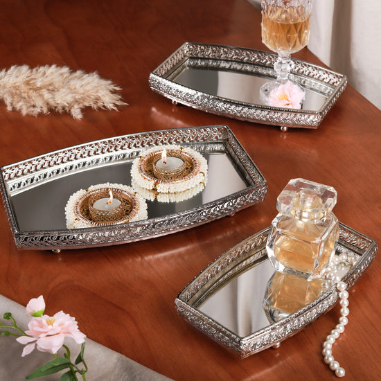 Elevate your decor with our exquisite set of 3 decorative mirror trays. Crafted with premium materials, these trays boast remarkable durability and rust resistance. The intricate rim design and high-sheen silver finish showcase expert craftsmanship. Resting on sturdy metal legs, the glass mirror base adds a touch of sophistication. This set, versatile for both daily use and Puja decorations, makes for a perfect table centrepiece. Discover the fusion of elegance and utility in these trays, an embodiment of fine artistry and practicality.