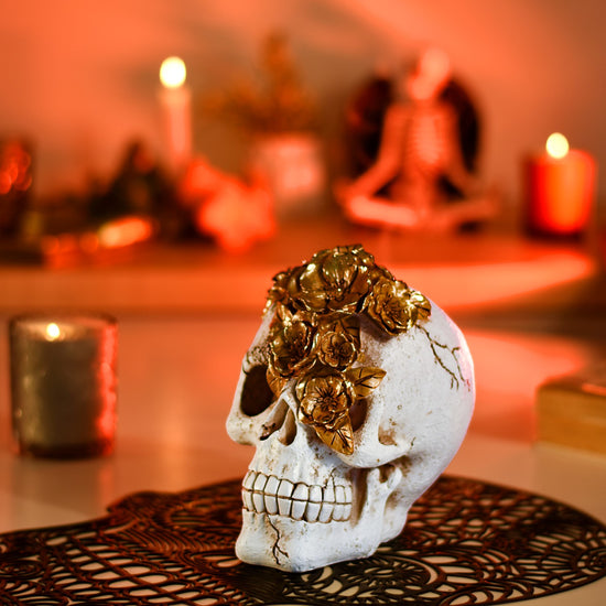 When styling a Gothic-inspired vignette with the skull showpiece, consider incorporating elements such as dark, rich colours, ornate textures, and moody lighting to enhance the ambience. You can also pair the skull showpiece with other macabre-themed decor accents such as candlesticks, antique mirrors, and velvet textiles.