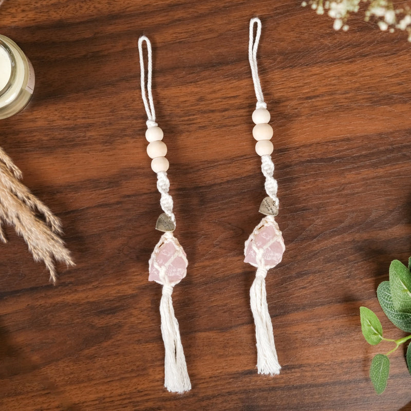 Can you feel the love tonight? If not, get ready to welcome an abundance of it in your home! Say hello to our macrame love wall hanging set. Crafted with care and adorned with love, this wall decor set is made from high-quality wood and rock salt, all suspended and wrapped in ethically sourced polyester, making it every bit as durable and sustainable as it is stylish. Rock salt helps to clean the air in your home and reduce stress. It can also neutralize the minor tradition emitted from your electric devices, creating a calmer space. However, it's the design that makes this beauty oh-so-loveable. Featuring a central pink rock salt stone that mirrors the gentle allure of rose quartz, you know this wall hanging is going to bring warmth into your space. Furthermore, the intricate macrame design exudes elegance and artistry, weaving patterns that captivate the eye and elevate any space. Tassels adorned with wooden beads in a serene sand colour add a natural touch. The addition of the 'made with love' metal heart charm adds a heartfelt touch, making this wall hanging set not just a decorative accent, but a meaningful expression of affection and craftsmanship. Now that you know, it's time to add this beaut to your cart and hit that checkout button!