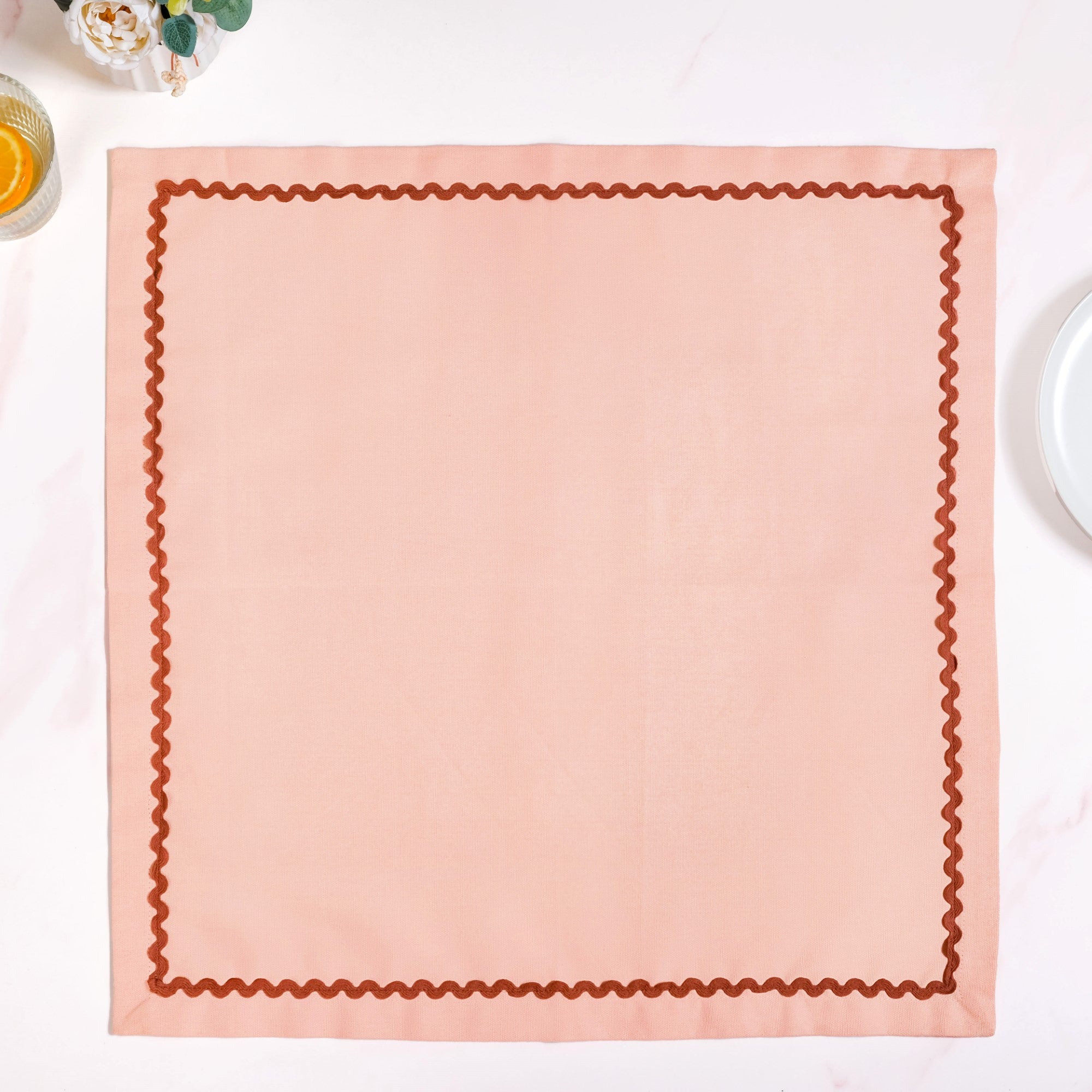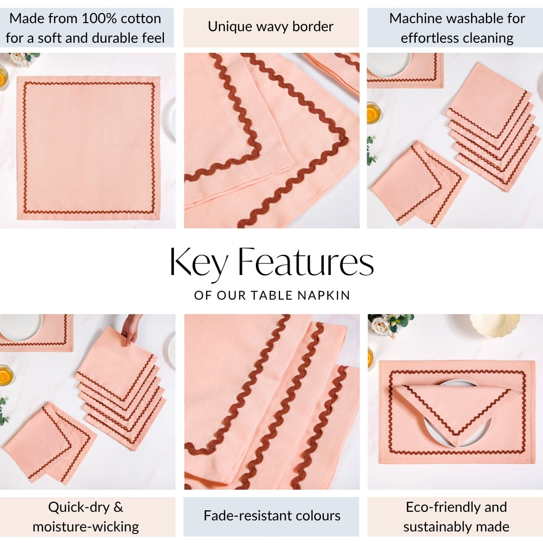 Design: You'll simply adore the charming design of these napkins! This set of 6 napkins comes in a gentle peach colour, beautifully framed with a subtle maroon wavy stitching around the edges. This simple yet elegant design adds a touch of quiet charm to your place setting, perfectly matching a refined aesthetic. The delicate, wavy pattern adds a unique and playful detail that truly stands out, ensuring your table looks inviting and beautifully dressed for any occasion.
