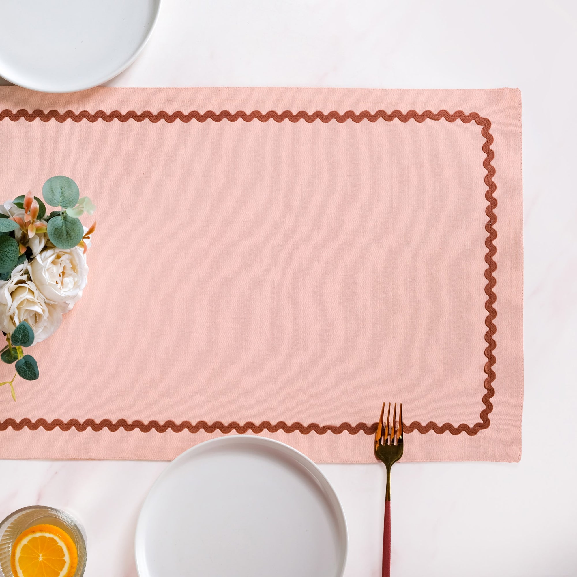 Beautiful Design: This beautiful runner gracefully stretches across the dining table, instantly setting a warm and inviting tone. It features a lovely, soft peach, the centrepiece colour that brings a gentle, calming glow to any setting. This serene base is beautifully framed by a pretty maroon wavy design that is carefully stitched along its edges. This contrasting border is not only eye-catching but also adds a playful yet sophisticated touch, creating a defined edge that highlights your table's centrepiece colours. The delicate embroidery itself is simple yet incredibly detailed, showcasing fine craftsmanship and adding a touch of handcrafted elegance without ever looking too busy.