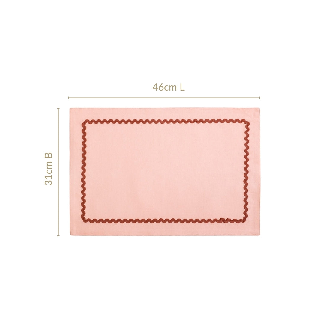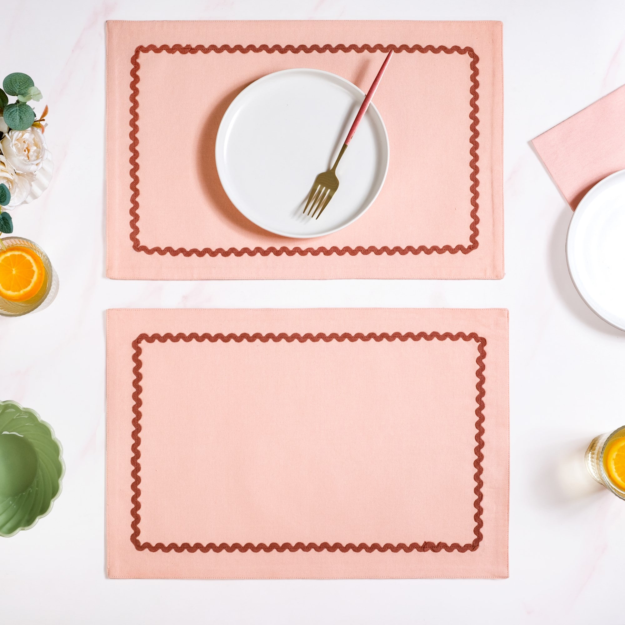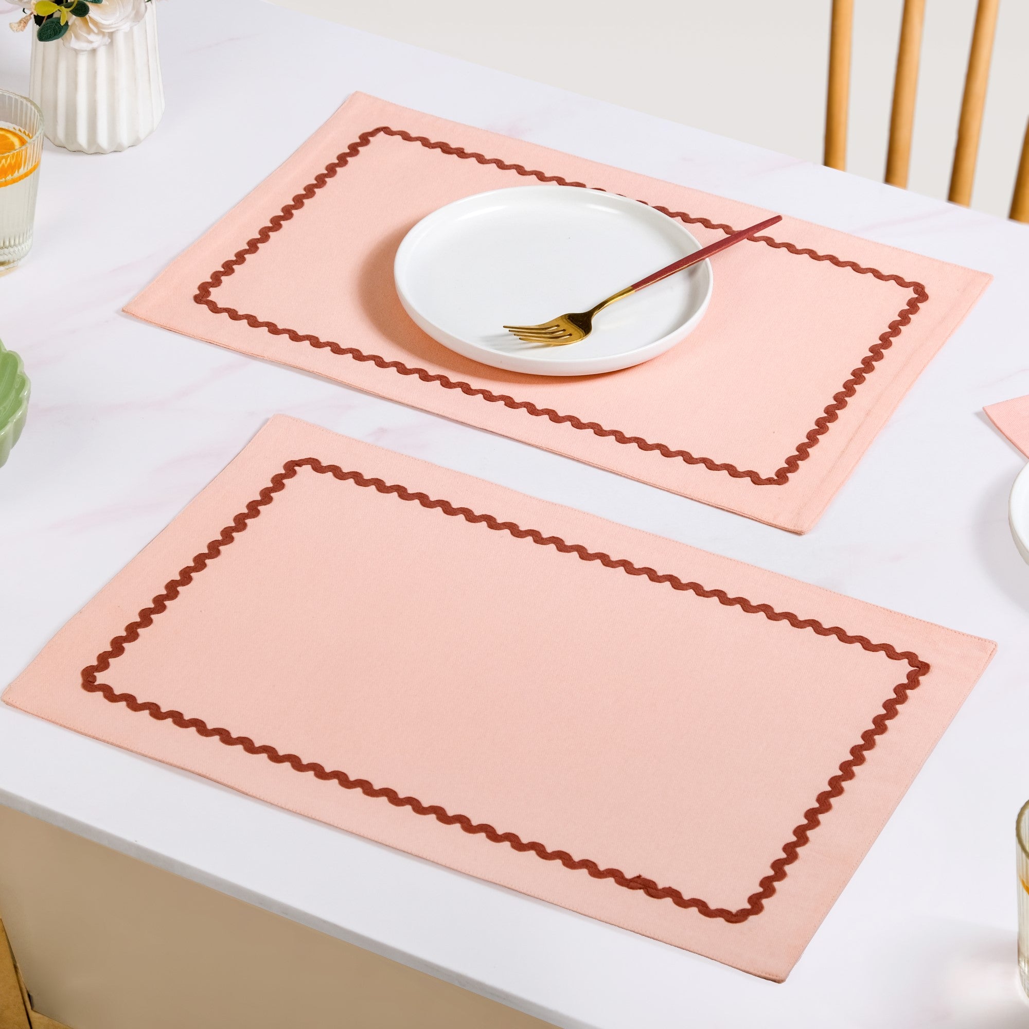 Design: This set of six placemats comes in a lovely peach colour, with a pretty maroon wavy border sewn around the edge. The simple stitching makes them look elegant and classy without being too much. These placemats feel nice and thick, adding a touch of luxury to your table. And, they're reversible too!