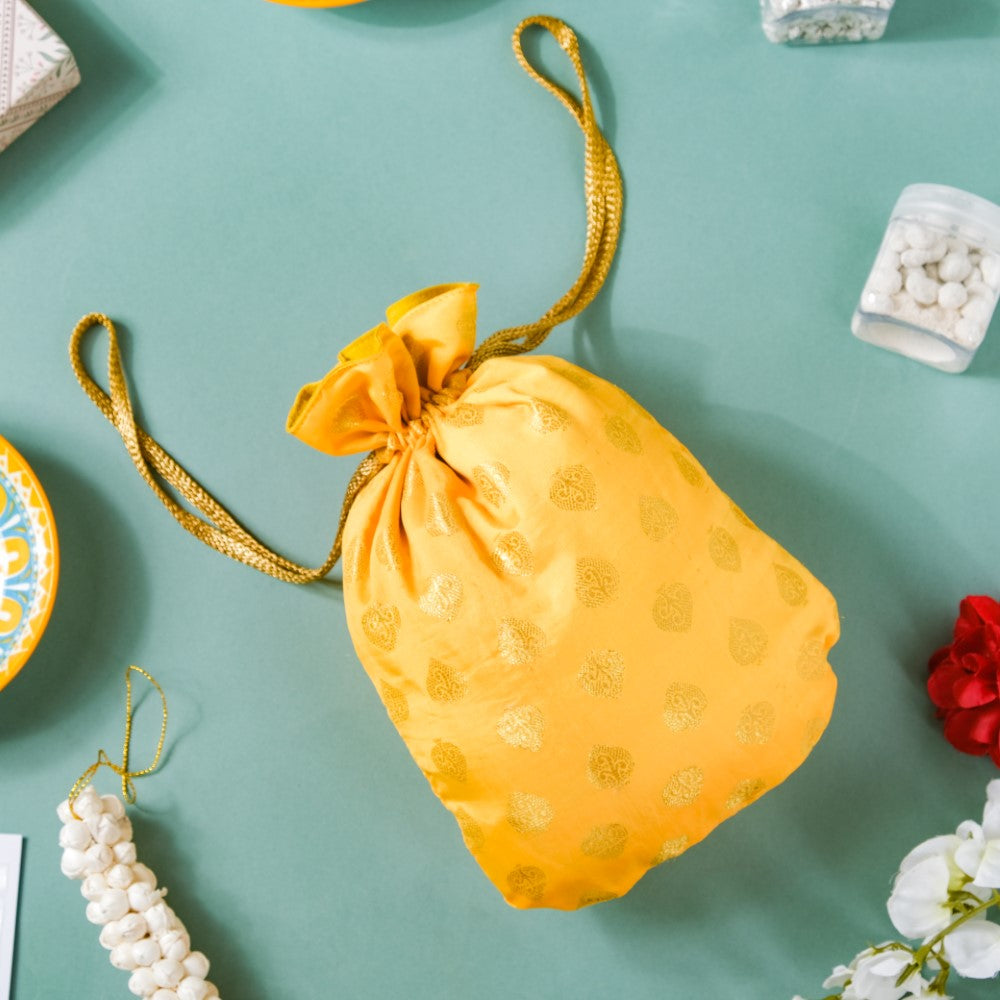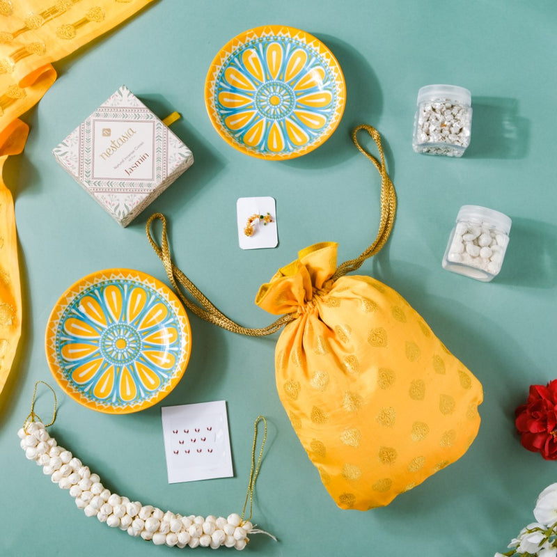 A traditional Maharashtrian wedding hamper for the guests and the bride's girlfriends to make them feel super excited for the Sangeet and Mehendi ceremonies, like they belong to the wedding as much as anyone else. Featuring 1 gorgeous Maharashtrian nose ring also called the Brahmi Nath or Peshwai Nath and mogra for the gajra, the wedding hamper celebrates the very essence of a traditional Marathi wedding with all its grandeur.