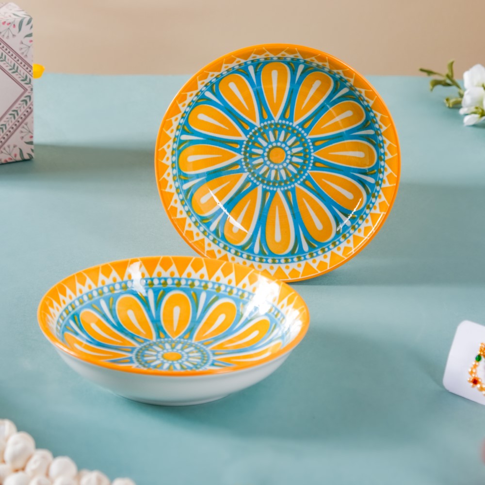 Nestip: The beautiful Mandala appetizer plates from the wedding hamper can be used to serve delicious snacks to the wedding guests.