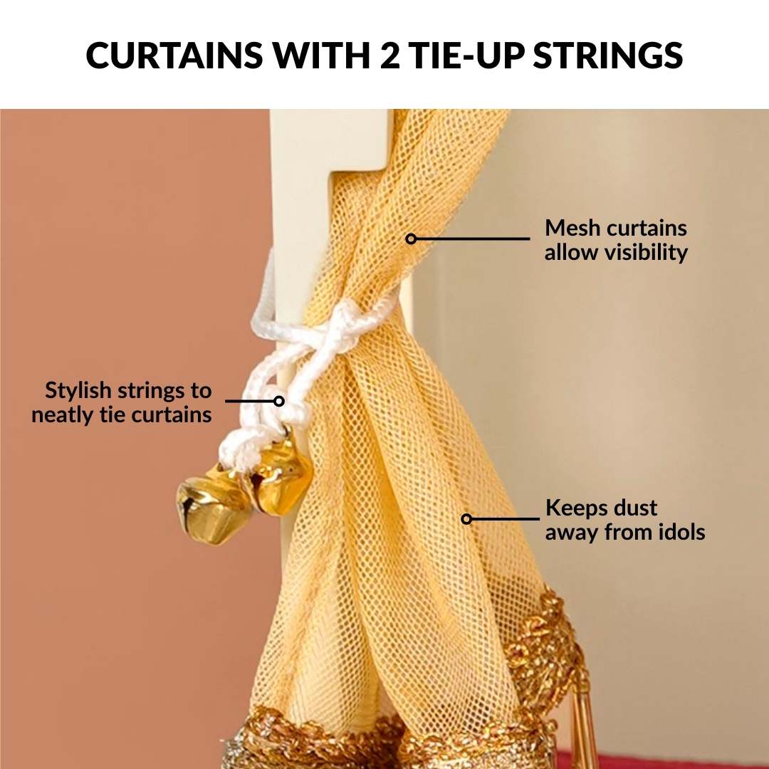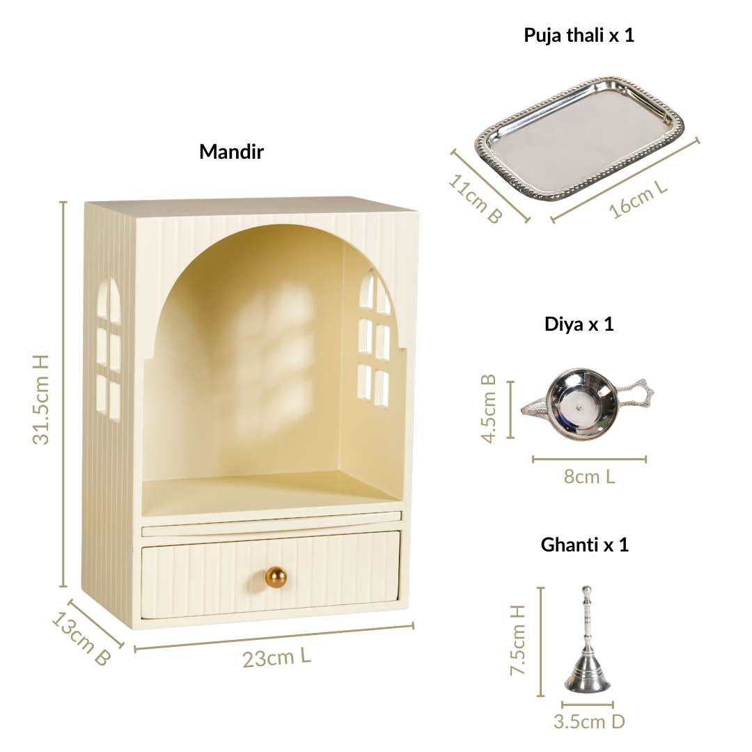 Design: This ivory coloured compact MDF mandir has a pull-out slab and lower storage drawer. The velvet aasan is finished with embellished gold lace borders. The silver-coated stainless steel puja thali also includes a pure brass ghanti, and the gold-toned curtains are made from mesh net and come with a metal spring and two tie-up strings.