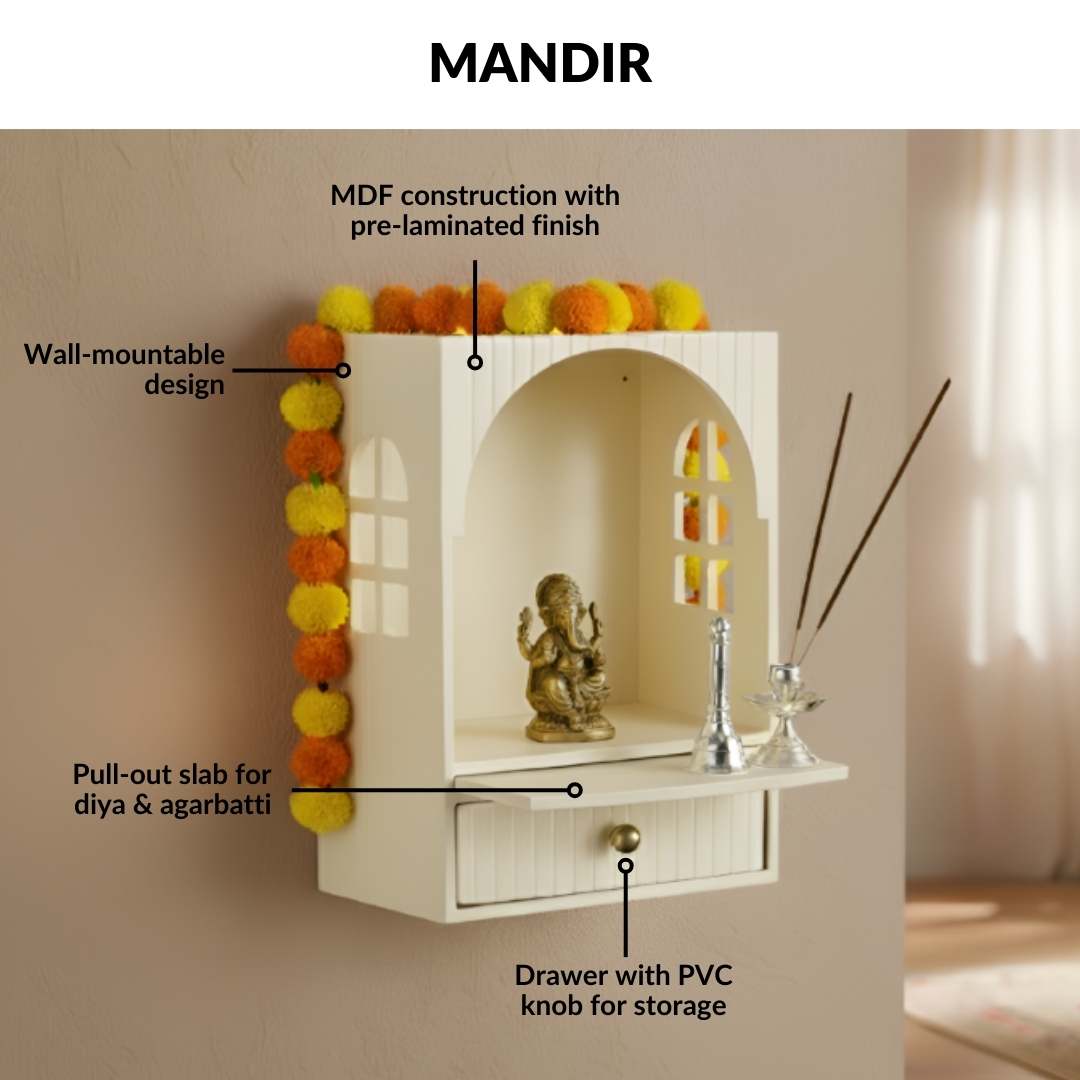 Benefits: The compact mandir can be easily wall-mounted, while its lower drawer makes storage easy. The dedicated pull-out slab is designed for diyas and agarbattis. The stainless steel puja thali is perfect for holding flowers and prasad. The velvet aasan provides a padded resting place for idols, while the mandir curtain prevents dust from the deity. The pure brass ghanti has a resonant sound, and the stable diya ensures easy aarti.