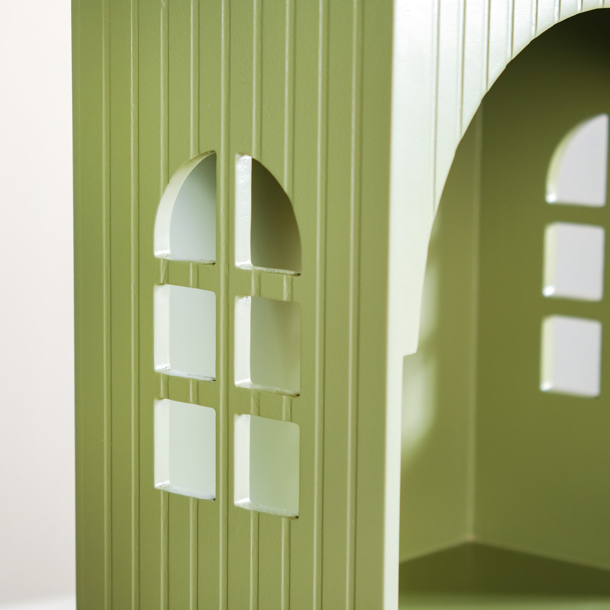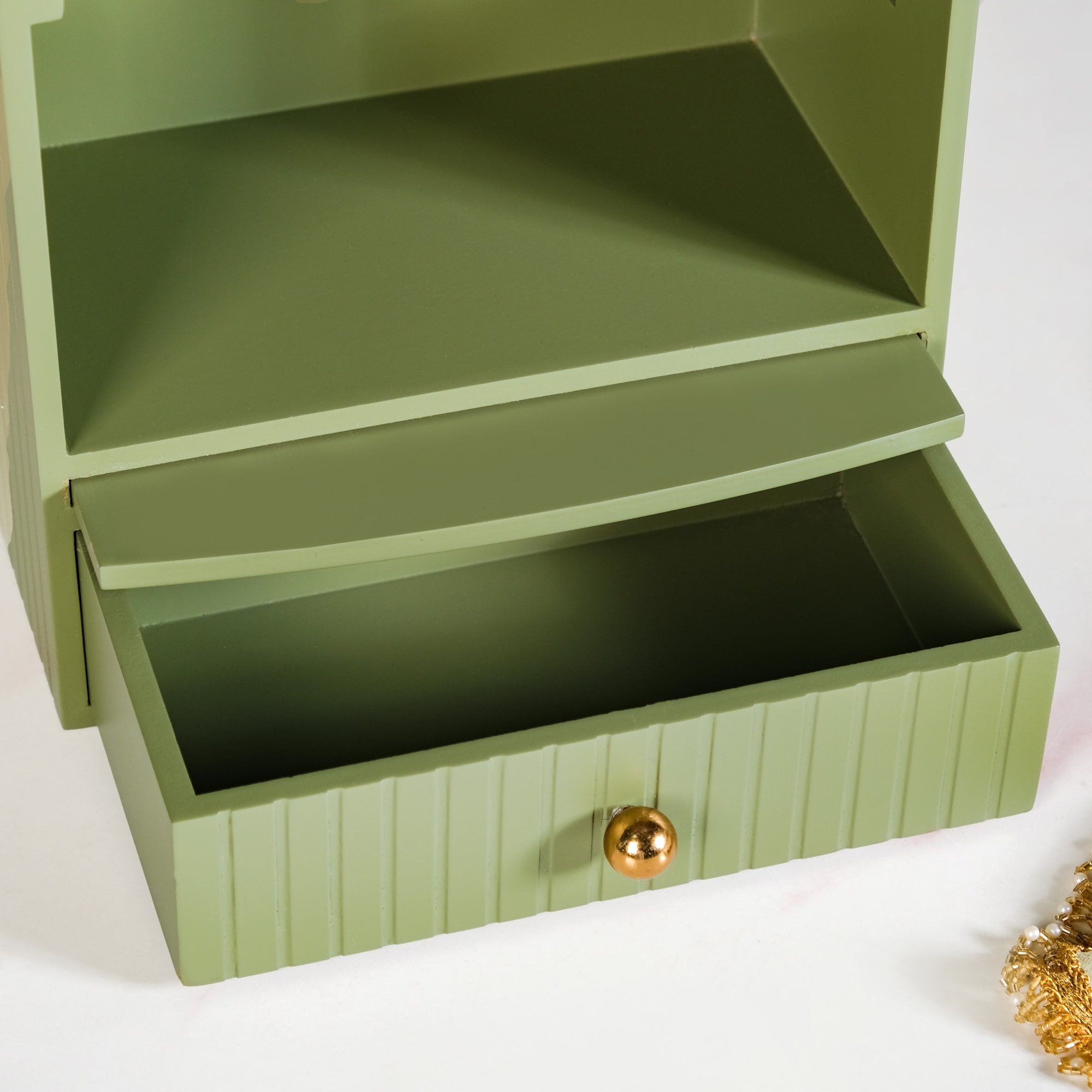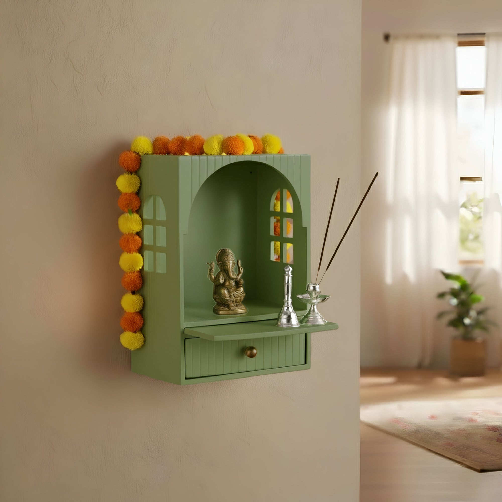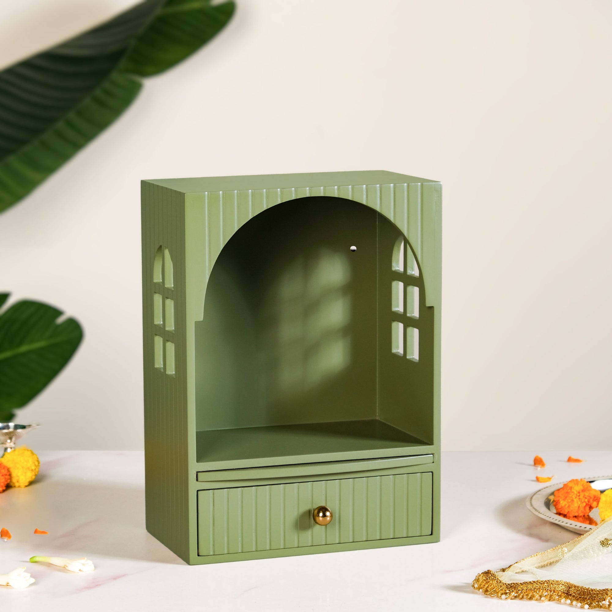 Design: This MDF home temple features a compact rectangular form with an arched front and detailed side cut-outs for light and ventilation. The green finish gives it a refreshing and modern look while retaining a traditional feel. It includes a spacious open section for idols, diyas, and small accessories, along with a pull-out drawer for incense sticks and prayer items. The sturdy base ensures balance, and its lightweight build allows easy repositioning. Two holes on the back ensure that the mandir can also be wall-mounted.