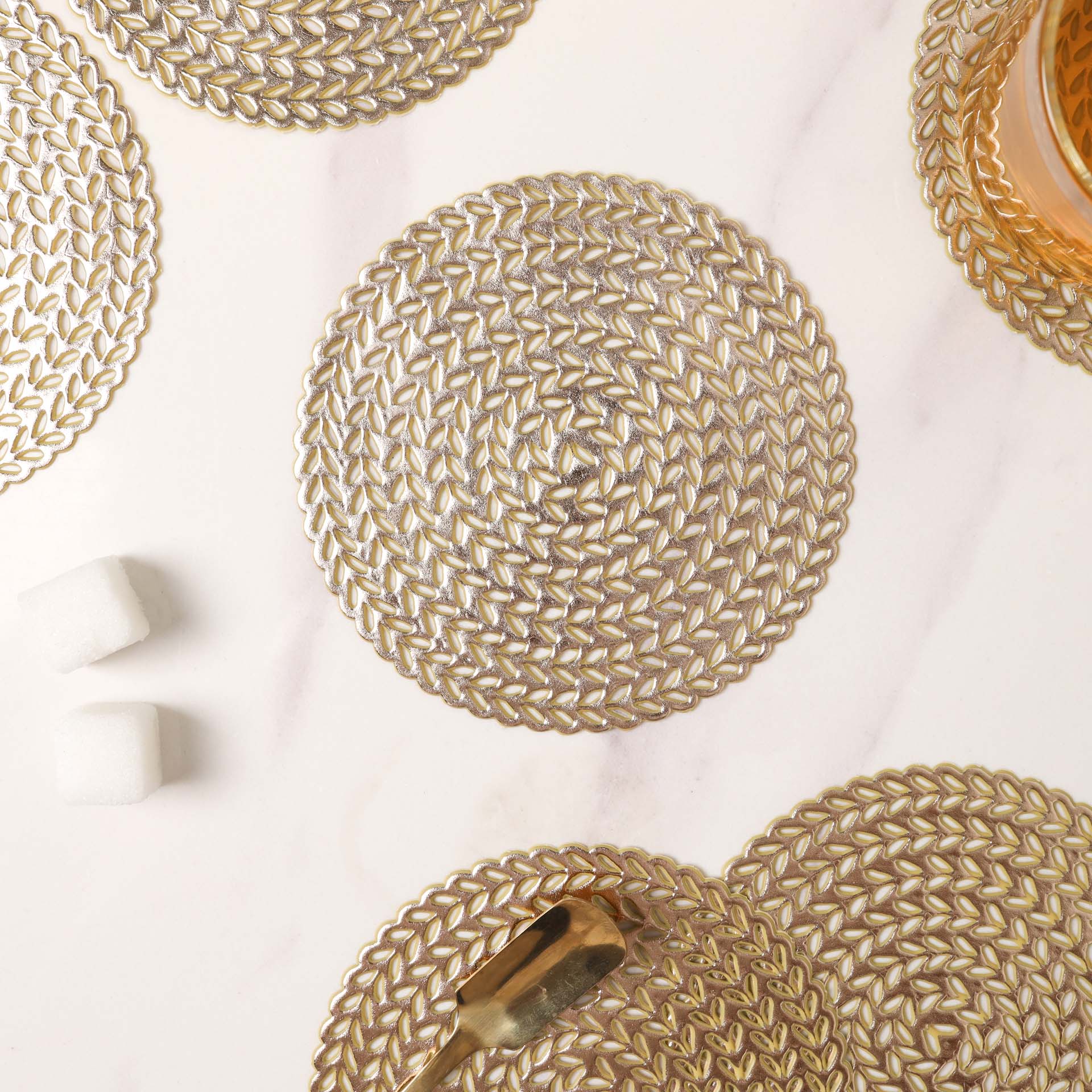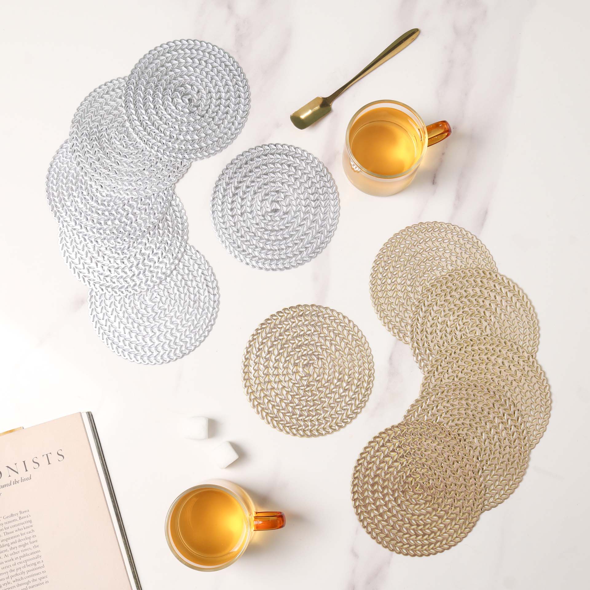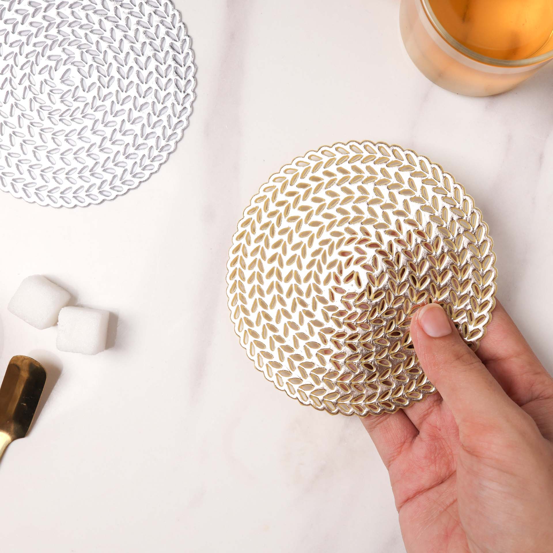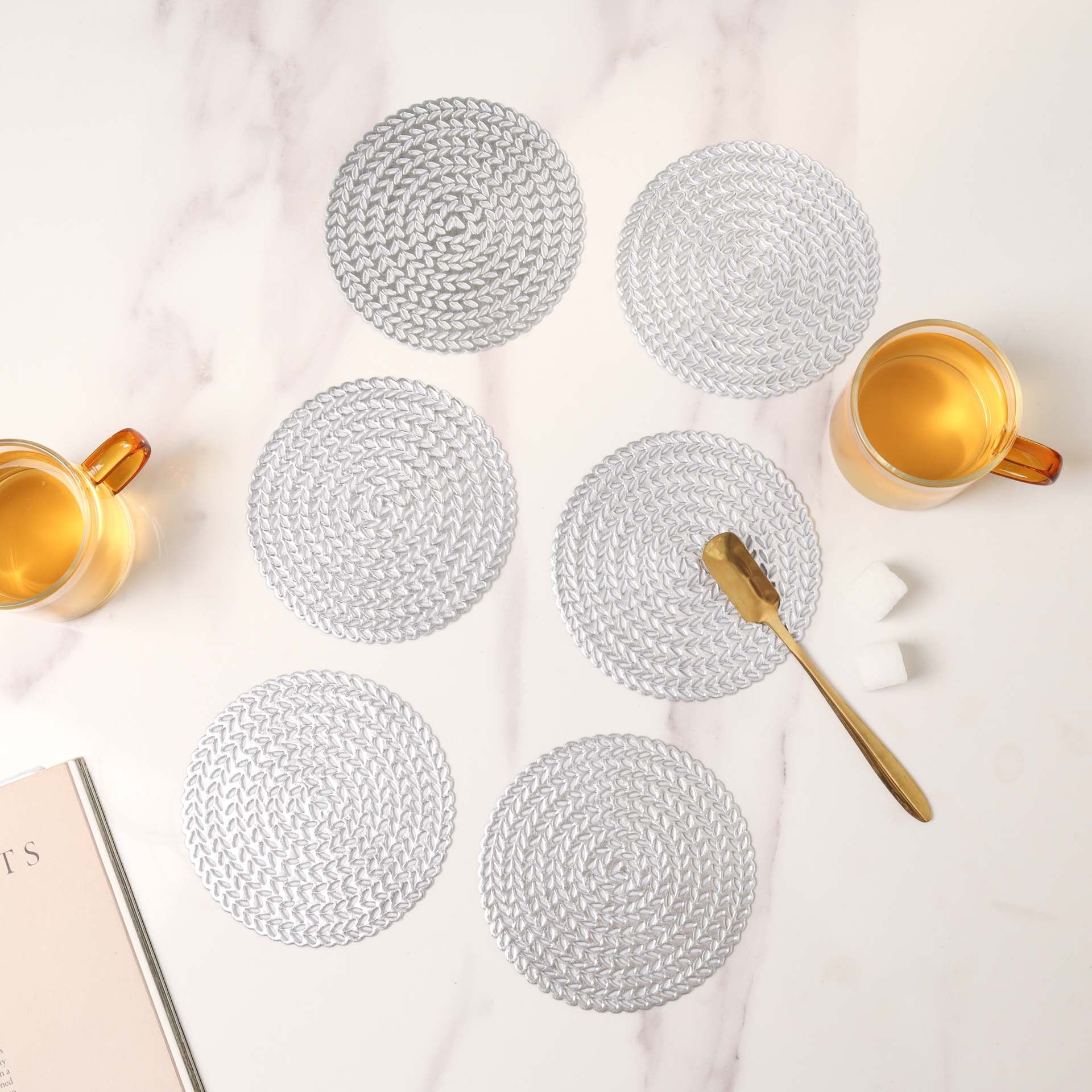 The set of coasters are highly durable and extremely elegant. Even though they are great to use on a daily basis, one would be tempted to save them for special occasions too. The coasters are made from the best quality raw materials, ensuring longevity and unrivaled elegance. The coasters will keep the table looking new and wonderful even after years of usage by protecting it from extreme temperatures. The coasters are non-slip and serve to create an unusual impression on the table. Nestip: Use the coasters to place tea cups. Size: 10 cm diameter Color: Silver, gold Material: PVC Products included: 1 set of 6 coasters of the same color and design Style: Silver- GSM94A47 Gold- GSM94A48