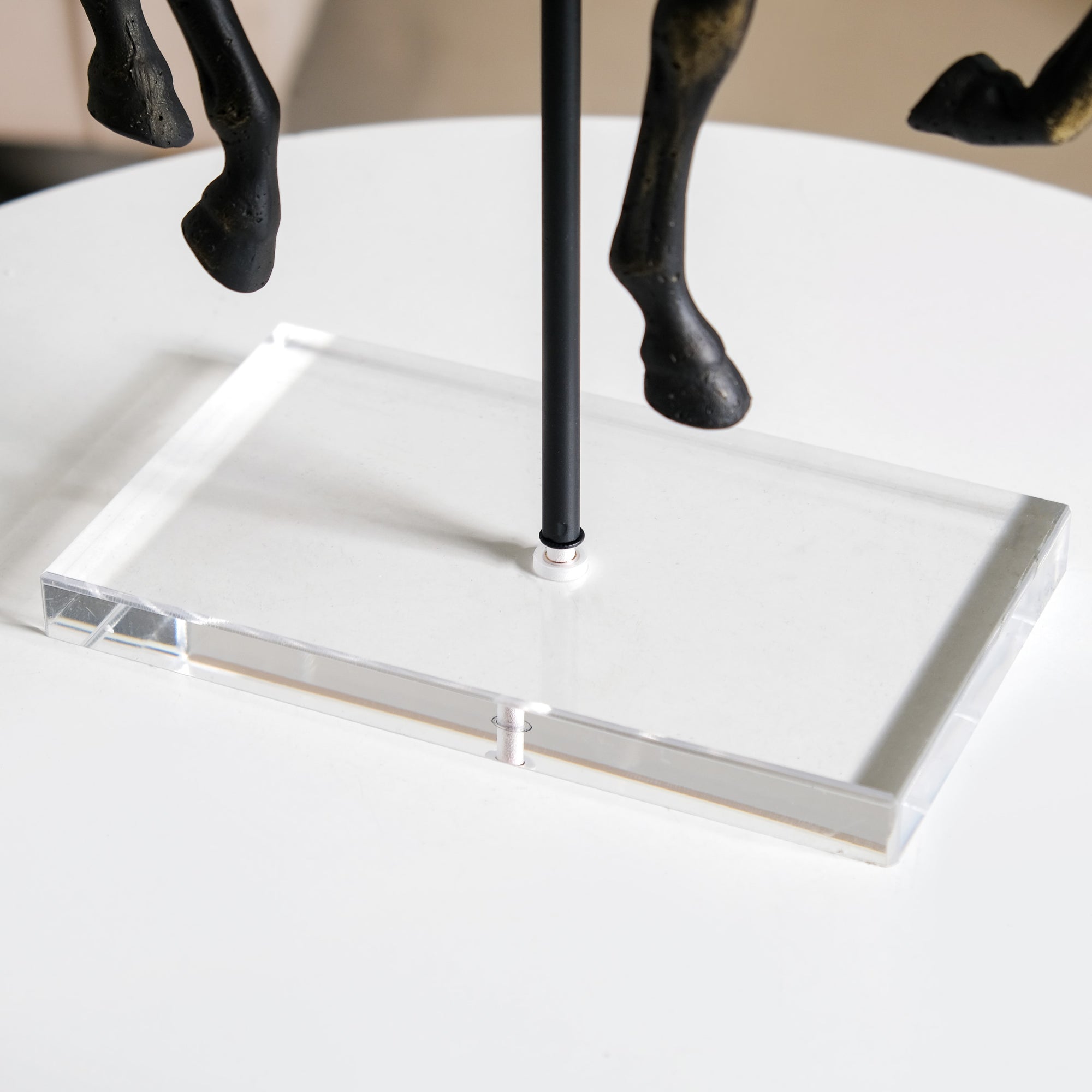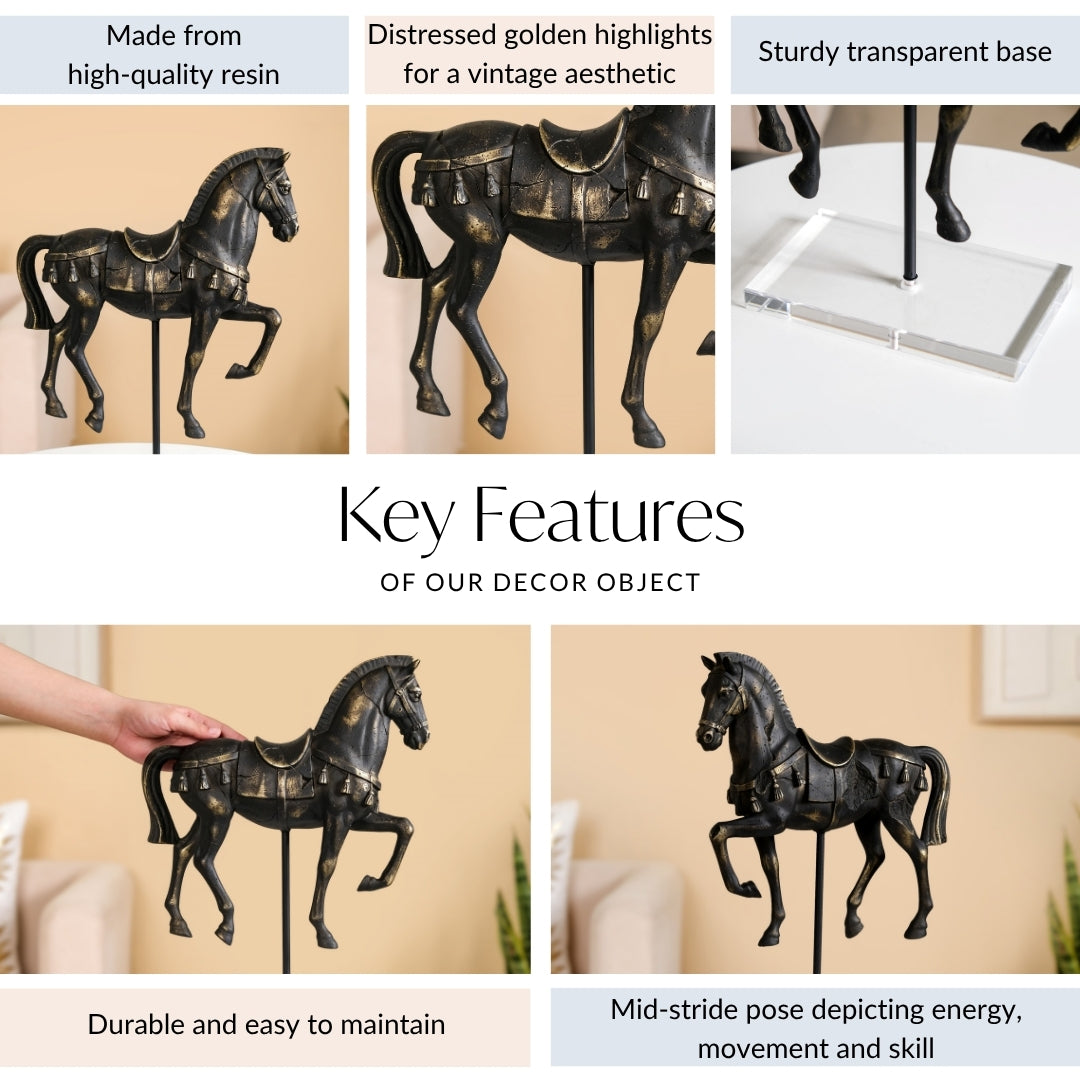 Design: This exquisite horse figurine showcases a majestic stallion crafted in black resin with a distressed, antique gold finish that highlights its regal contours. The horse is elegantly posed mid-stride, exuding grace and motion. Adorned with an intricately detailed saddle and harness, it rests on a sleek black stand attached to a transparent resin base, blending classic artistry with a modern display aesthetic.